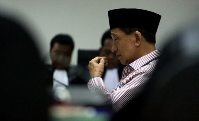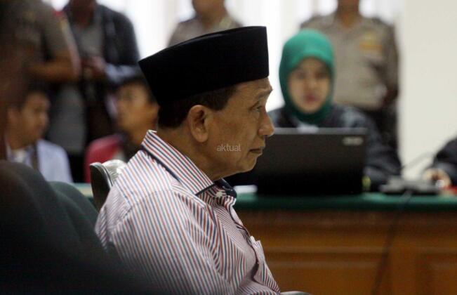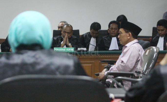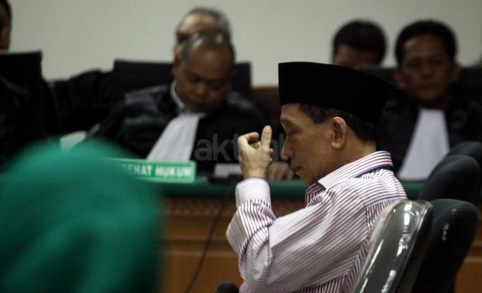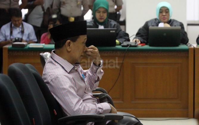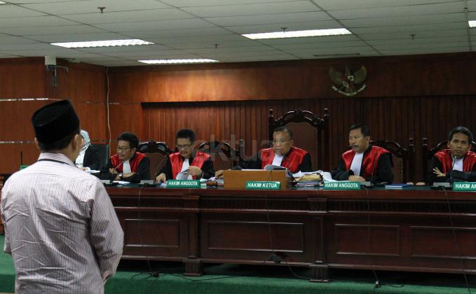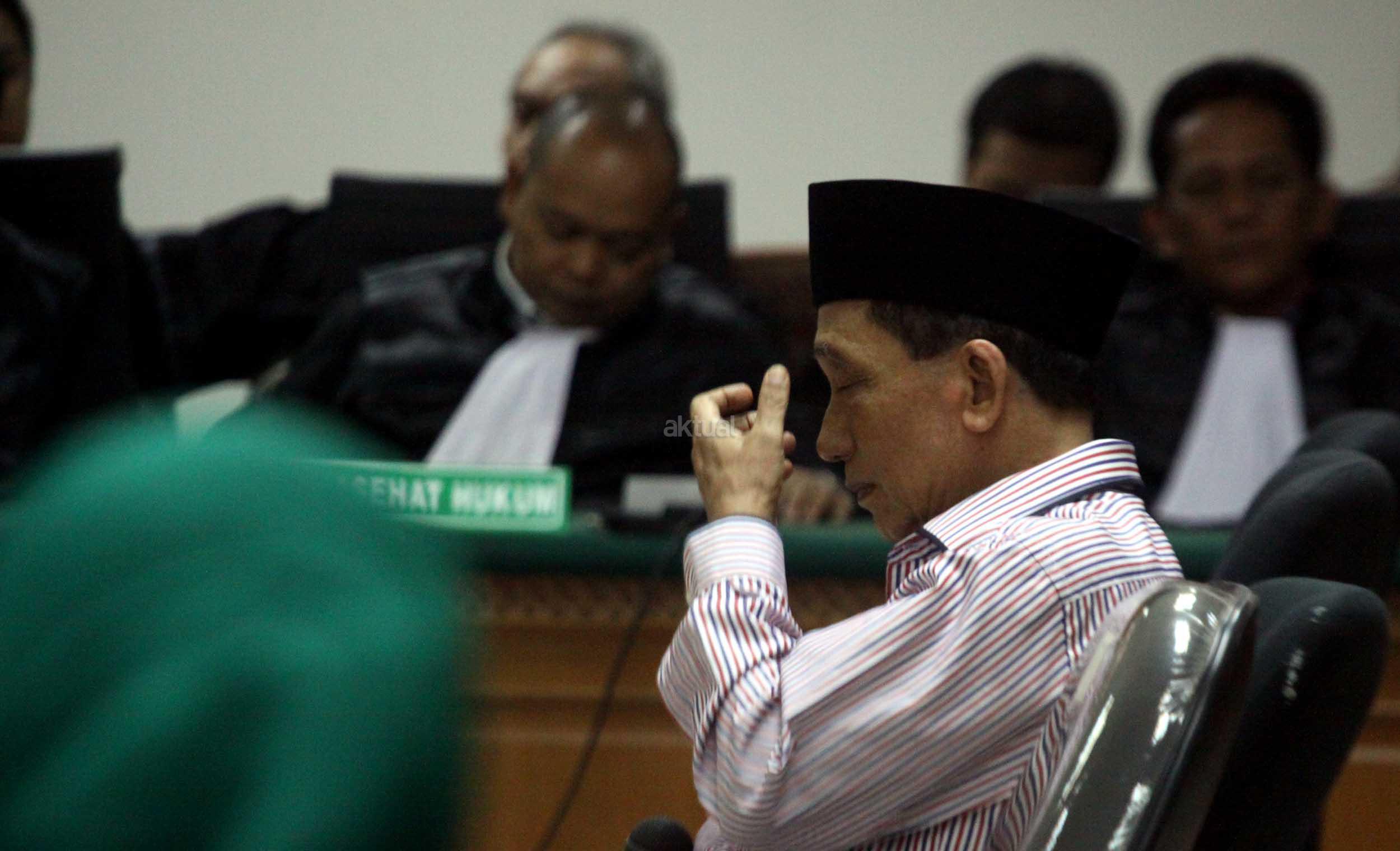 Terdakwa mantan Bupati Bangkalan Fuad Amin Imron saat menjalani dan mendengarkan sidang pembacaan putusan di Pengadilan Tipikor, Jakarta, Senin (19/10/2015). Majelis hakim yang diketuai M. Muchlis memvonis Fuad Amin 8 tahun penjara dan denda Rp1miliar subsider enam bulan karena terbukti menerima suap terkait jual beli gas alam di Bangkalan, Madura dari PT Media Karya Sentosa, serta melakukan Tindak Pidana Pencucian Uang.