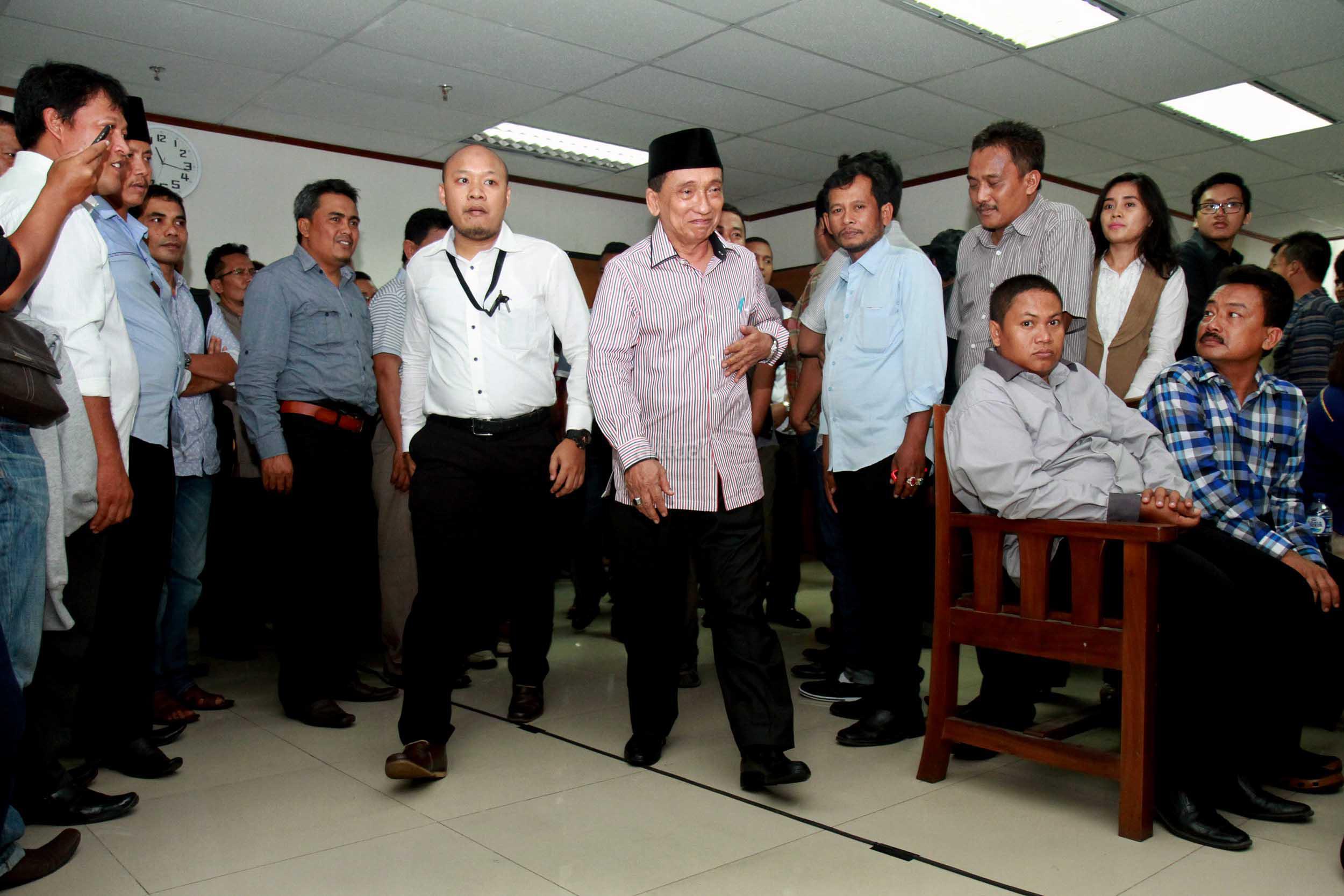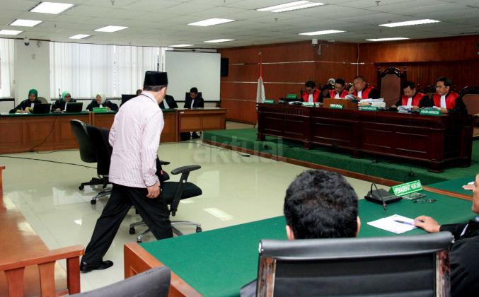 Terdakwa mantan Bupati Bangkalan Fuad Amin Imron berjalan ruang sidang untuk menjalani sidang pembacaan putusan di Pengadilan Tipikor, Jakarta, Senin (19/10/2015). Majelis hakim yang diketuai M. Muchlis memvonis Fuad Amin 8 tahun penjara dan denda Rp1miliar subsider enam bulan karena terbukti menerima suap terkait jual beli gas alam di Bangkalan, Madura dari PT Media Karya Sentosa, serta melakukan Tindak Pidana Pencucian Uang.