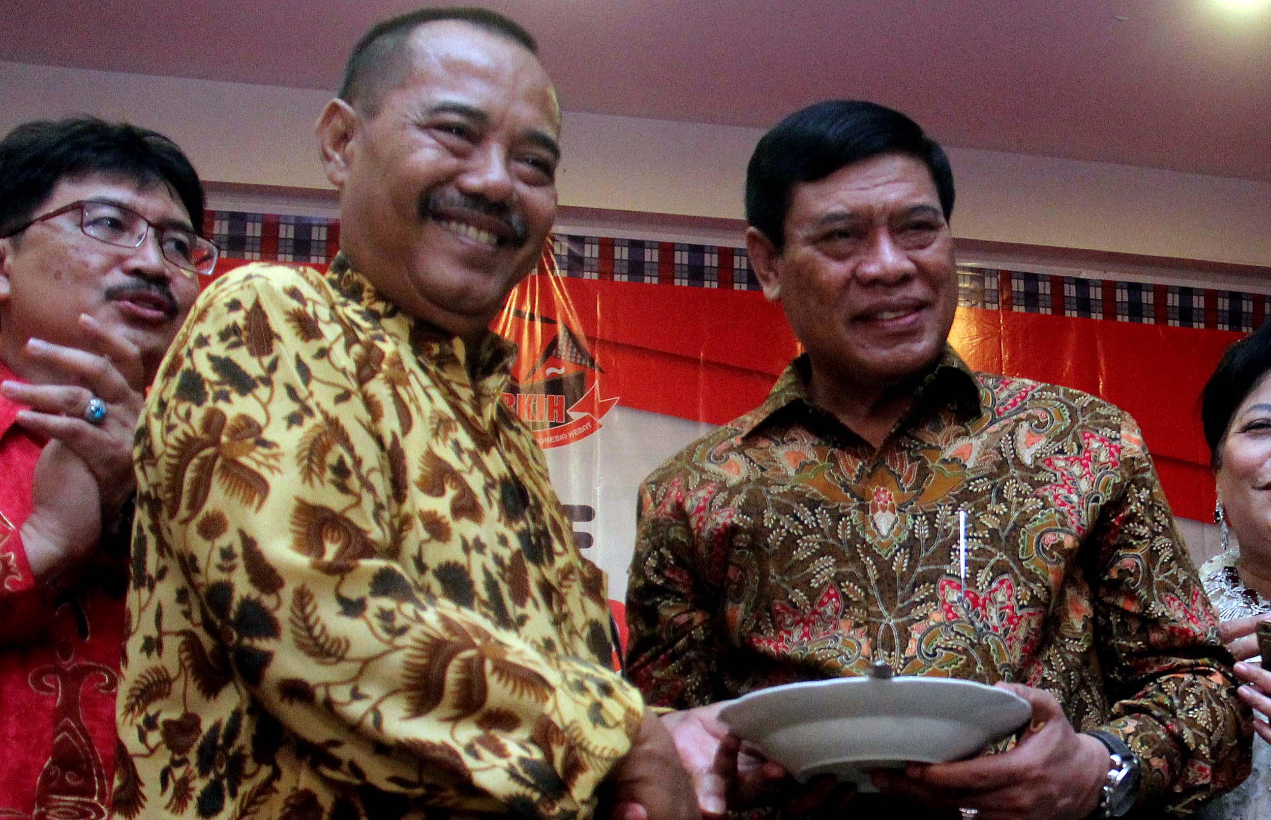 Ketua Umum Rumah Kreasi Indonesia Hebat (RKIH), Kris Budiharjo (kiri) memberikan tumpeng kepada Mantan Menko Polhukam yang juga Dewan Pembina Rumah Kreasi Indonesia Hebat (RKIH) Tedjo Edhi Purdijatno (kanan) saat acara HUT ke 2 Rumah Kreasi Indonesia Hebat di Jakarta, Jumat (12/8/2016). HUT ke 2 RKIH tersebut mengambil tema ‘Bergerak Bersama Membangun Bangsa Melawan Narkoba dengan Budaya.’