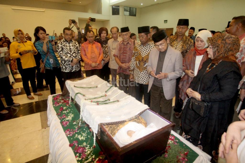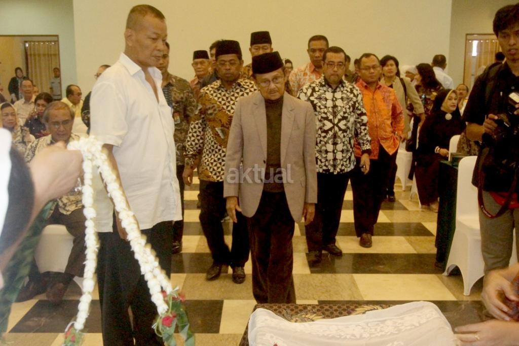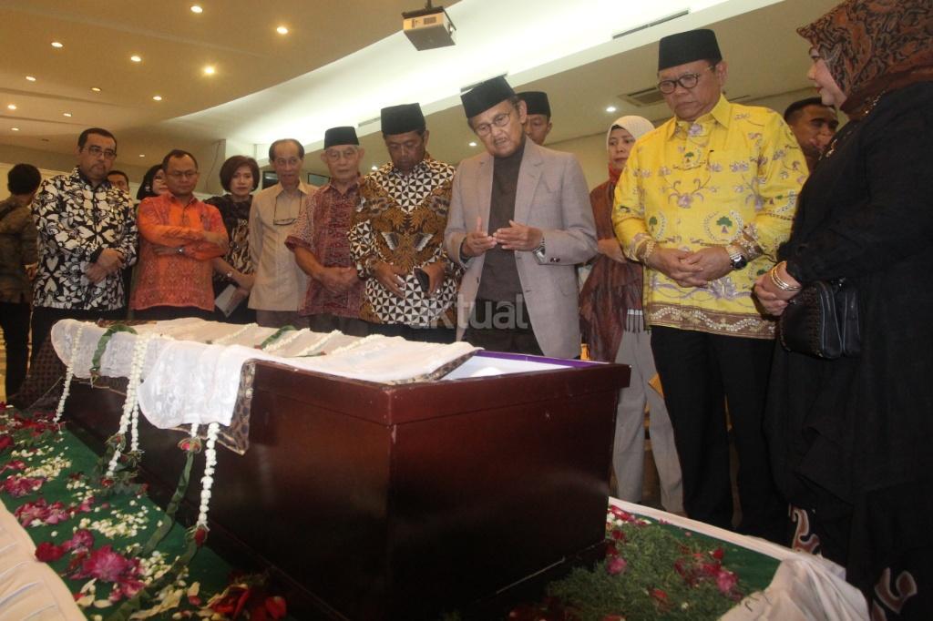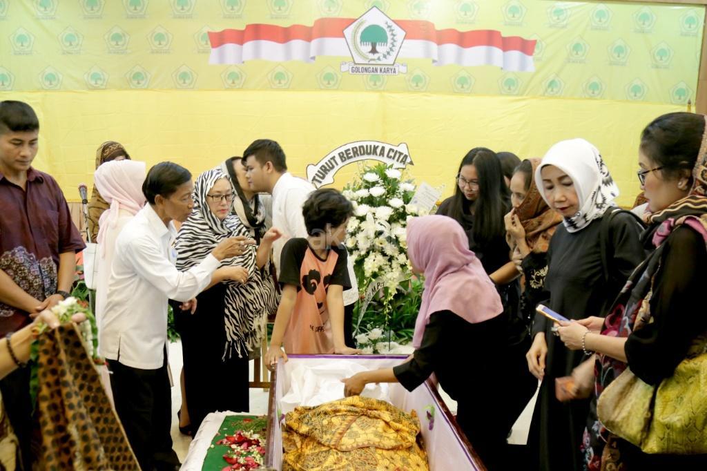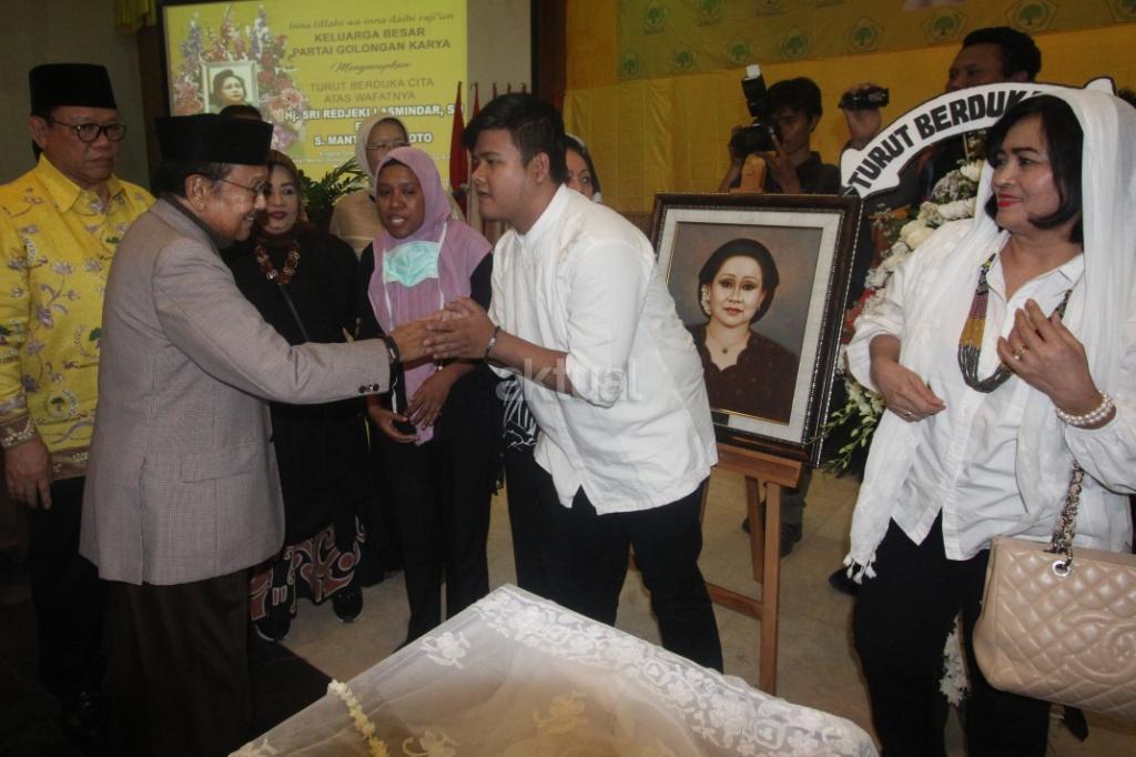 Presiden Republik Indonesia ke-3 Baharuddin Jusuf Habibie didampingi jajaran petinggi Partai Golkar, saat melayat Jenazah sesepuh Partai Golkar yang juga mantan Menteri Pemberdayaan Perempuan Sri Redjeki di DPP Partai Golkar, Slipi, Jakarta, Kamis (2/11). Sri Redjeki meninggal karena penyakit diabetes dan gangguan ginjal. Sebelum meninggal di Rumah Sakit Pelni, Jakarta Barat, Sri Redjeki sempat menjalani perawatan beberapa hari. Jenazah akan dimakamkan di kompleks pemakaman keluarga di Solo, Jawa Tengah. AKTUAL/Tino Oktaviano