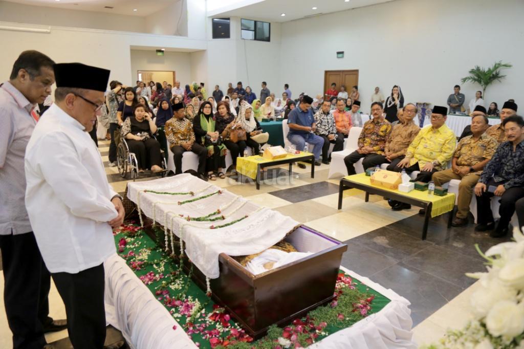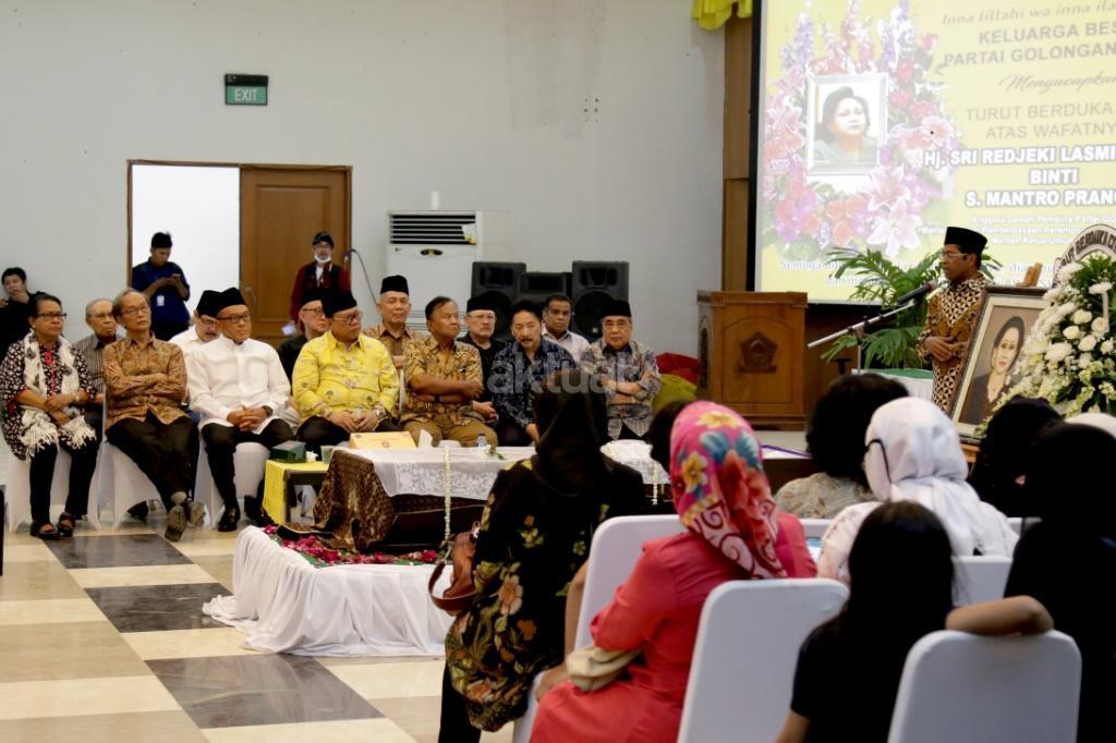 Jajaran petinggi Partai Golkar, diantaranya Aburizal Bakrie, Agung Laksono, Ginanjar Kartasasmita, Idrus Marham saat melayat Jenazah sesepuh Partai Golkar yang juga mantan Menteri Pemberdayaan Perempuan Sri Rejeki di DPP Partai Golkar, Slipi, Jakarta, Kamis (2/11). Sri Redjeki meninggal karena penyakit diabetes dan gangguan ginjal. Sebelum meninggal di Rumah Sakit Pelni, Jakarta Barat, Sri Redjeki sempat menjalani perawatan beberapa hari. Jenazah akan dimakamkan di kompleks pemakaman keluarga di Solo, Jawa Tengah. AKTUAL/Tino Oktaviano