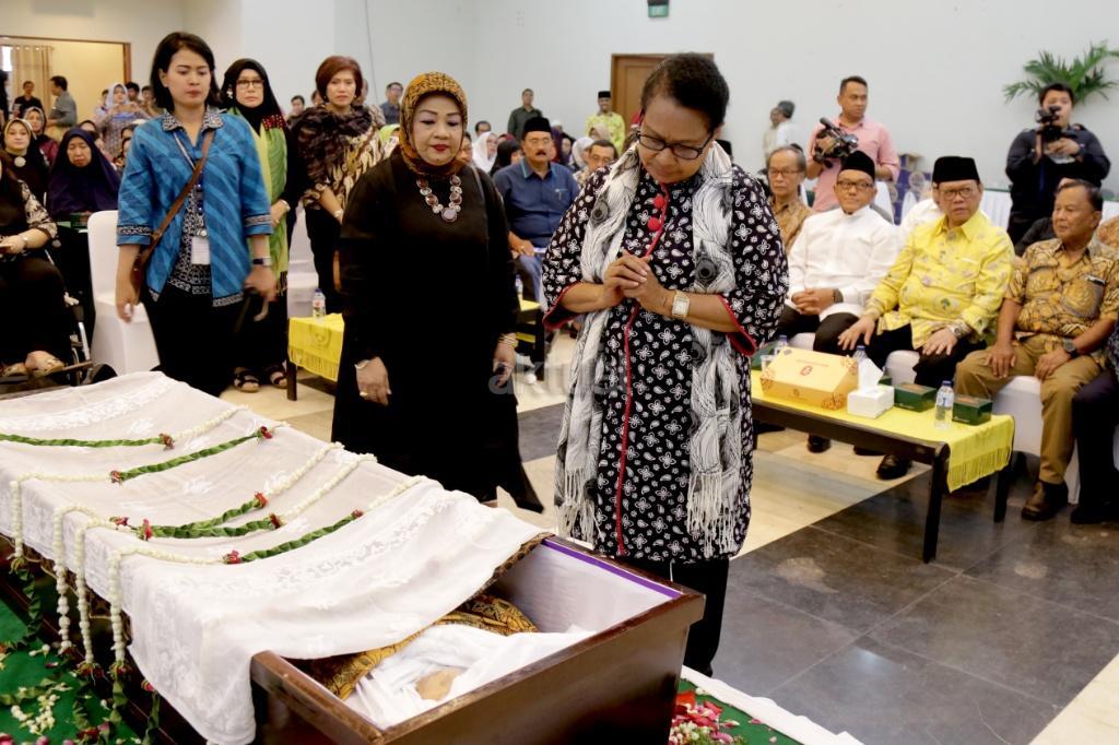 Menteri Pemberdayaan Perempuan dan Perlindungan Anak Yohana Yembise berdoa didepan Jenazah sesepuh Partai Golkar yang juga mantan Menteri Pemberdayaan Perempuan Sri Redjeki di DPP Partai Golkar, Slipi, Jakarta, Kamis (2/11). Sri Redjeki meninggal karena penyakit diabetes dan gangguan ginjal. Sebelum meninggal di Rumah Sakit Pelni, Jakarta Barat, Sri Redjeki sempat menjalani perawatan beberapa hari. Jenazah akan dimakamkan di kompleks pemakaman keluarga di Solo, Jawa Tengah. AKTUAL/Tino Oktaviano