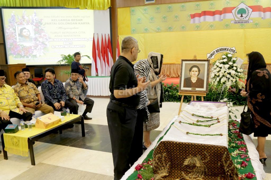 Kerabat dan keluarga berdoa didepan Jenazah sesepuh Partai Golkar yang juga mantan Menteri Pemberdayaan Perempuan Sri Redjeki di DPP Partai Golkar, Slipi, Jakarta, Kamis (2/11). Sri Redjeki meninggal karena penyakit diabetes dan gangguan ginjal. Sebelum meninggal di Rumah Sakit Pelni, Jakarta Barat, Sri Redjeki sempat menjalani perawatan beberapa hari. Jenazah akan dimakamkan di kompleks pemakaman keluarga di Solo, Jawa Tengah. AKTUAL/Tino Oktaviano