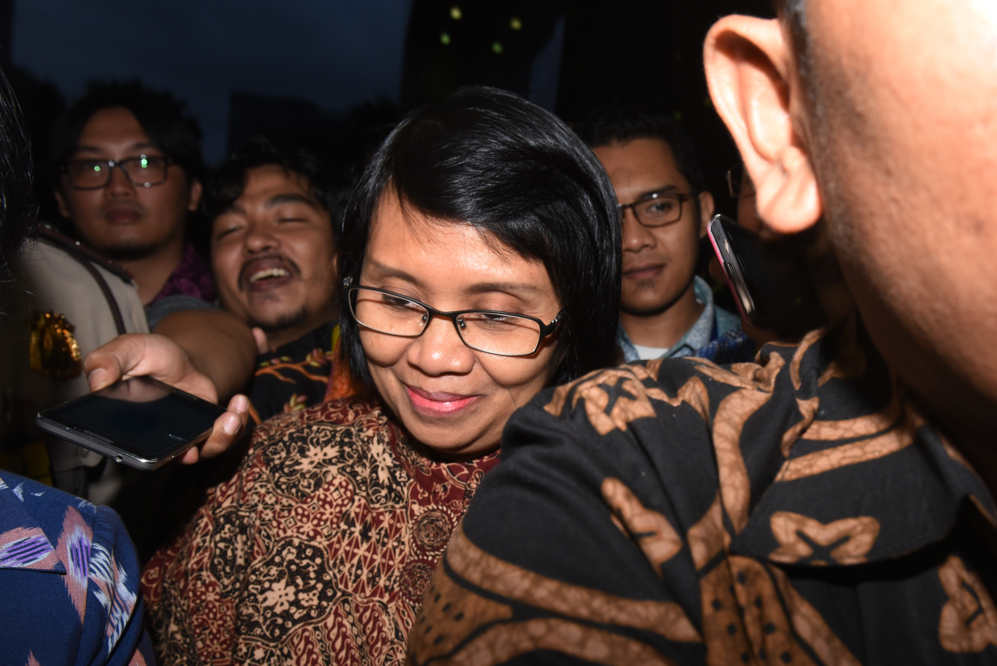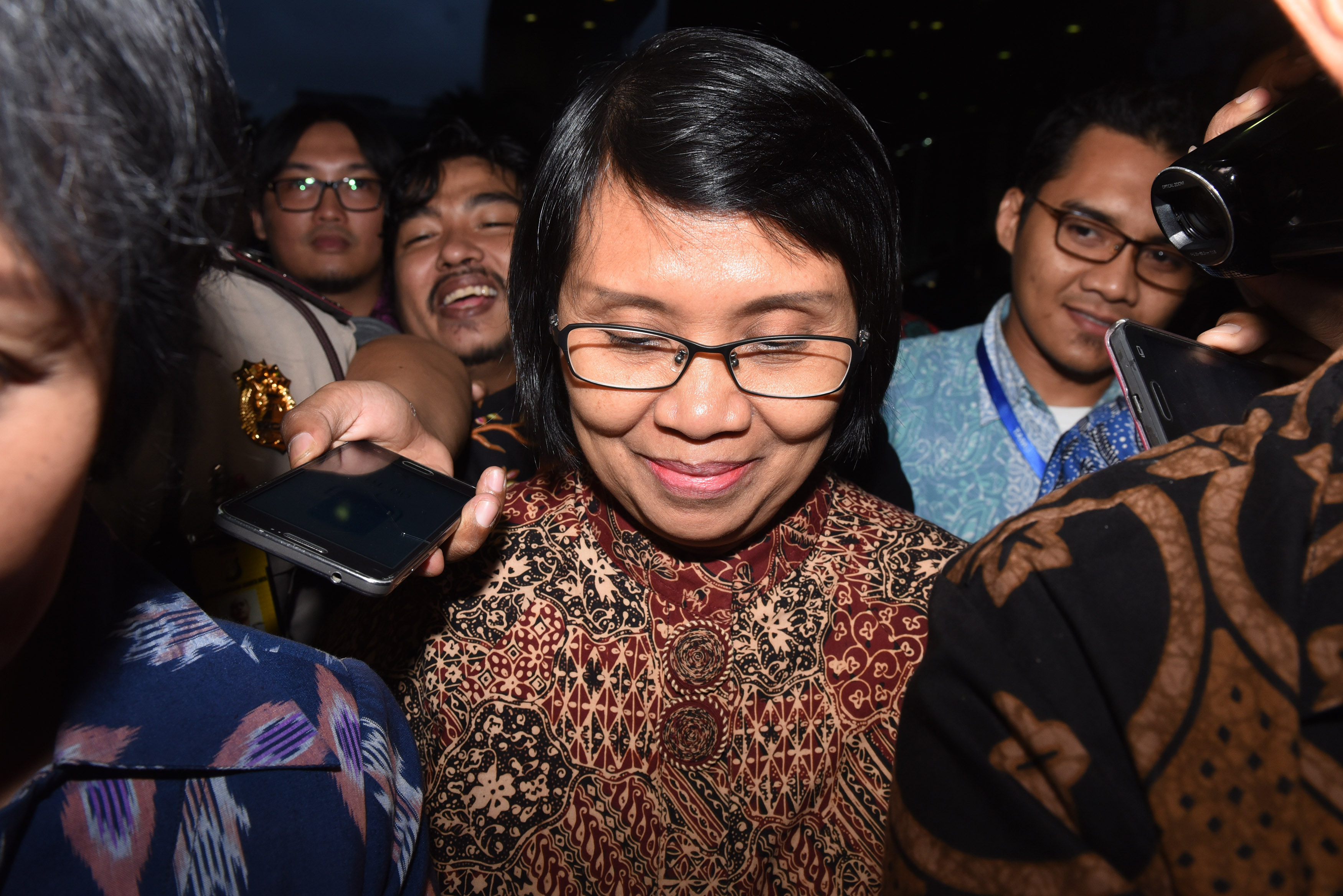 Mantan Wakil Menteri Keuangan Anny Ratnawati dicecar pertanyaan oleh wartawan seusai diperiksa di Gedung KPK, Jakarta, Selasa (26/4). Anny diperiksa KPK sebagai saksi pada kasus korupsi proyek pengadaan paket e-KTP di kementerian dalam negeri tahun anggaran 2011-2012 dengan tersangka mantan Direktur Pengelola Informasi Administrasi Kependudukan Direktorat Jenderal Kependudukan dan Pencatatan Sipil Kementerian Dalam Negeri, Sugiharto ANTARA FOTO/Hafidz Mubarak A./ama/16