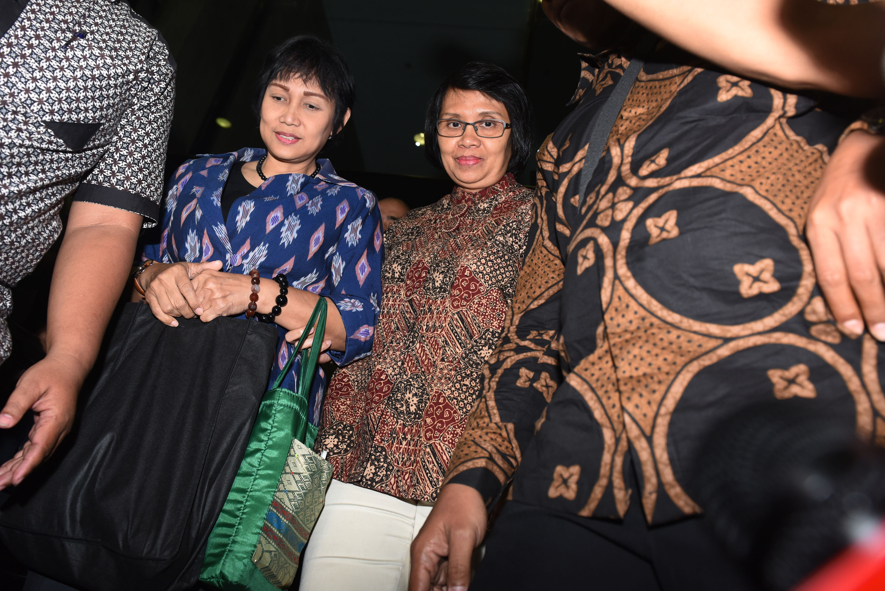 Mantan Wakil Menteri Keuangan Anny Ratnawati (kanan) meninggalkan Gedung KPK seusai diperiksa di Jakarta, Selasa (26/4). Anny diperiksa KPK sebagai saksi pada kasus korupsi proyek pengadaan paket e-KTP di kementerian dalam negeri tahun anggaran 2011-2012 dengan tersangka mantan Direktur Pengelola Informasi Administrasi Kependudukan Direktorat Jenderal Kependudukan dan Pencatatan Sipil Kementerian Dalam Negeri, Sugiharto ANTARA FOTO/Hafidz Mubarak A./ama/16