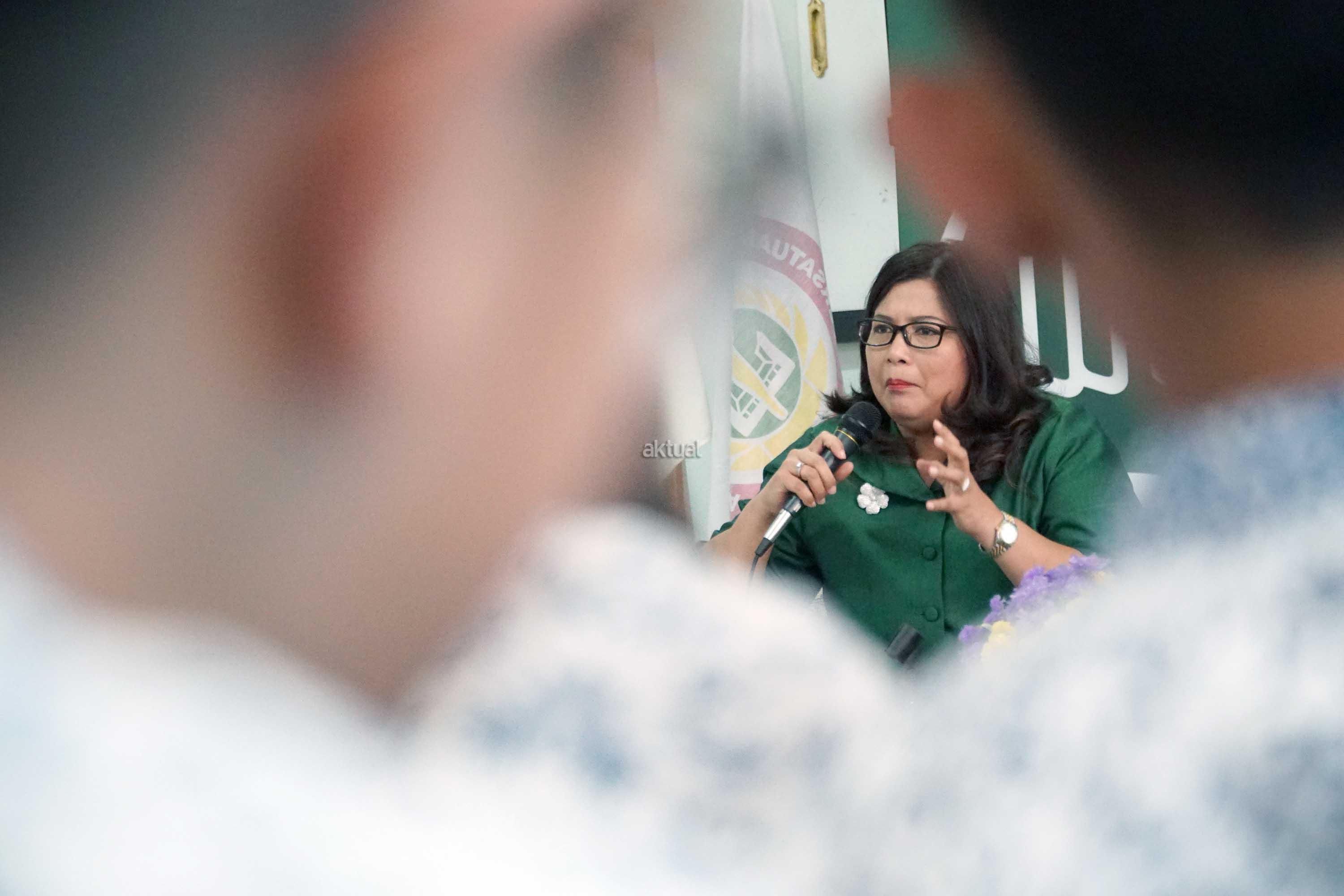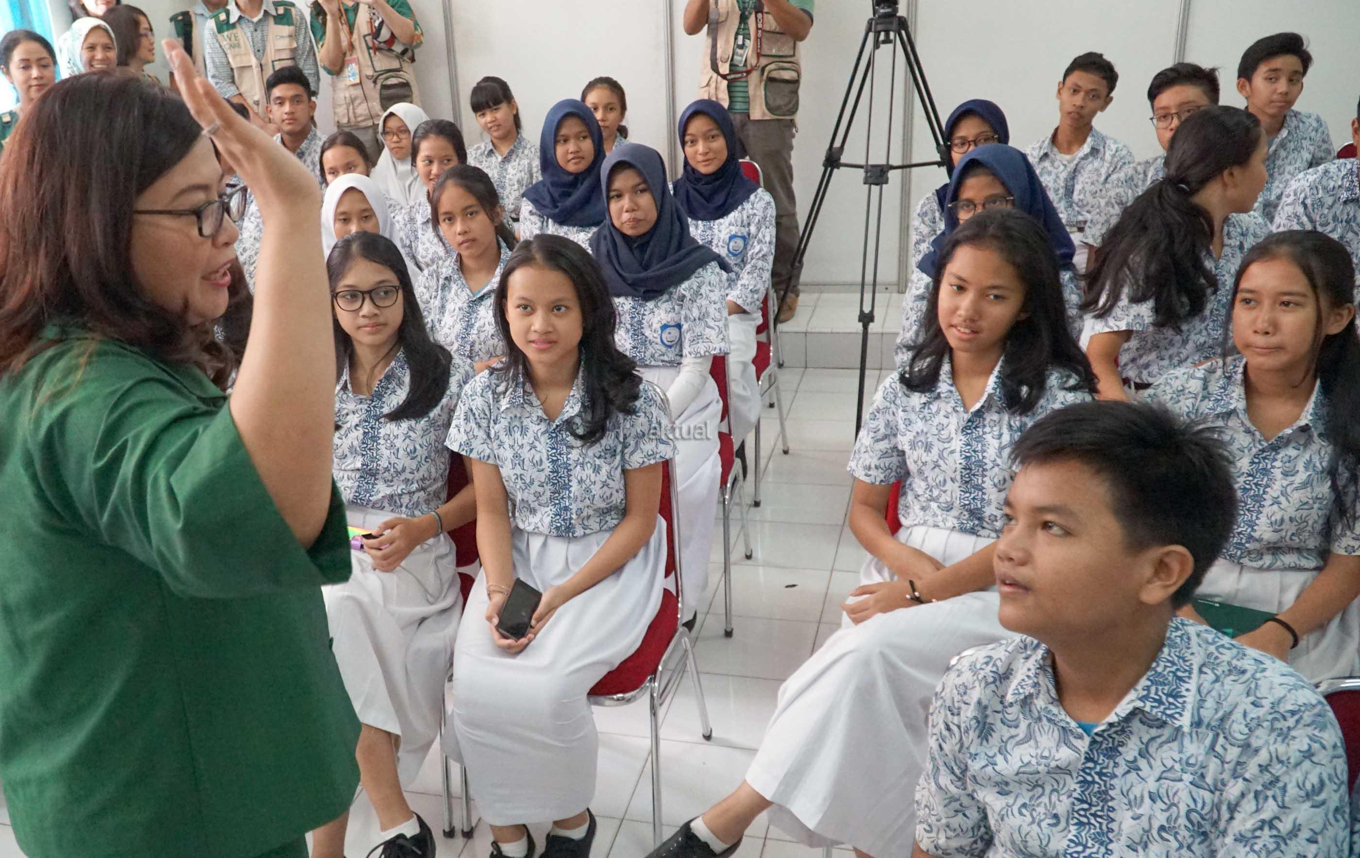 Direktur & Chief Marketing Officer Manulife Indonesia, Novita Rumngangun menyampaikan materi di depan para siswa/i SMPN 11 saat kegiatan edukasi literasi keuangan melalui CSR Zoning, di Jakarta,Kamis (3/8). CSR Zoning merupakan salah satu upaya Manulife untuk memperkuat pendidikan literasi keuangan di Indonesia.Kegiatan ini memberikan kesempatan kepada karyawan dan agen untuk menominasikan sekolah atau komunitas yang dekat dengan tempat tinggal mereka.Melalui program tersebut, karyawan dan agen didorong untuk terlibat secara sukarela memajukan dan berkontribusi terhadap komunitas di lingkungan mereka sehingga komunitas tersebut dapat menjadi andalan keluarga.CSR Zoning akan dilakukan secara berkala dan berkesinambungan di area area lainnya di wilayah Jabodetabek. AKTUAL/Eko S Hilman