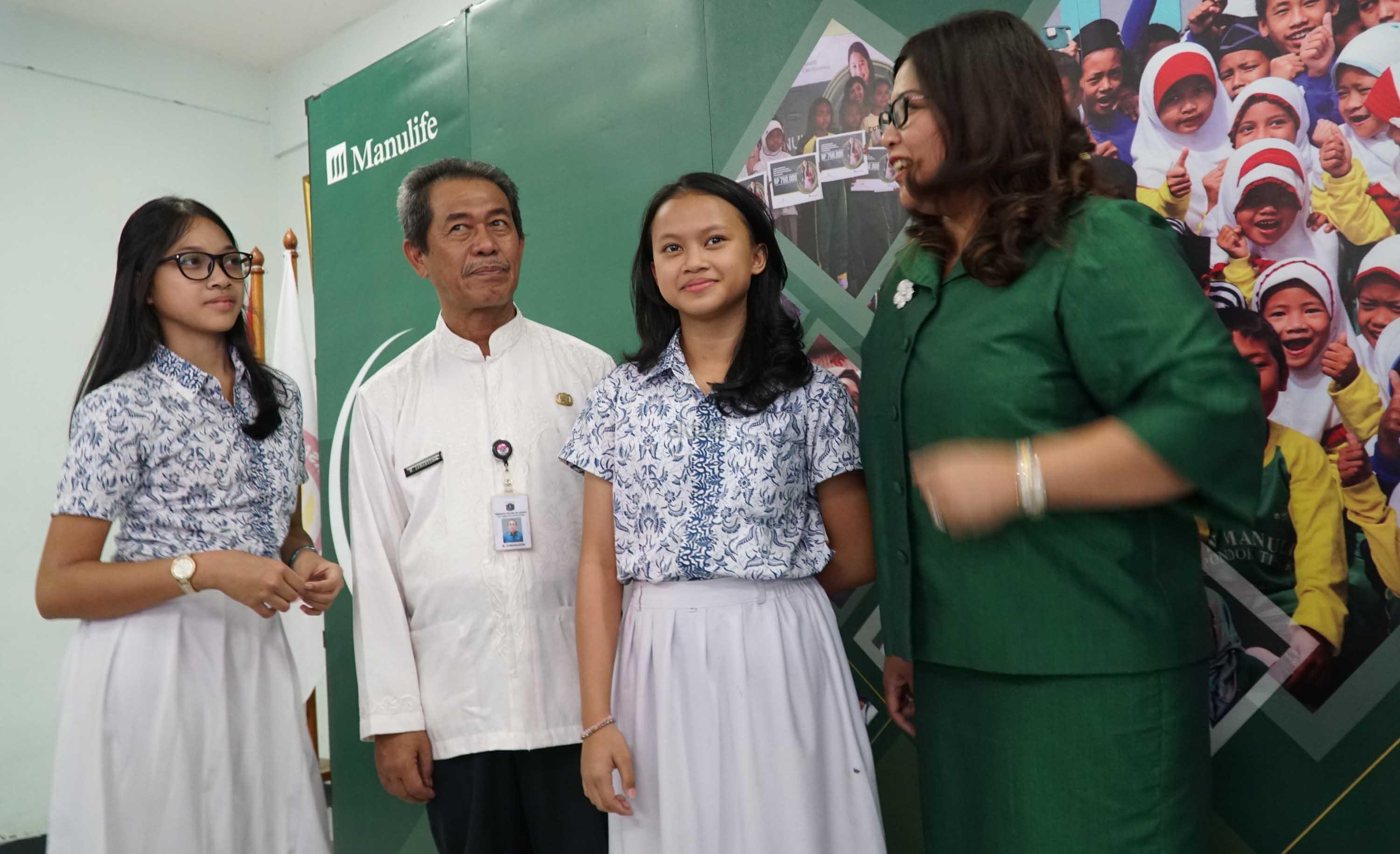 Direktur & Chief Marketing Officer Manulife Indonesia, Novita Rumngangun ( kanan) didampingi Kepala Sekolah SMPN 11 Jakarta Selatan, M Zamanuddin (kedua dari kiri) berdialog dengan para siswa/i SMPN 11 disela kegiatan edukasi literasi keuangan melalui CSR Zoning, Kamis (3/8). CSR Zoning merupakan salah satu upaya Manulife untuk memperkuat pendidikan literasi keuangan di Indonesia.Kegiatan ini memberikan kesempatan kepada karyawan dan agen untuk menominasikan sekolah atau komunitas yang dekat dengan tempat tinggal mereka.Melalui program tersebut, karyawan dan agen didorong untuk terlibat secara sukarela memajukan dan berkontribusi terhadap komunitas di lingkungan mereka sehingga komunitas tersebut dapat menjadi andalan keluarga.CSR Zoning akan dilakukan secara berkala dan berkesinambungan di area area lainnya di wilayah Jabodetabek. AKTUAL/Eko S Hilman
