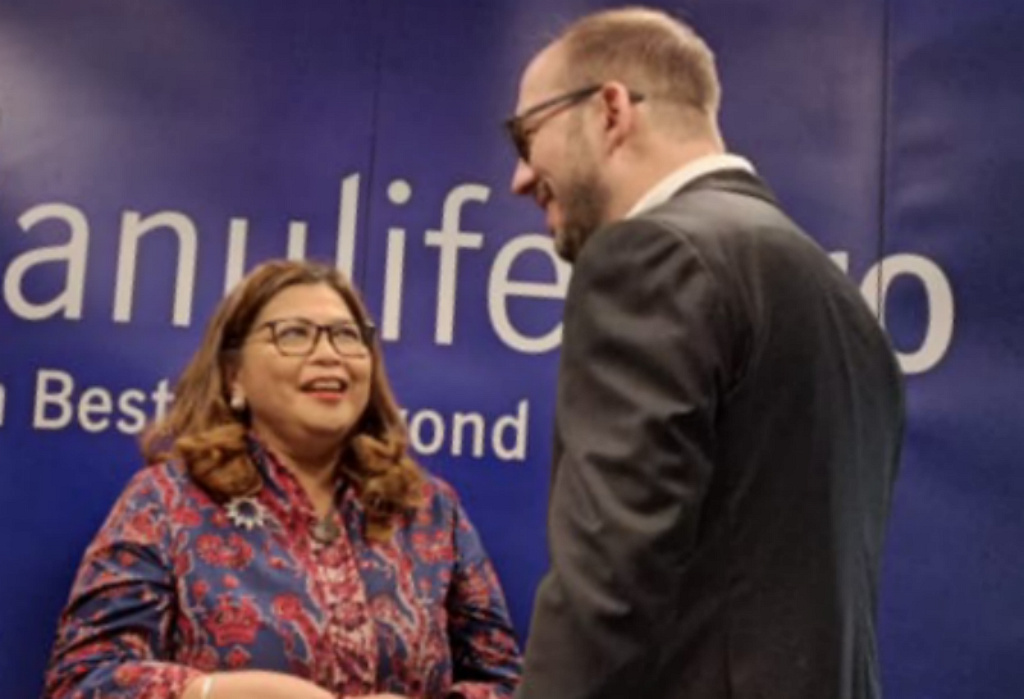 Vice President Director & Deputy CEO Manulife Indonesia Novita Rumngangun dan President Director & CEO Manulife Indonesia Ryan Charland berbincang saat acara Manulife Pro di Jakarta, Senin (10/2/2025).