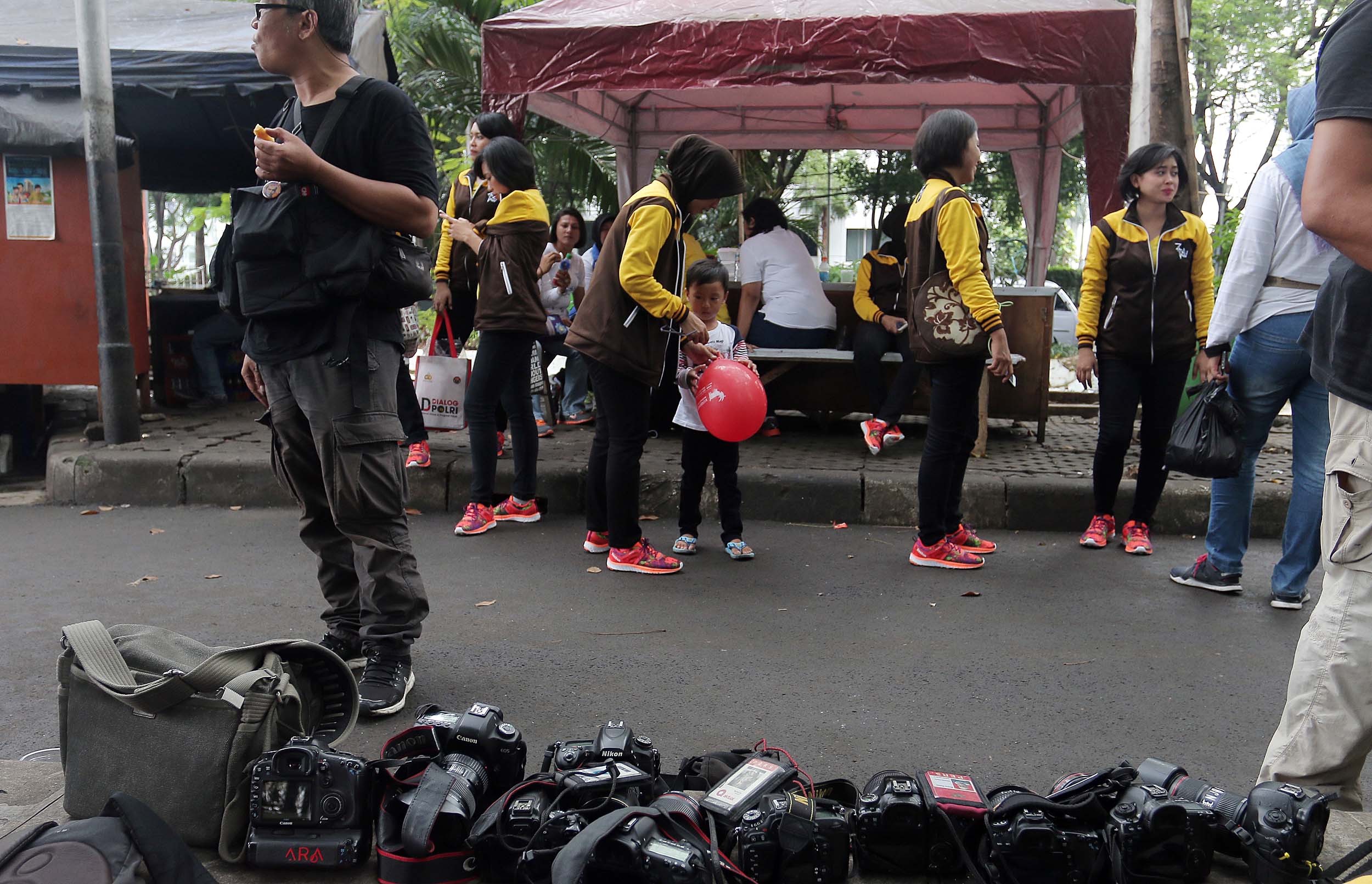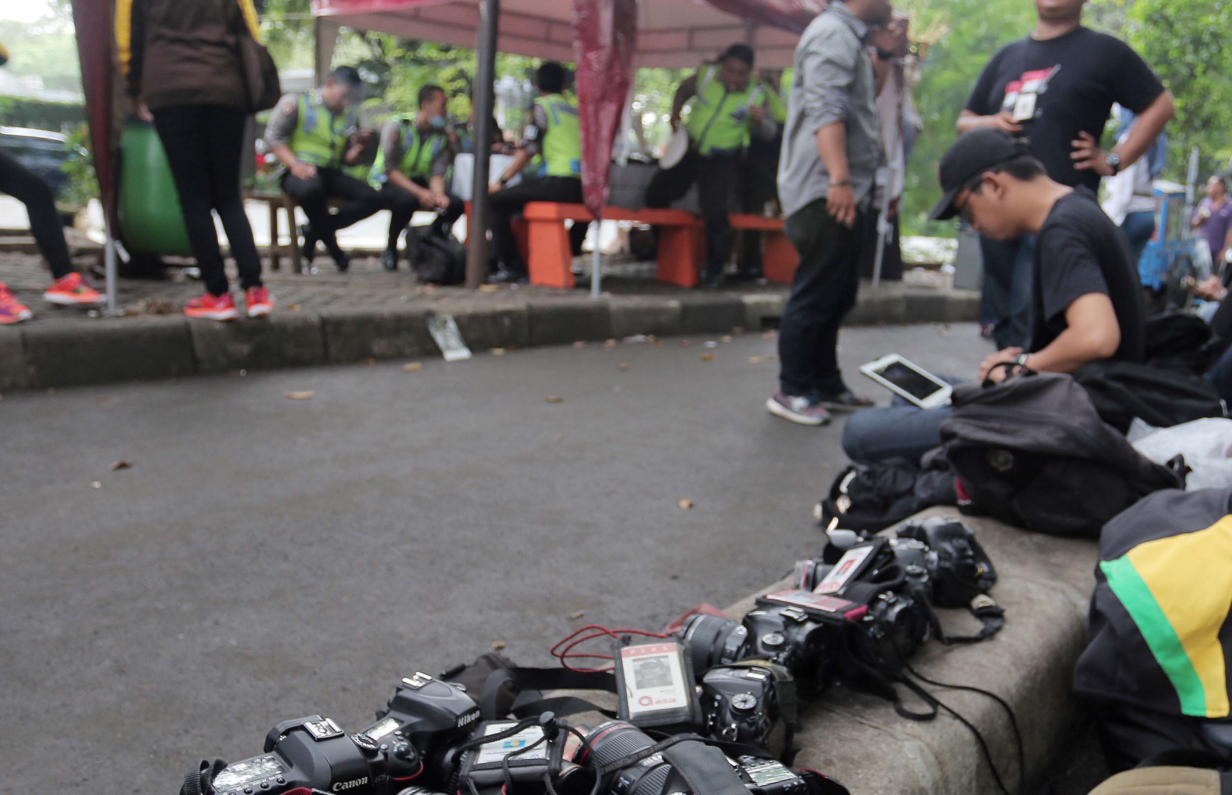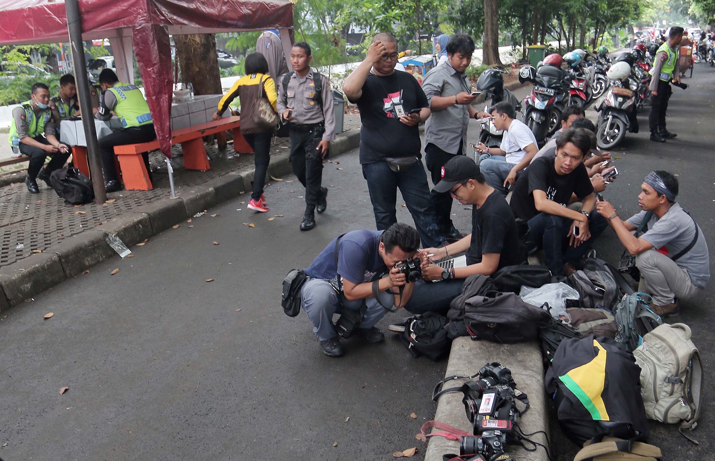 Sejumlah pewarta foto melakukan editing di tengah pembatas jalan Kawasan Bundaran HI, Jakarta, Minggu (28/8/2016). Mereka terpaksa melakukan kegiatan jurnalistiknya di tempat tersebut karena tenda permanen yang mereka bangun di belakang Pospol Bundaran HI digusur oleh pihak kepolisian dan Satpol PP sementara tenda darurat yang disediakan dapat diambil sewaktu-waktu.