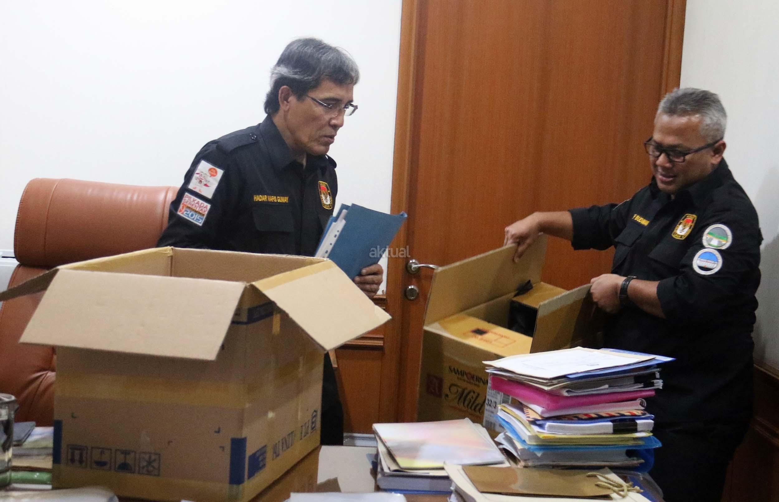 Komisioner KPU Hadar Nafis Gumay (kanan) dibantu Komisioner Arief KPU RI (kiri) Budiman mengemasi barang-barang di kantornya, Jakarta, Senin (10/4/2017).Hari ini merupakan hari terakhir anggota KPU periode 2012-2017 bertugas. AKTUAL/Munzir