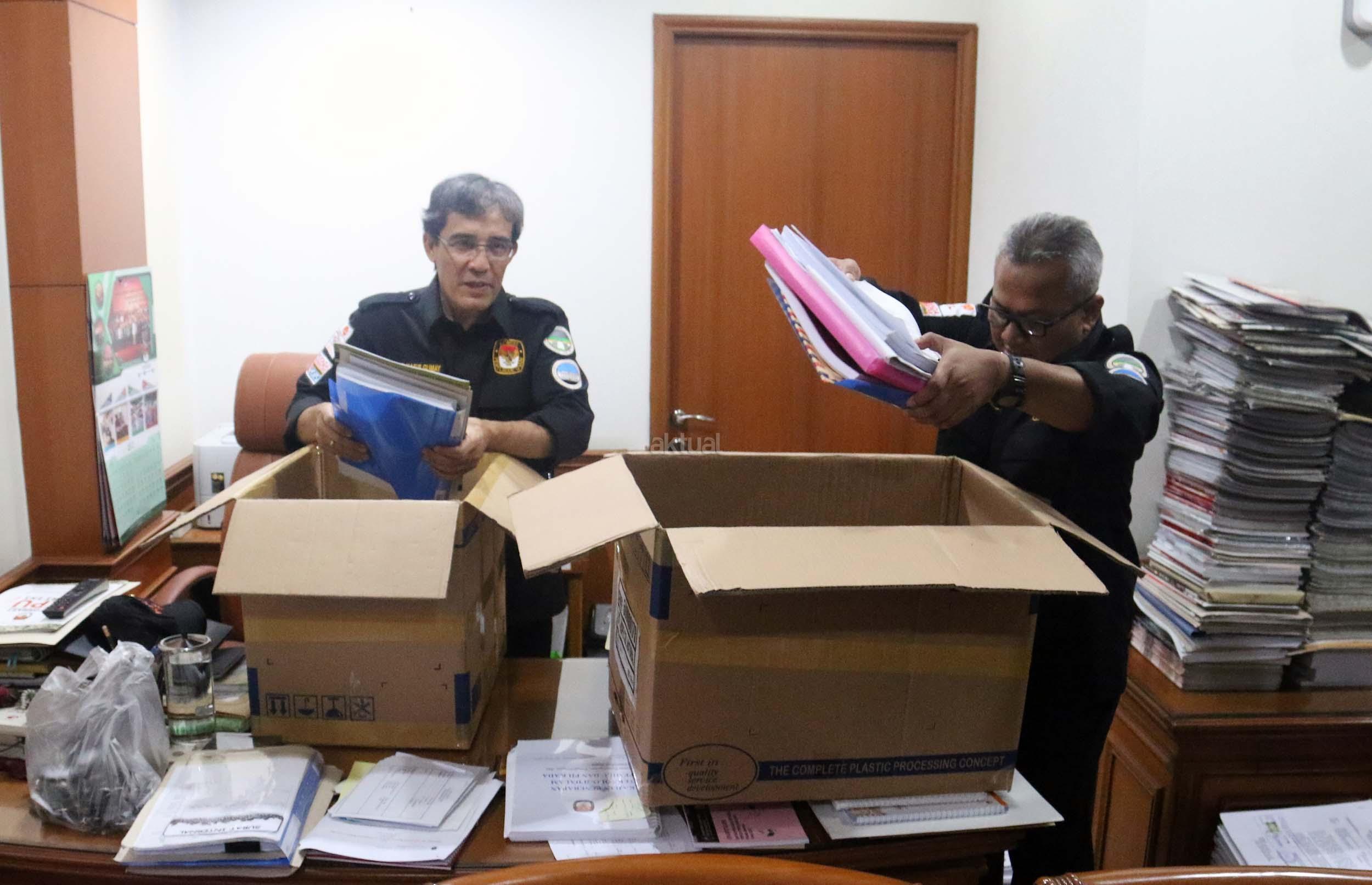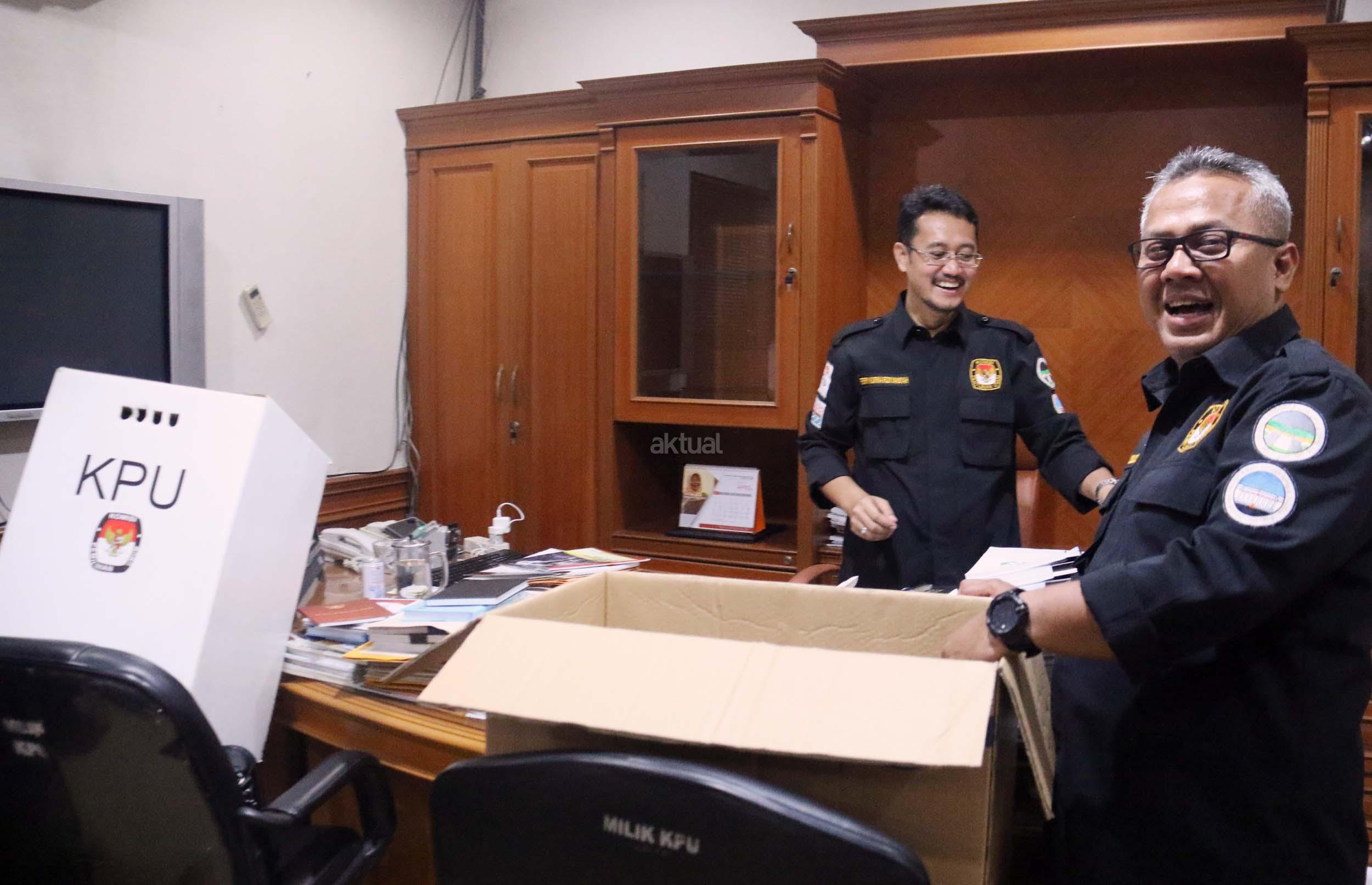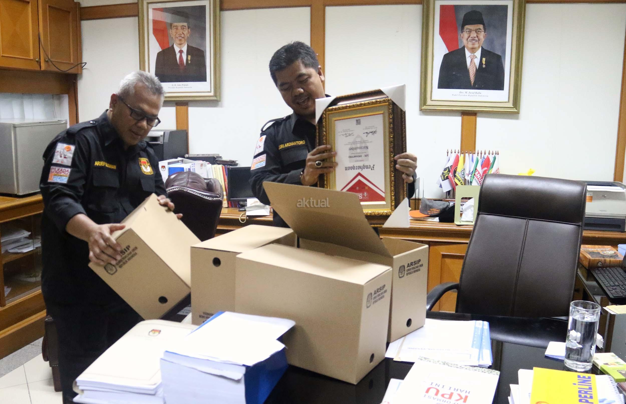 Ketua KPU RI Juri Ardiantoro (kanan) dibantu Komisoner RI Arief Budiman (kiri) mengemasi barang-barang di kantornya, Jakarta, Senin (10/4/2017).Hari ini merupakan hari terakhir anggota KPU periode 2012-2017 bertugas. AKTUAL/Munzir