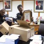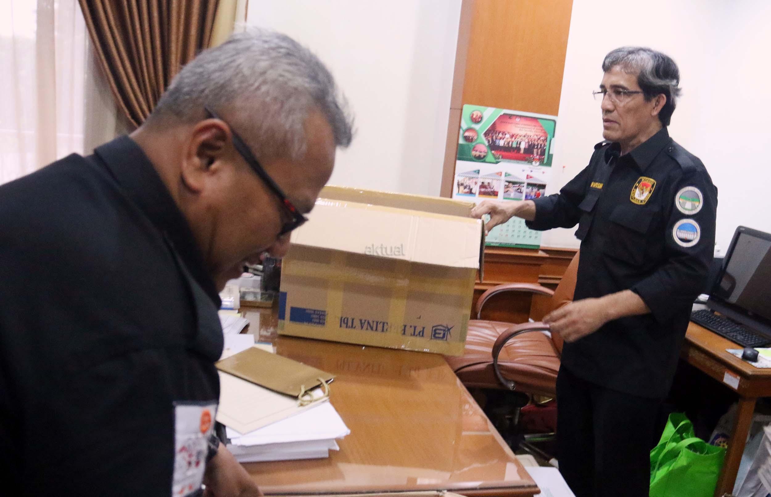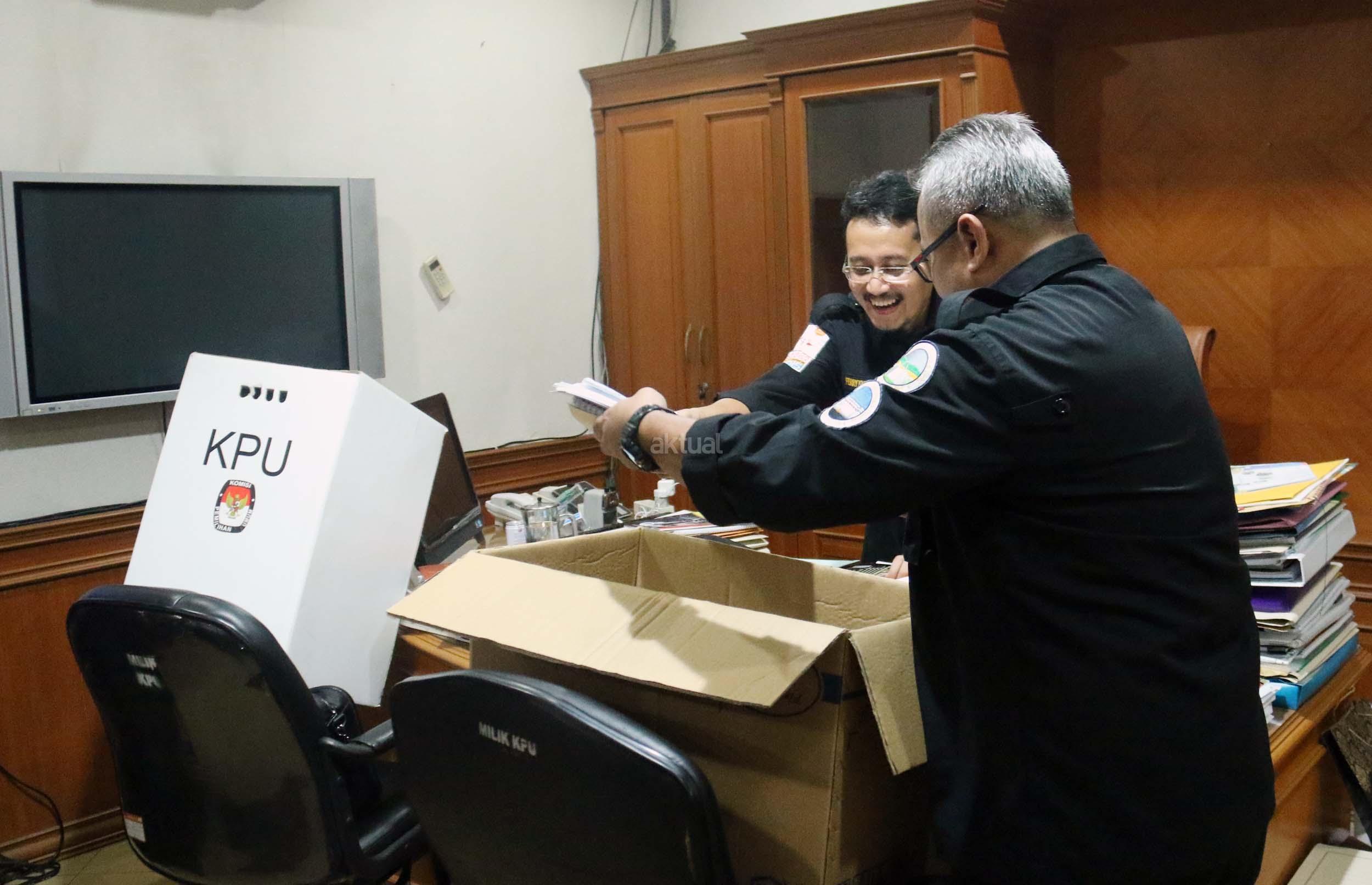 Komisioner KPU RU Ferry Kurnia Rizkiansyah (kiri) dibantu Komisioner KPU RI Arief Budiman (kanan) mengemasi barang-barang di kantornya, Jakarta, Senin (10/4/2017).Hari ini merupakan hari terakhir anggota KPU periode 2012-2017 bertugas. AKTUAL/Munzir