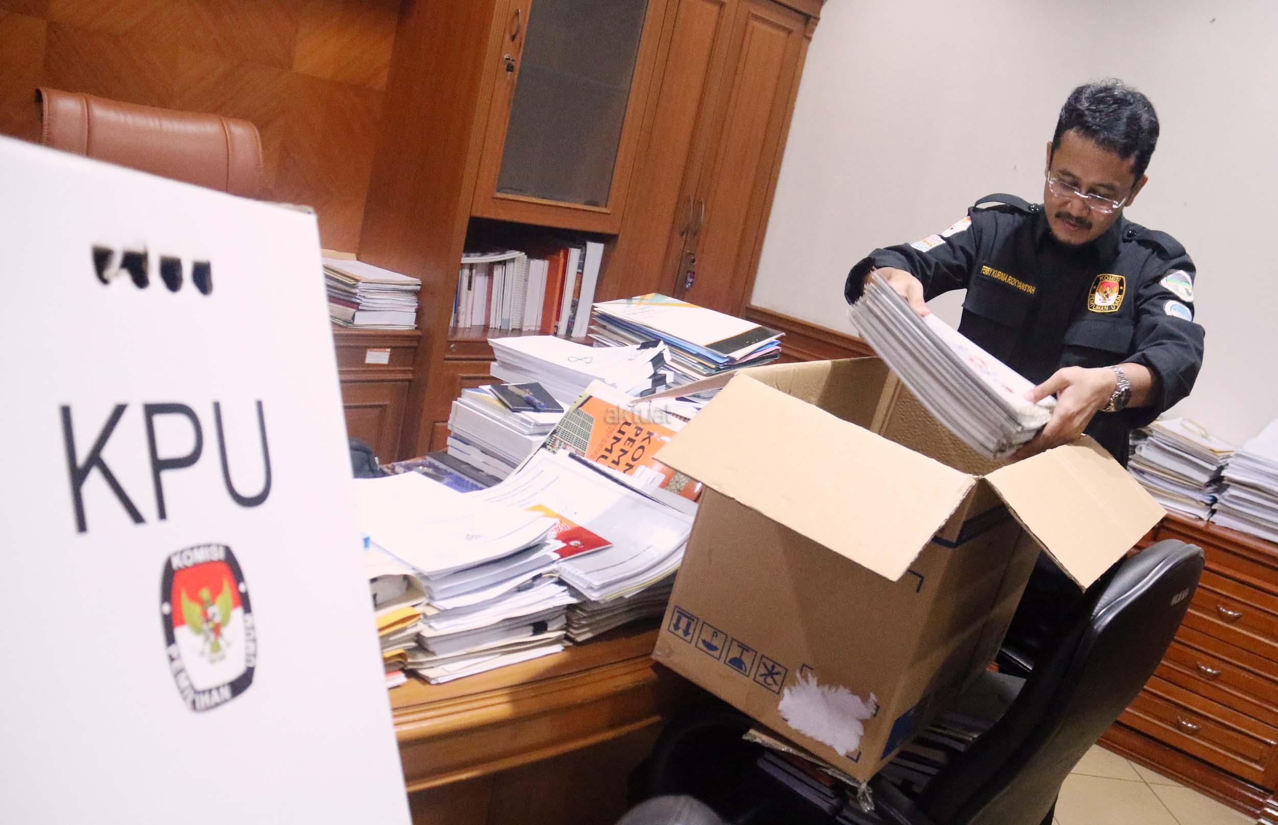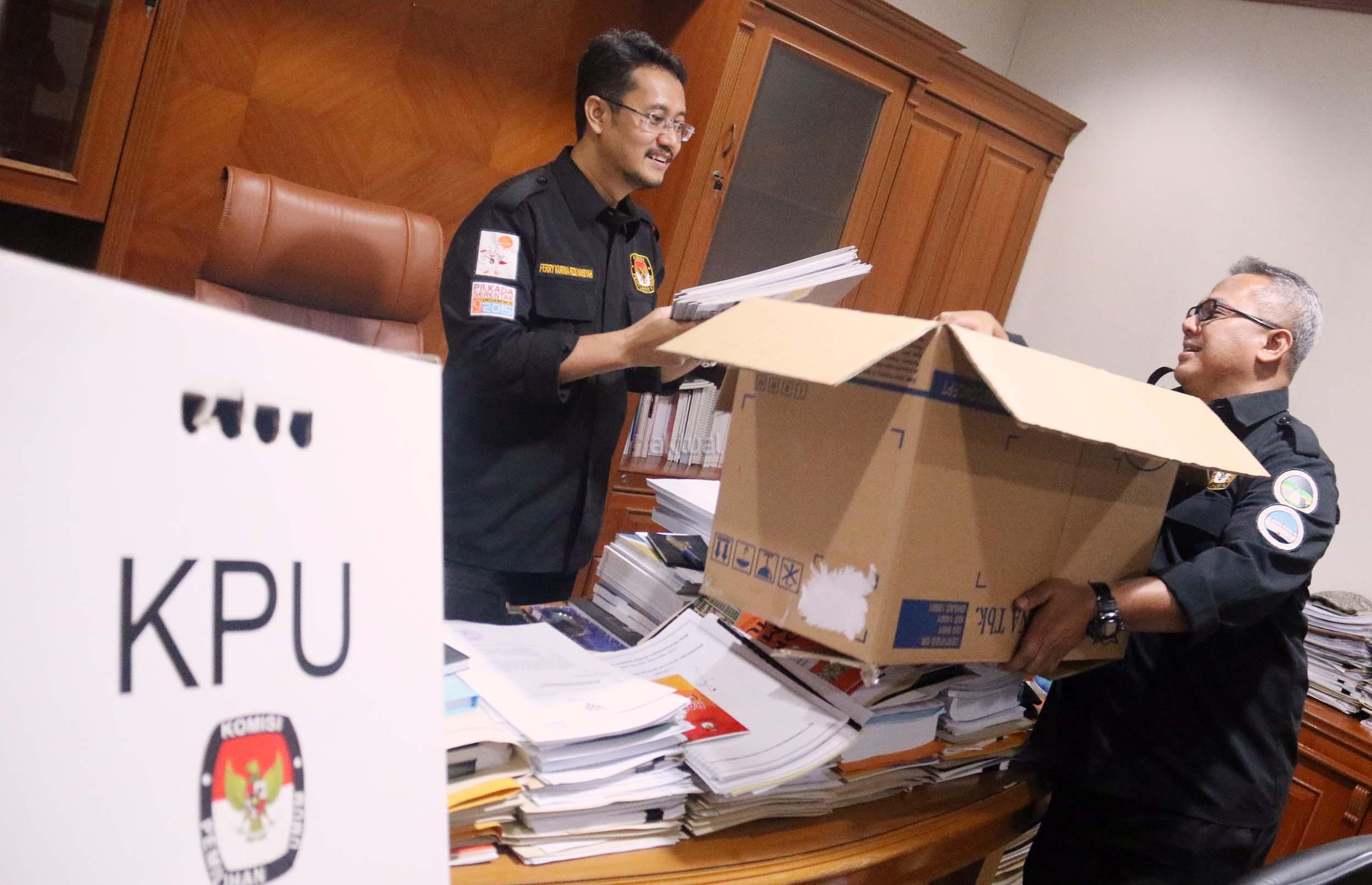 Komisioner KPU RU Ferry Kurnia Rizkiansyah mengemasi barang-barang di kantornya, Jakarta , Senin (10/4/2017).Hari ini merupakan hari terakhir anggota KPU periode 2012-2017 bertugas. AKTUAL/Munzir