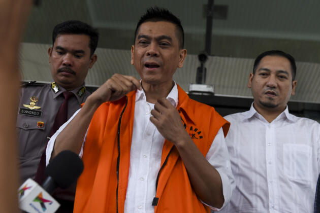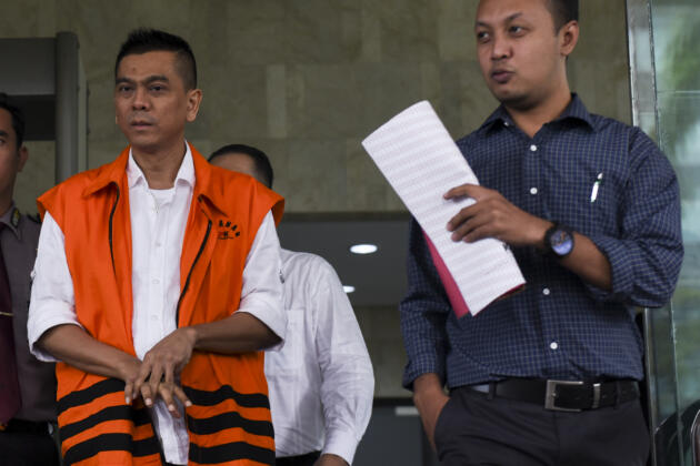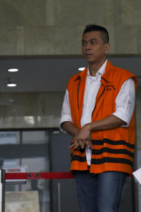Mantan Ketua Komisi D DPRD DKI Jakarta Mohamad Sanusi (tengah) memberikan keterangan pers seusai diperiksa di Gedung KPK, Jakarta, Rabu (29/6). Masa penahanan Sanusi yang merupakan tersangka dugaan penerima suap terkait pembahasan Raperda reklamasi Teluk Jakarta itu diperpanjang oleh KPK. ANTARA FOTO/Hafidz Mubarak A./aww/16.