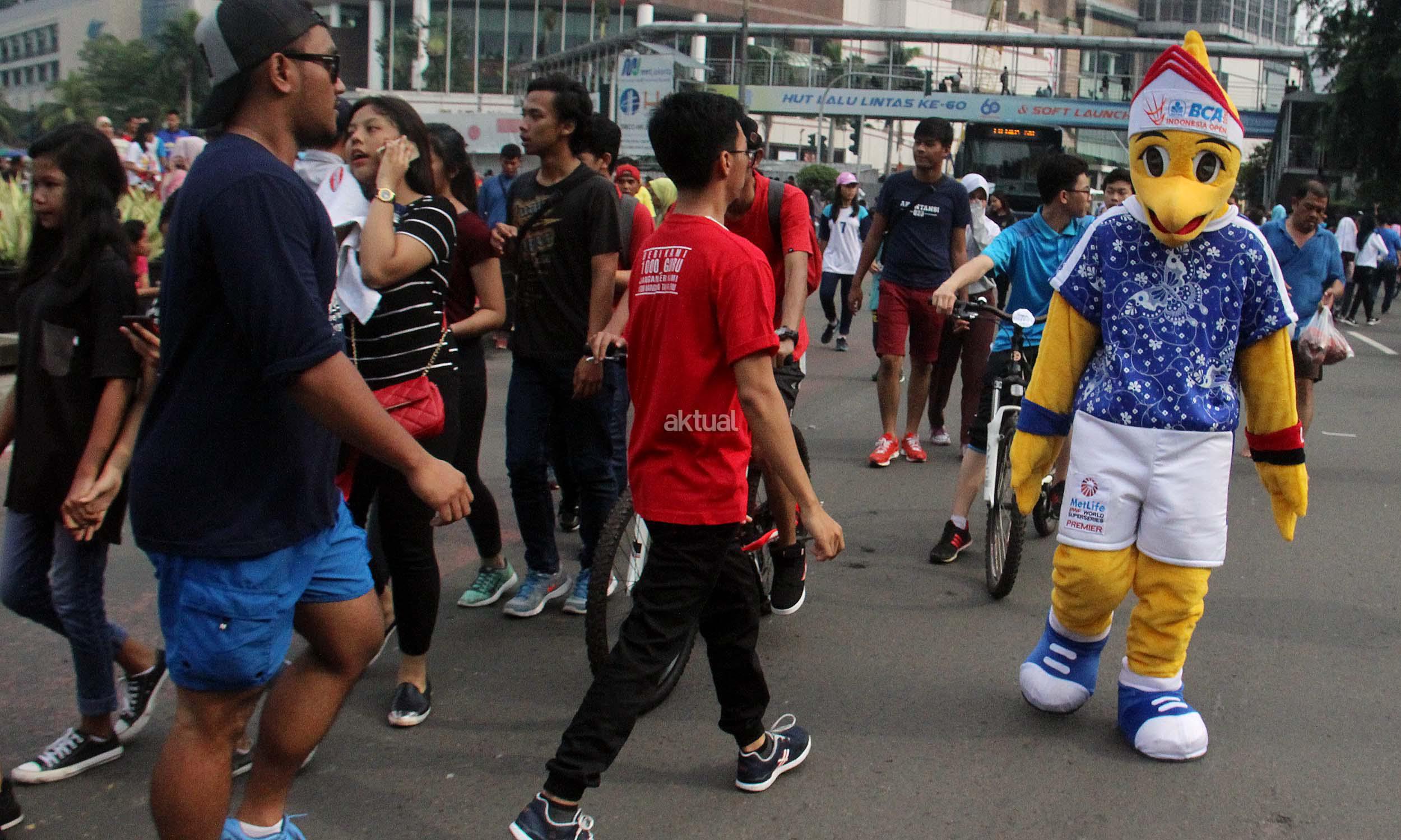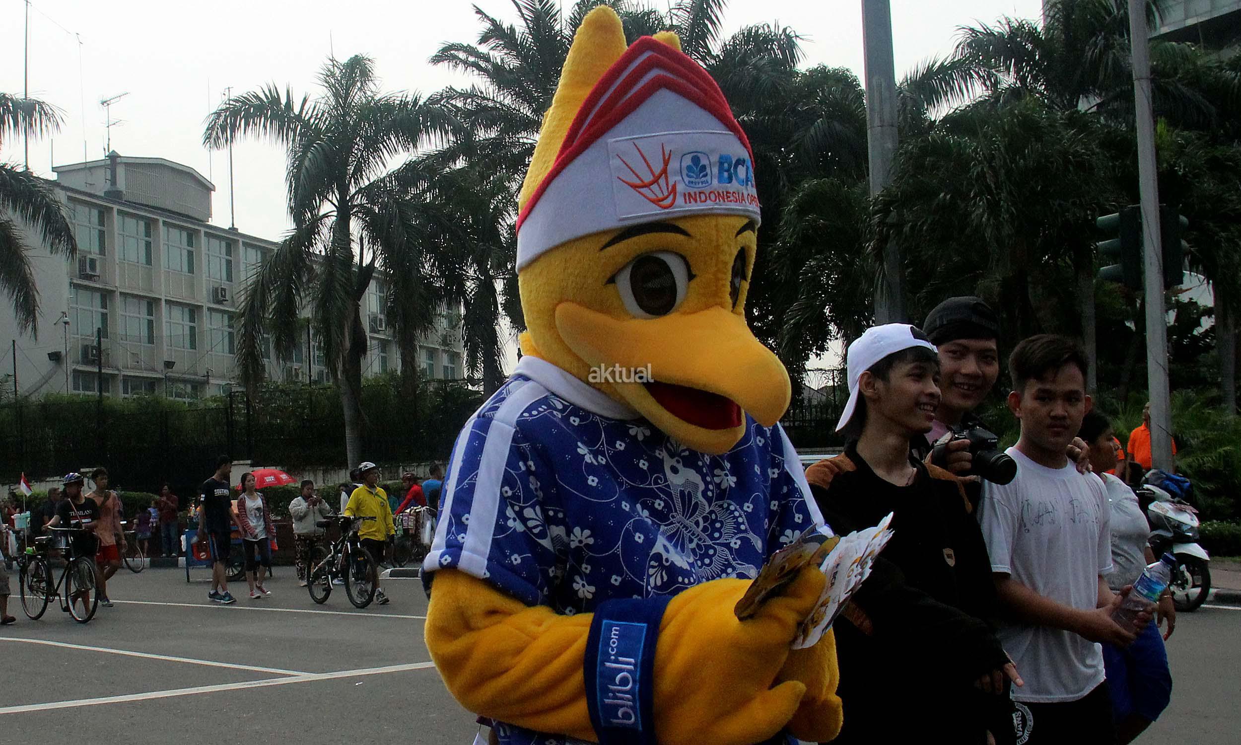Maskot Indonesia Open berkeliling saat Car Free Day (CFD) kawasan Bundaran HI, Jakarta, Minggu (22/5). Kegiatan tersebut untuk sosialisasi menyambut perhelatan turnamen BCA Indonesia Open 2016 akan di gelar pada 30 Mei 5 Juni 2016.