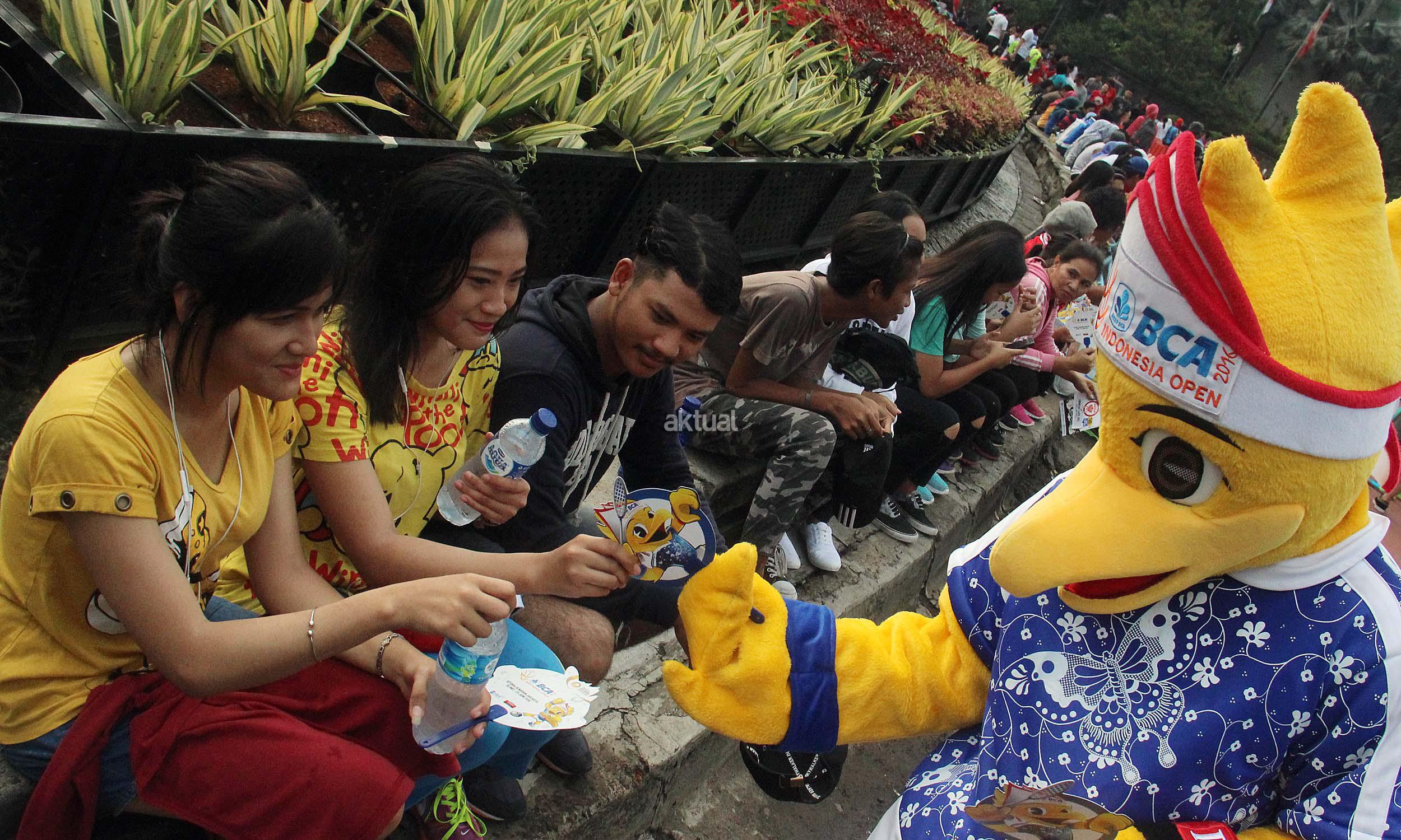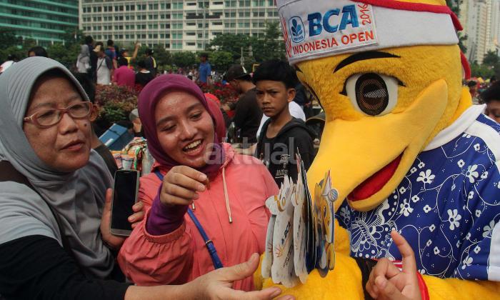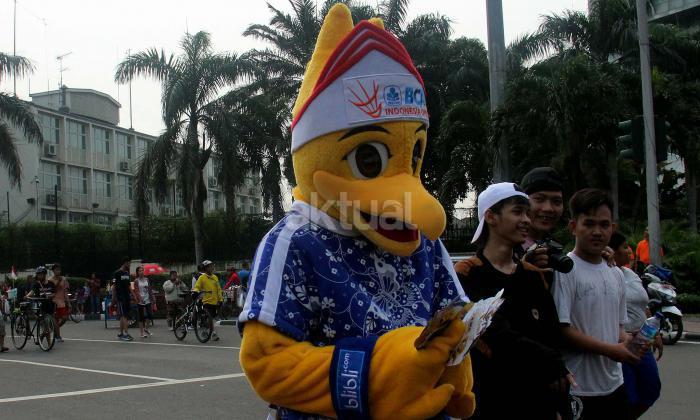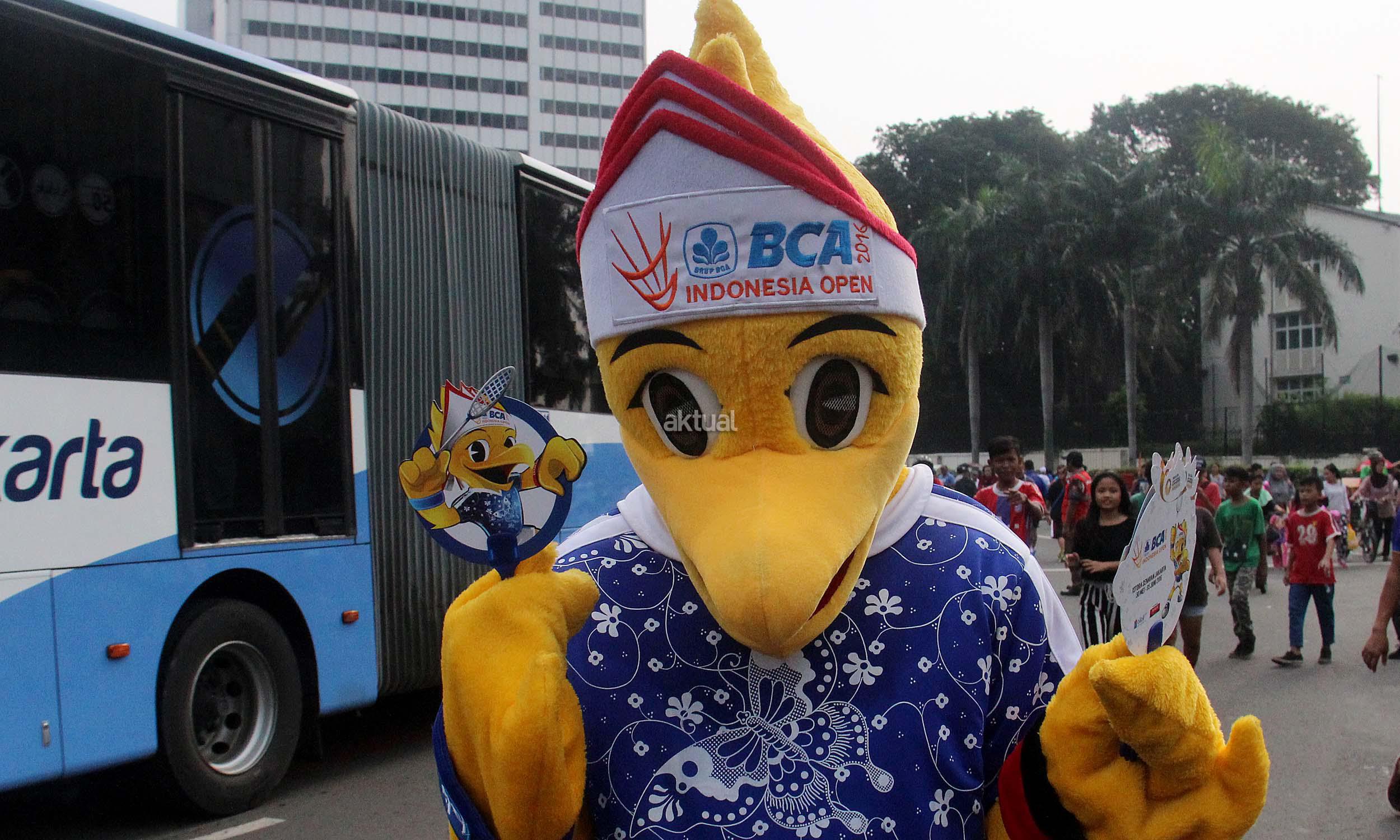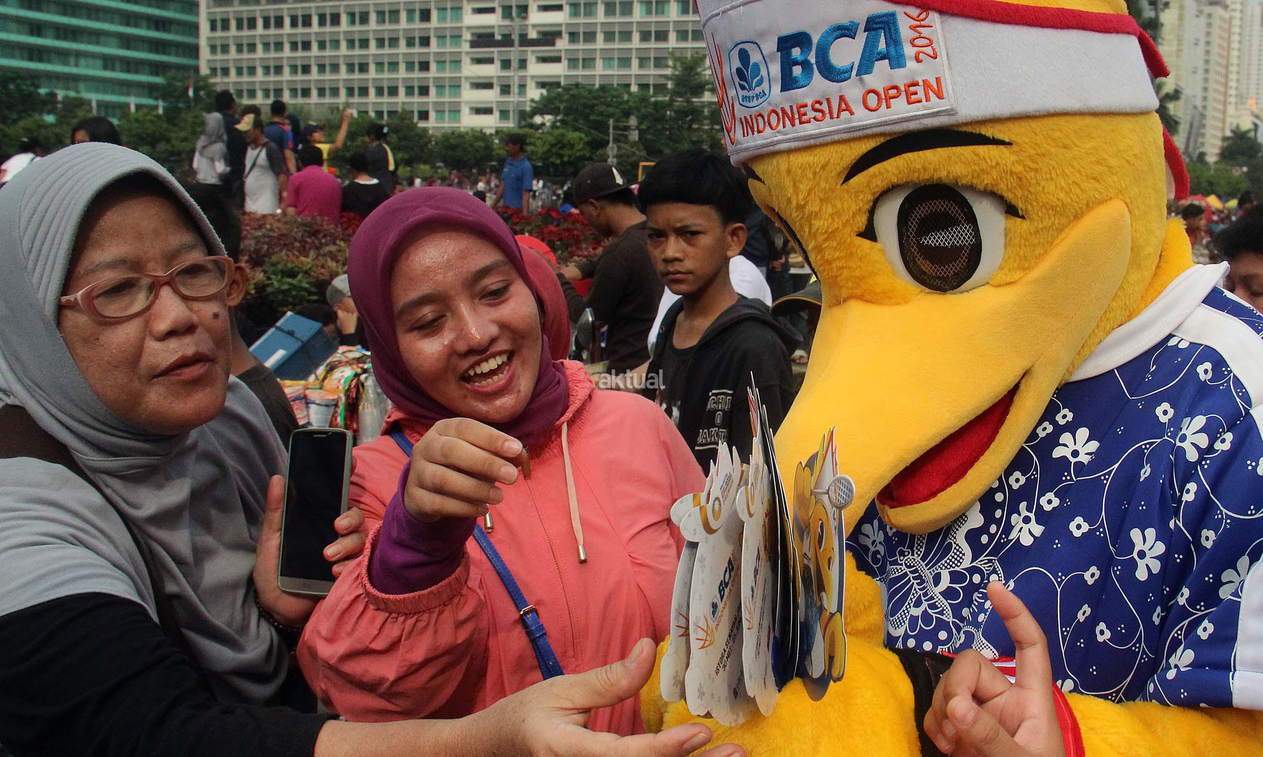 Maskot Indonesia Open berkeliling saat Car Free Day (CFD) kawasan Bundaran HI, Jakarta, Minggu (22/5/2016). Kegiatan tersebut untuk sosialisasi menyambut perhelatan turnamen BCA Indonesia Open 2016 akan di gelar pada 30 Mei 5 Juni 2016.