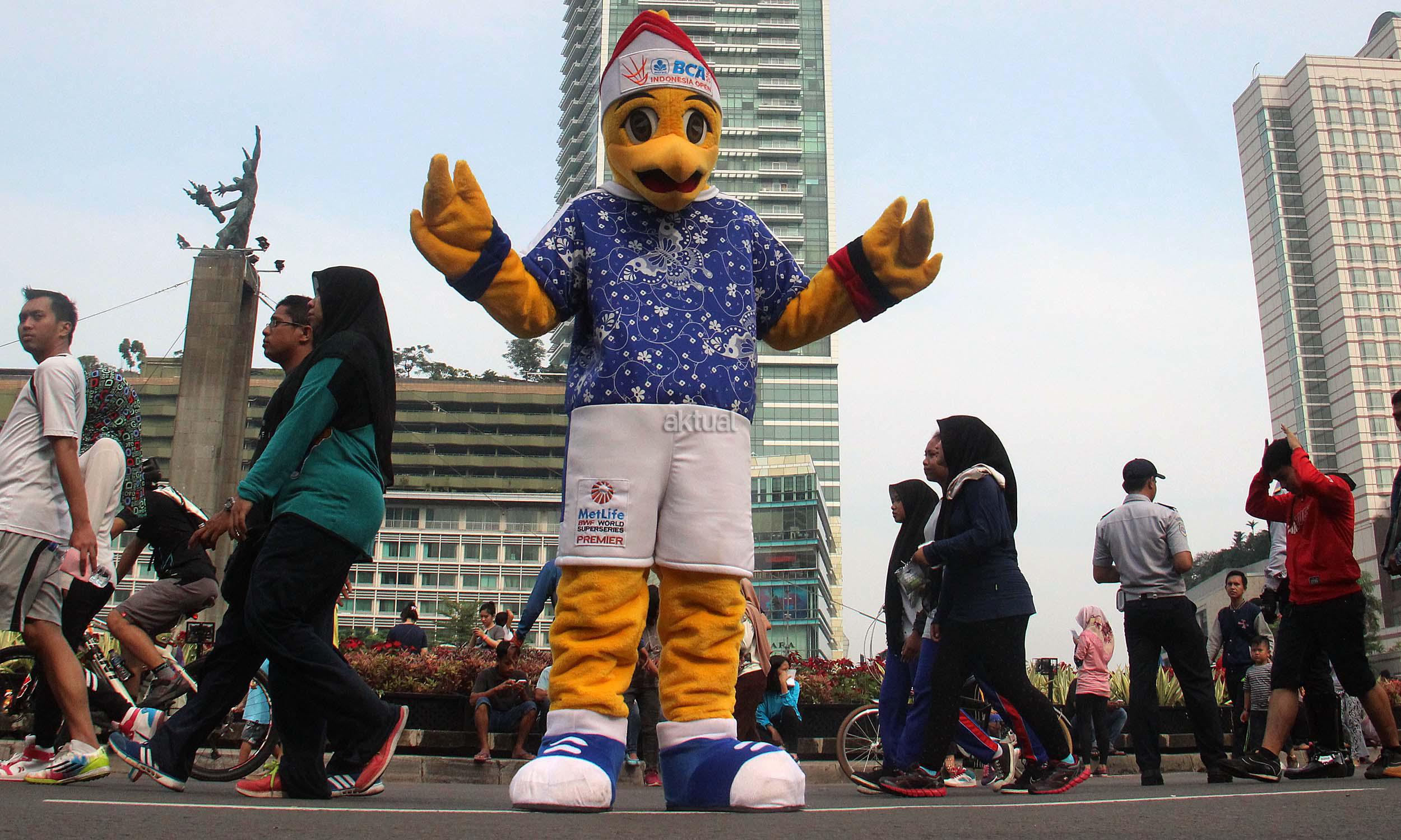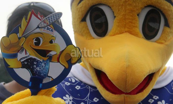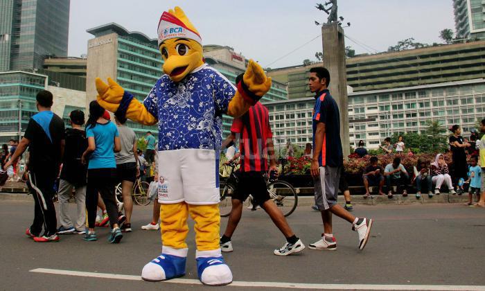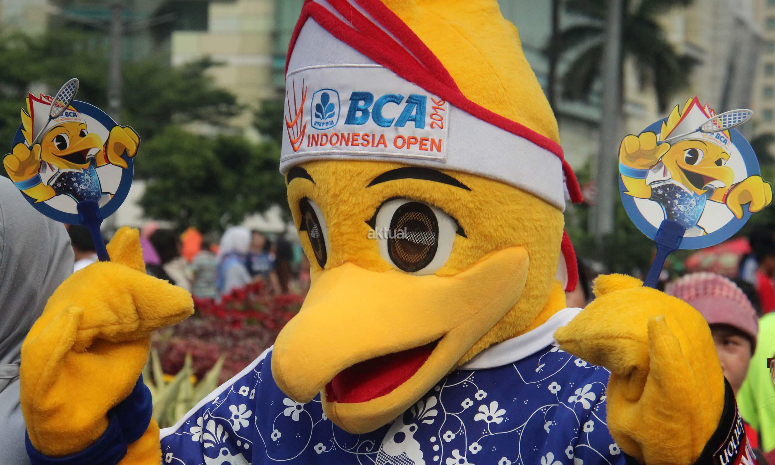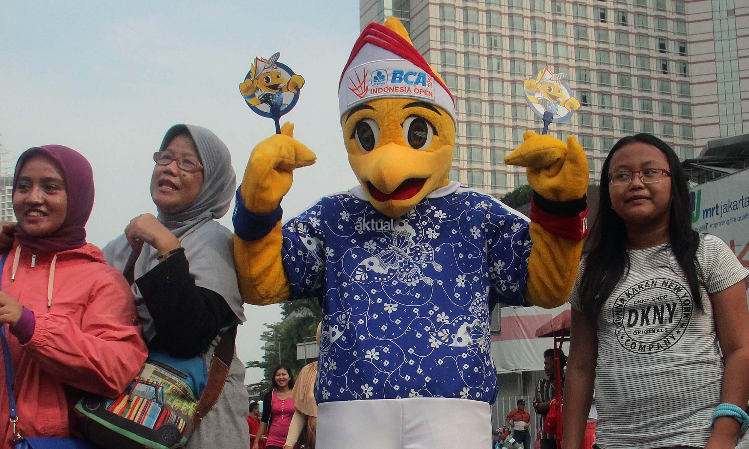 Maskot Indonesia Open berkeliling saat Car Free Day (CFD) kawasan Bundaran HI, Jakarta, Minggu (22/5/2016). Kegiatan tersebut untuk sosialisasi menyambut perhelatan turnamen BCA Indonesia Open 2016 akan di gelar pada 30 Mei 5 Juni 2016.