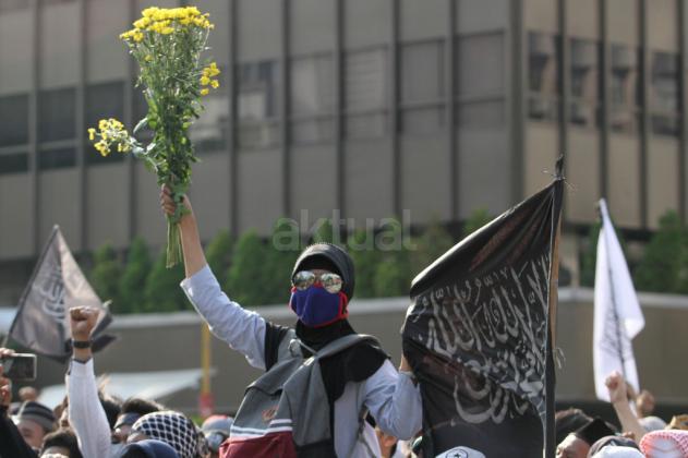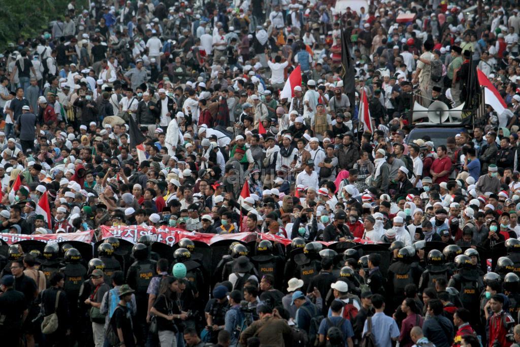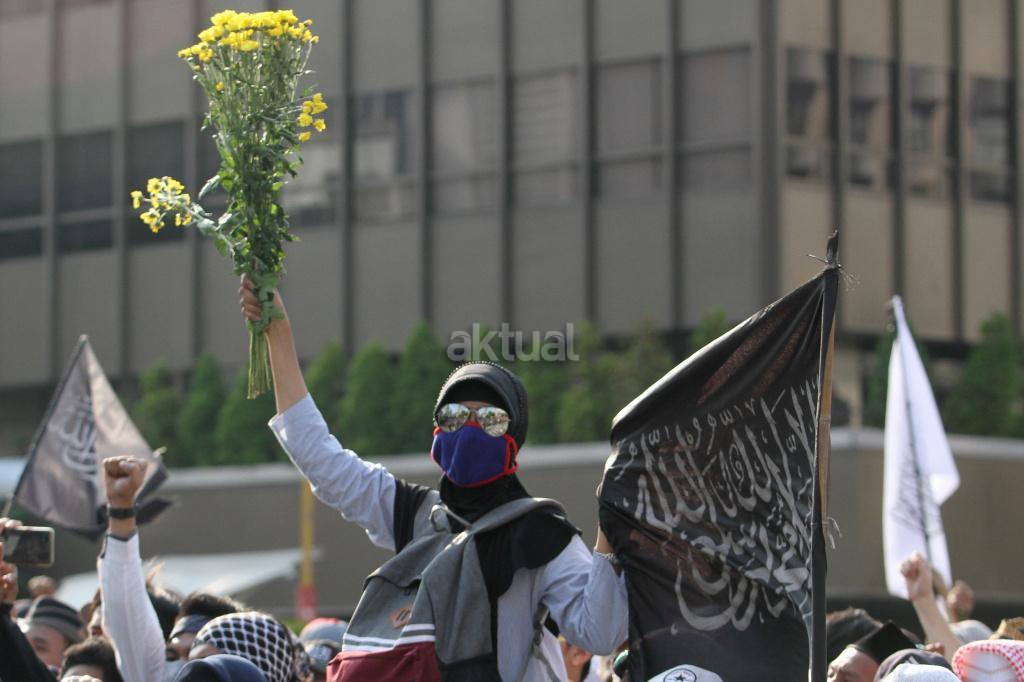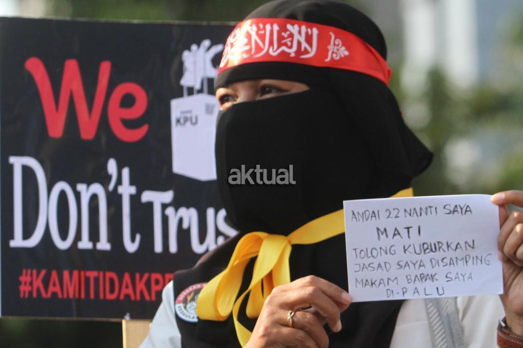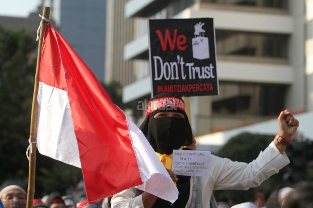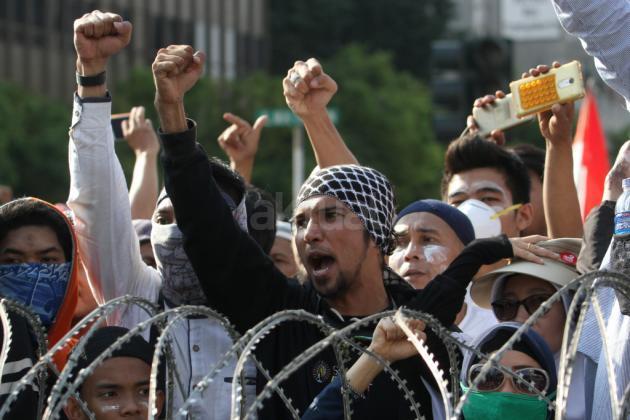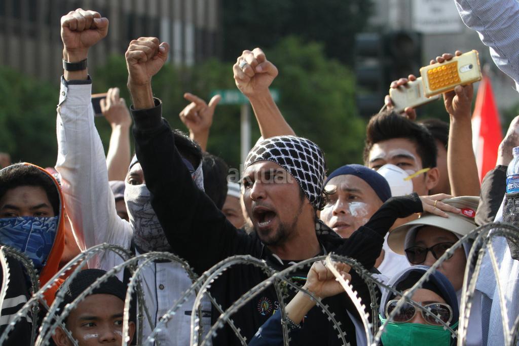 Massa aksi demo 22 Mei saat melakukan aksi di depan gedung Bawaslu, Jakarta, Rabu (22/5/2019). Massa berkumpul tak terima dengan hasil Pemilu 2019 yang ditetapkan Komisi Pemilihan Umum (KPU) kembali melakukan demonstrasi pada hari ini. AKTUAL/Tino Oktaviano