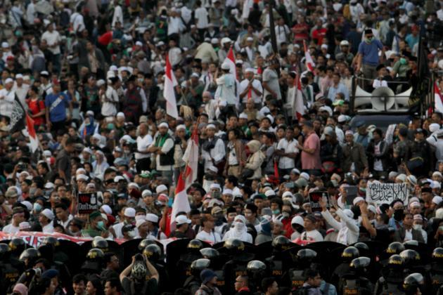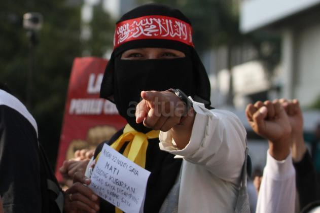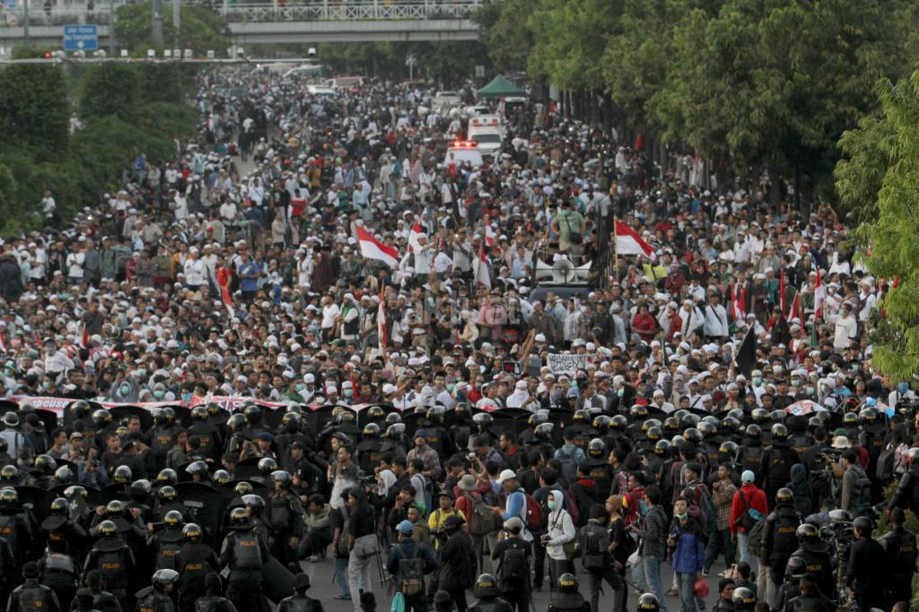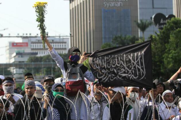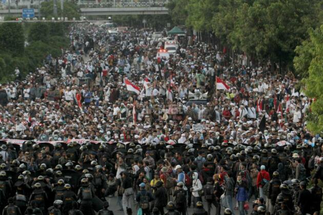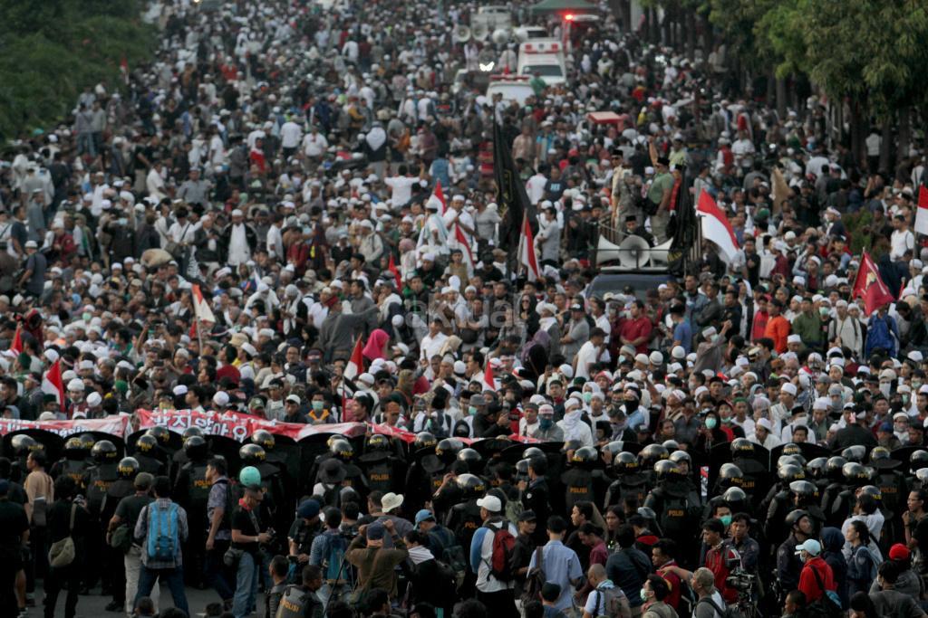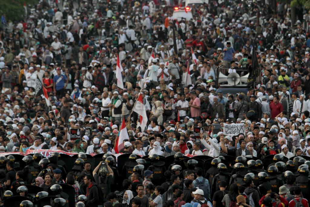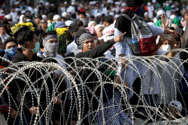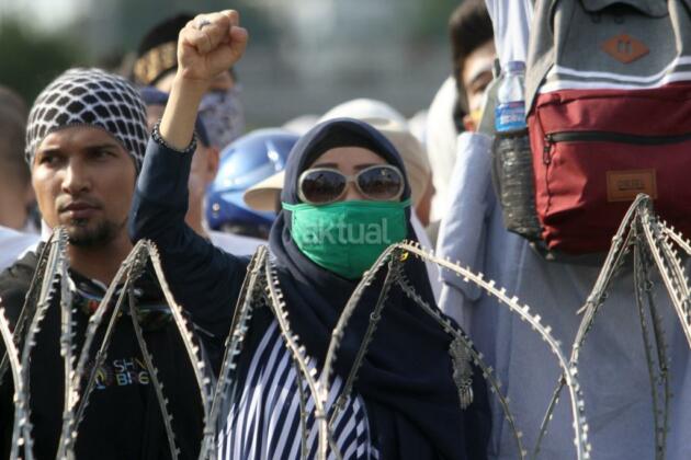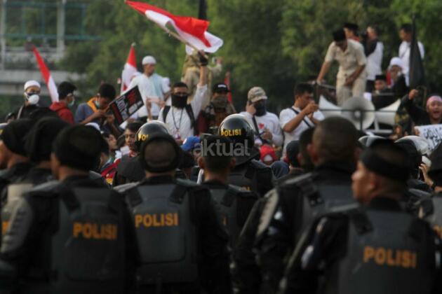 Massa aksi demo 22 Mei saat melakukan aksi di depan gedung Bawaslu, Jakarta, Rabu (22/5/2019). Massa berkumpul tak terima dengan hasil Pemilu 2019 yang ditetapkan Komisi Pemilihan Umum (KPU) kembali melakukan demonstrasi pada hari ini. AKTUAL/Tino Oktaviano