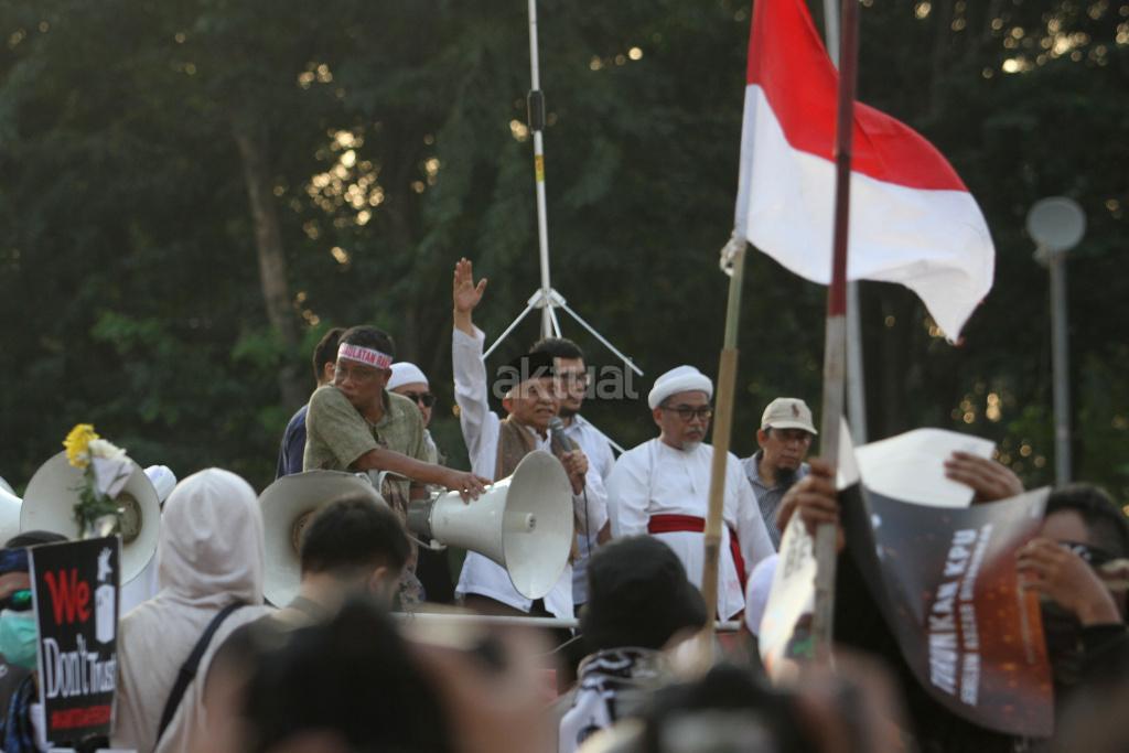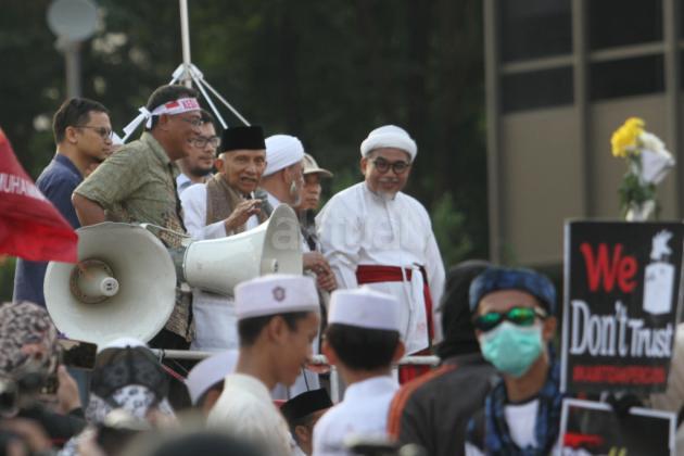 Amien Rais bergabung dengan massa aksi demo 22 Mei saat melakukan aksi di depan gedung Bawaslu, Jakarta, Rabu (22/5/2019). Massa berkumpul tak terima dengan hasil Pemilu 2019 yang ditetapkan Komisi Pemilihan Umum (KPU) kembali melakukan demonstrasi pada hari ini. AKTUAL/Tino Oktaviano