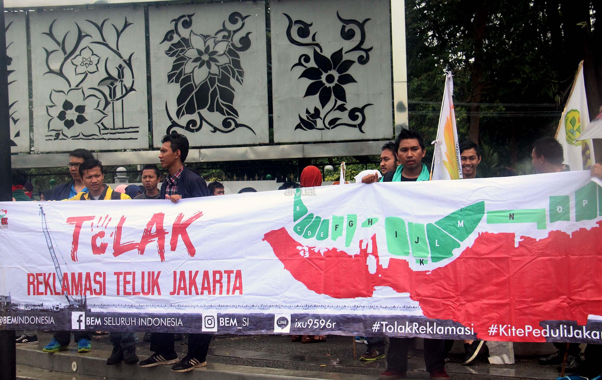 Gabungan elemen masaa terdiri dari Badan Eksekutif Mahasiswa Seluruh Indonesia (BEM SI), Nelayan Teluk Jakarta, LBH Pusat dan gabungan Rakyat Jakarta, kembali menggelar aksi unjukrasa menolak dilanjutkannya proyek reklamasi teluk Jakarta di depan Istana Negara, Senin (19/9/2016). Dalam aksinya mereka menolak dilanjutkannya proyek reklamasi Teluk Jakarta dan melayangkan surat Somasi (Peringatan) kepada Presiden Joko Widodo atas kegelisahan warga Jakarta atas kebijakan.
