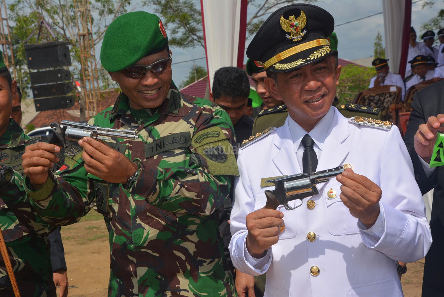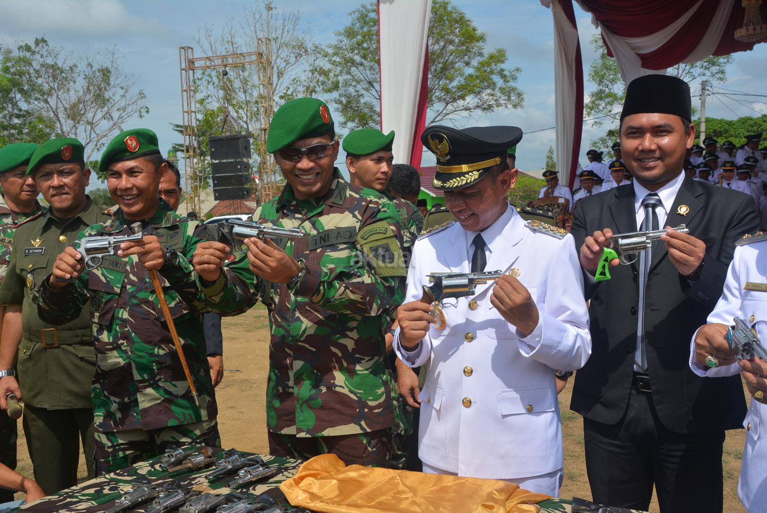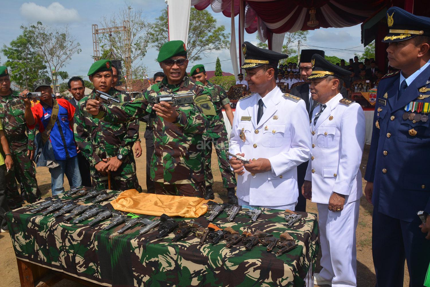 Danrem 043/Garuda Hitam, Kolonel Inf Joko Purwo Putranto didampingi Bupati Mesuji, Ketua DPRD Mesuji, Danlanud Astra Kestra, Dandim 0426/Tuba, Kapolres Tuba, Forkopimda Daerah Mesuji, Tokoh Adat memperlihatkan senjata api ilegal milik masyarakat Mesuji yang diserahkan kepada aparat TNI di Lapangan Upacara Kabupaten Mesuji, Provinsi Lampung, Kamis (26/11/2015). Penyerahan senjata api ilegal ini bertepatan dengan hari jadi Kabupaten Mesuji yang ke-7. AKTUAL/PUSPEN TNI