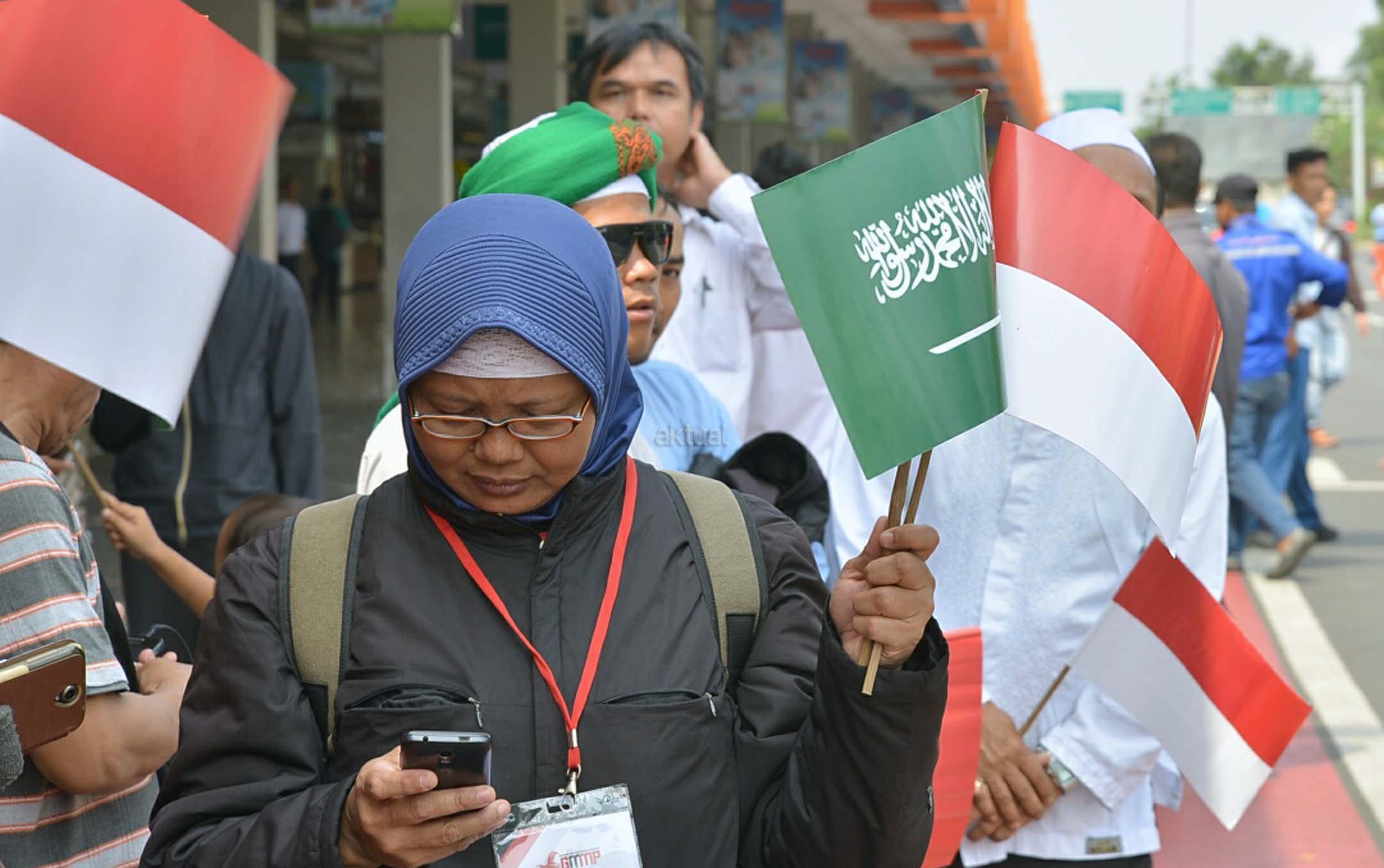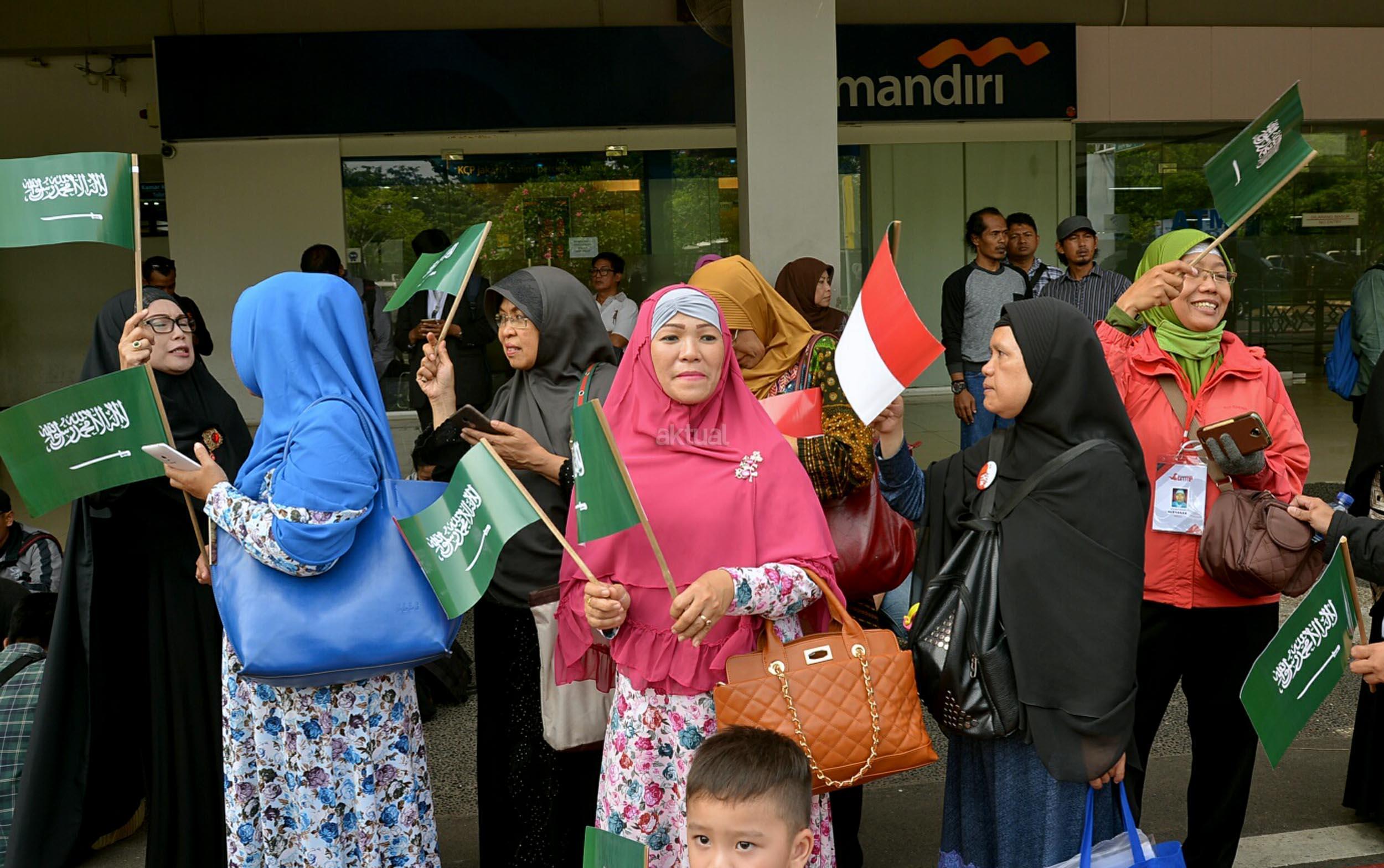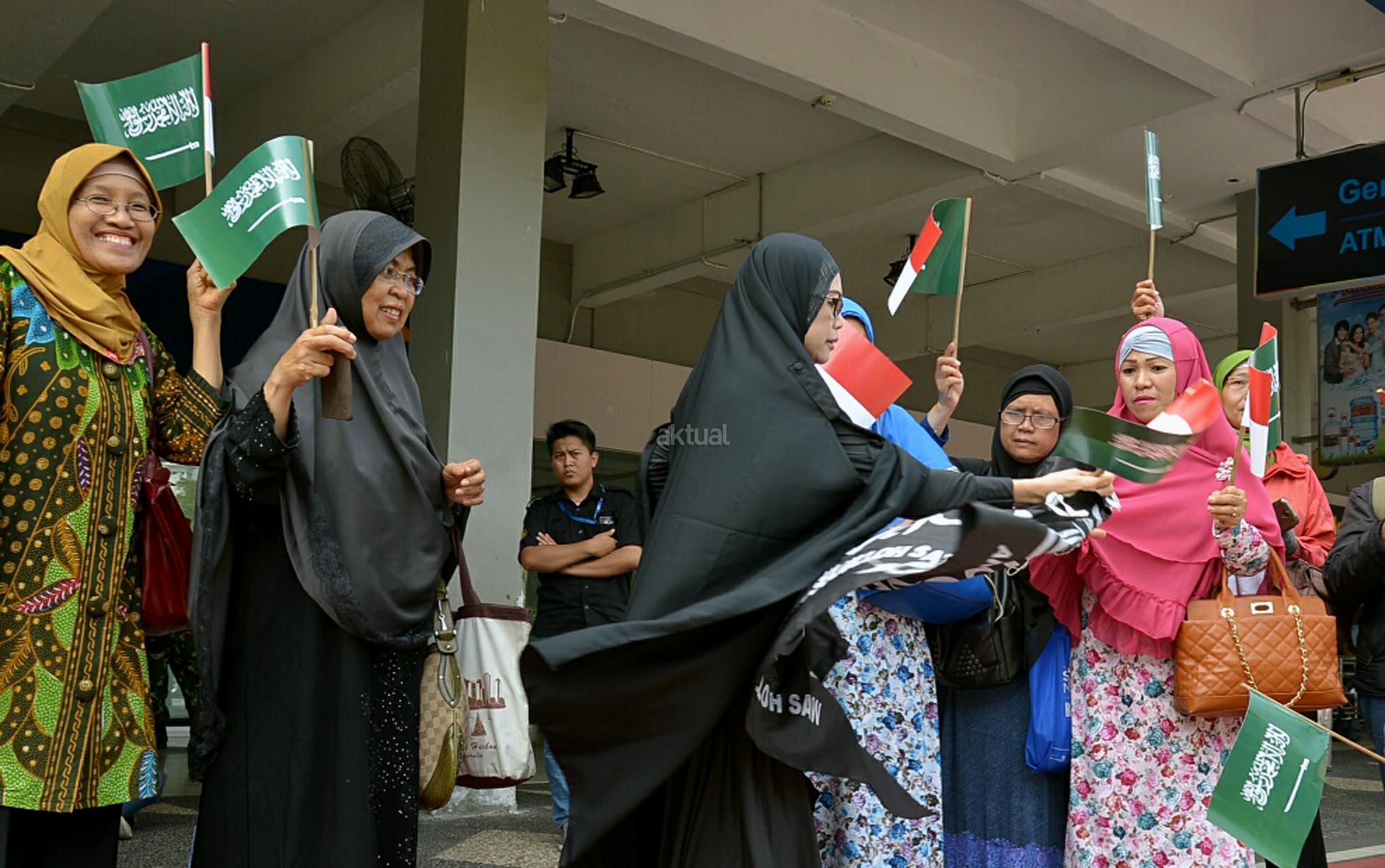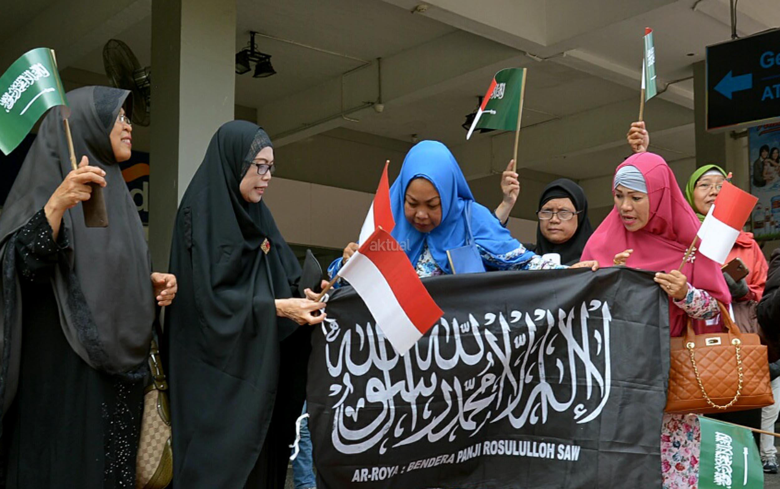 Sejumlah massa yang tergabung dalam Gerakan Muslimah Memilih Pemimpin (GMMP) menggelar aksi simpatik untuk menyambut kedatangan Raja Arab Saudi, Salman bin Abdulaziz Al-Saud di Bandara Halim Perdana Kusuma, Jakarta Timur, Rabu (1/3/2017). Diperkirakan Raja Salman dan rombongan tiba di Indonesia pada pukul 12.45 WIB untuk melakukan kerja sama bilateral dengan pemerintah Indonesia. AKTUAL/Munzir