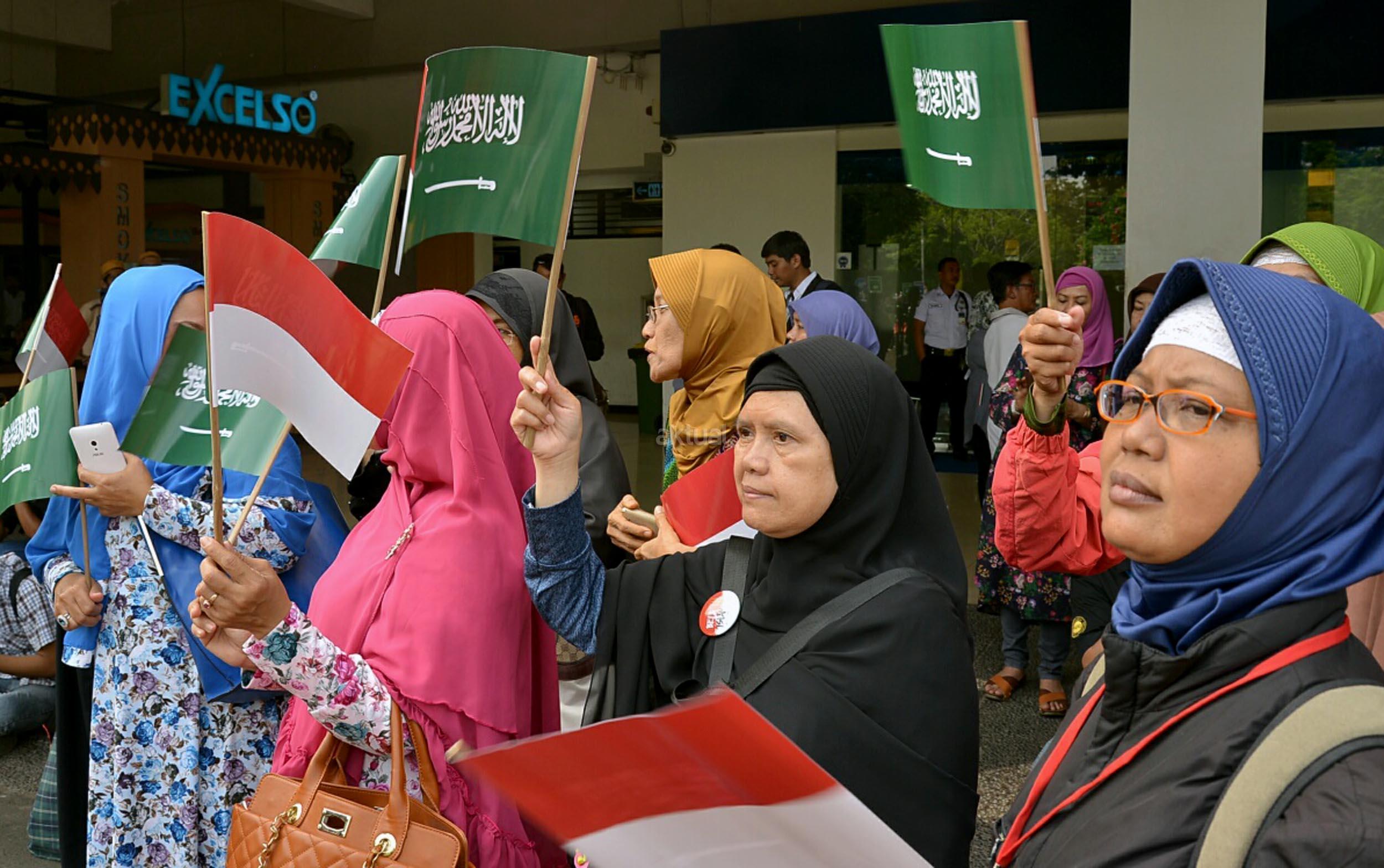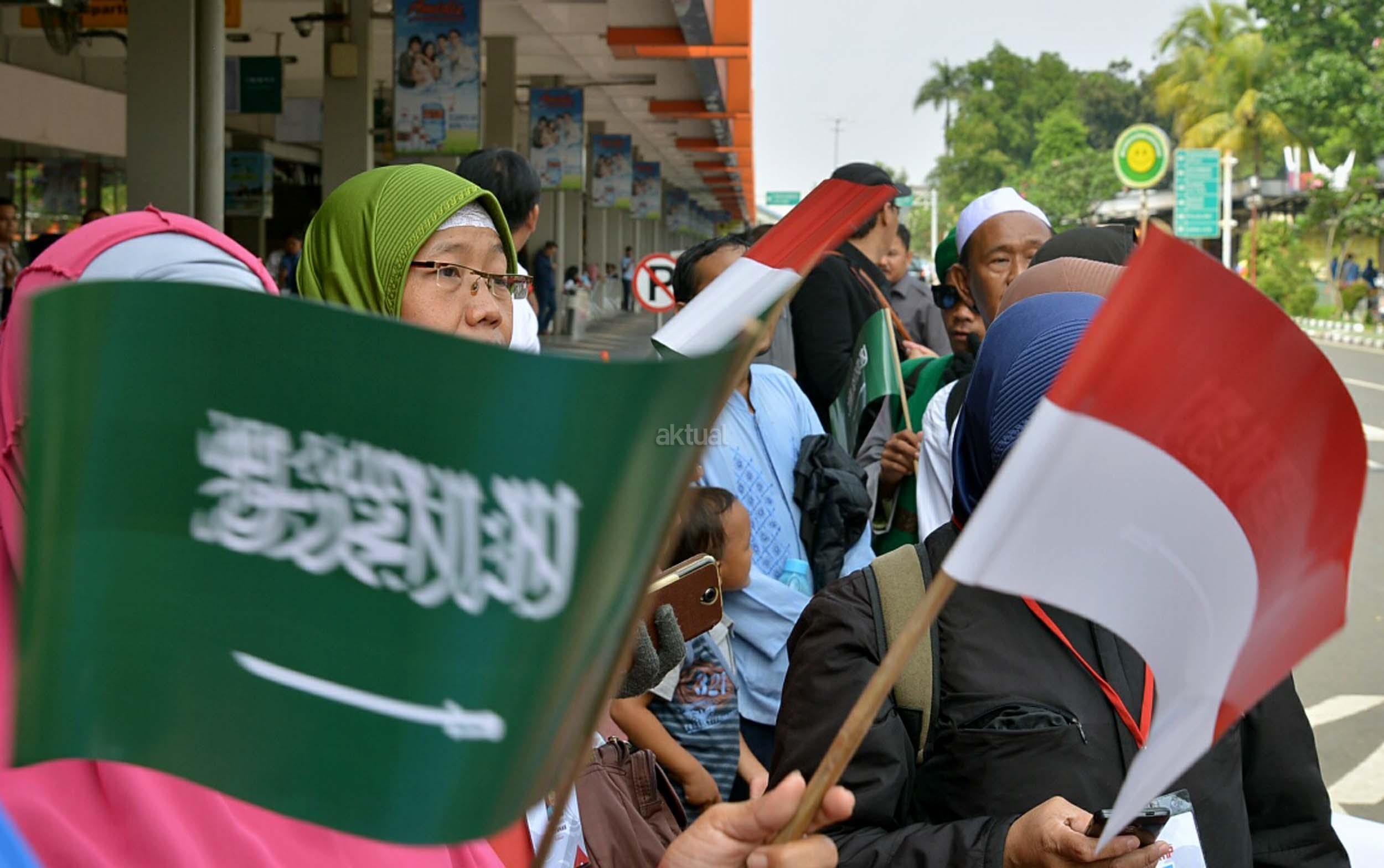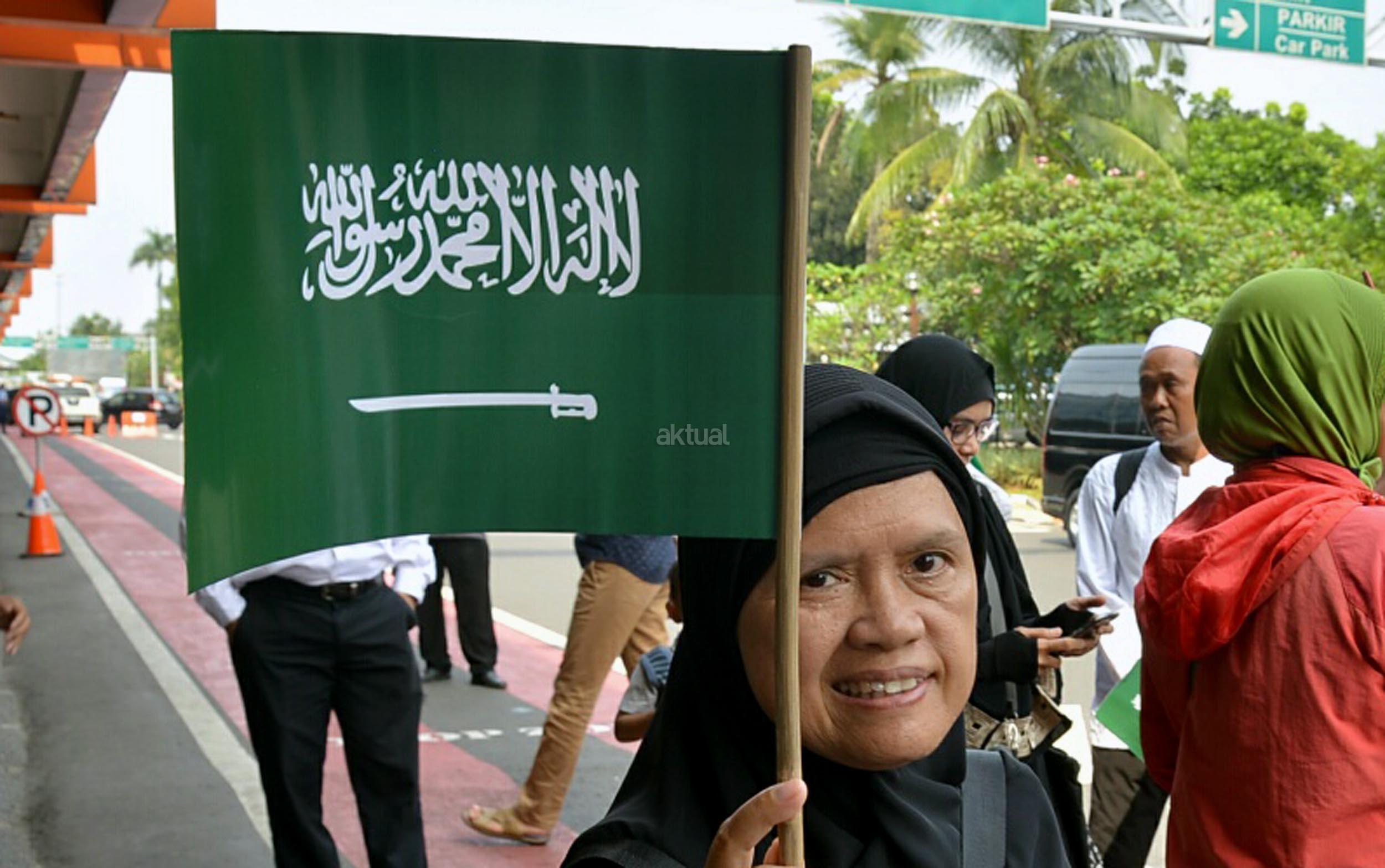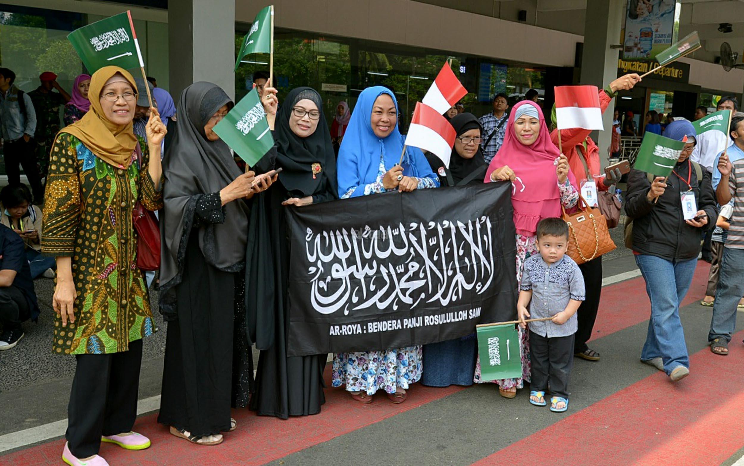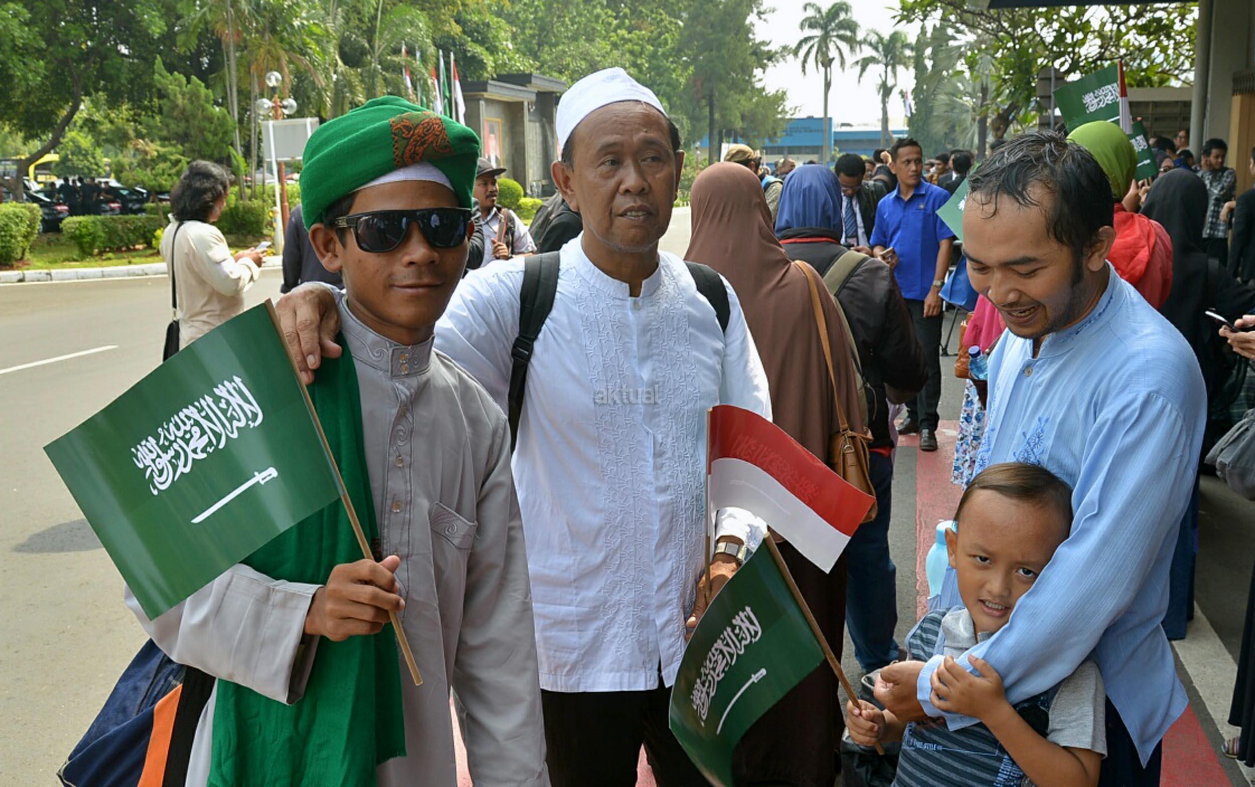 Sejumlah massa yang tergabung dalam Gerakan Muslimah Memilih Pemimpin (GMMP) menggelar aksi simpatik untuk menyambut kedatangan Raja Arab Saudi, Salman bin Abdulaziz Al-Saud di Bandara Halim Perdana Kusuma, Jakarta Timur, Rabu (1/3/2017). Diperkirakan Raja Salman dan rombongan tiba di Indonesia pada pukul 12.45 WIB untuk melakukan kerja sama bilateral dengan pemerintah Indonesia. AKTUAL/Munzir