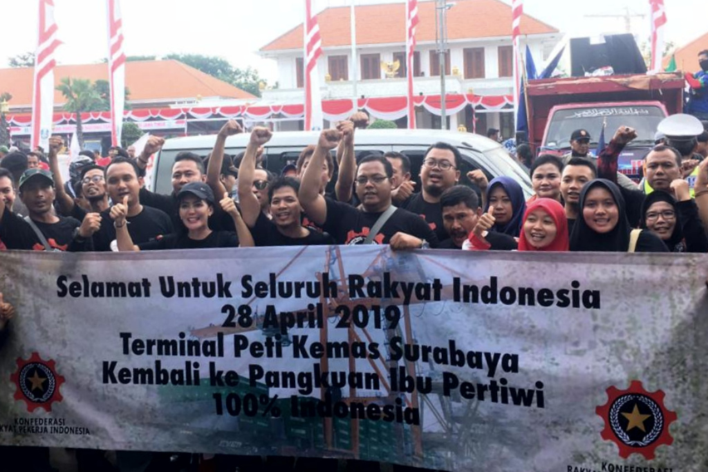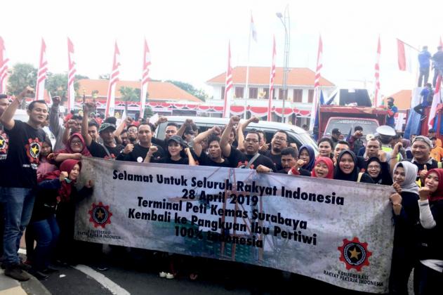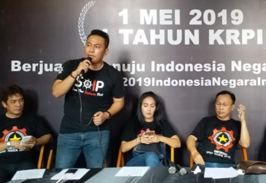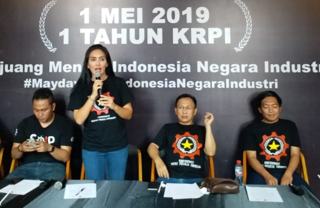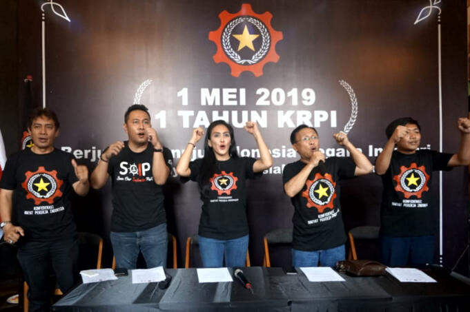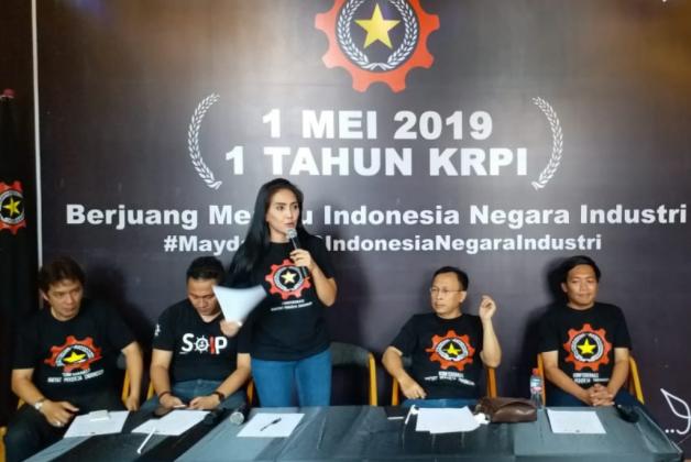 Ketua Umum Konfederasi Rakyat Pekerja Indonesia (KRPI) Rieke Diah Pitaloka dan Ketua Sektor Pekerja Maritim KRPI Nova Hakim saat diskusi bersama buruh yang tergabung dalam KRPI melakukan aksi Peringatan Hari Buruh Internasional (May Day) 2019 di Suabaya, Jawa Timur, Rabu (1/5). May Day tahun menjadi momentum bagi pekerja pelabuhan memperkuat solidaritas dan soliditas untuk menuntaskan agenda perjuangan. Diantaranya penghapusan outsourcing, upah layak bagi semua pekerja, pembatalan PHK sepihak pekerja di JICT, JAI dan Pelindo III, serta pengelolaan sepenuhnya pelabuhan oleh negara merupakan agenda perjuangan yang sudah dan akan terus dilakukan. AKTUAL/POOL-KRPI