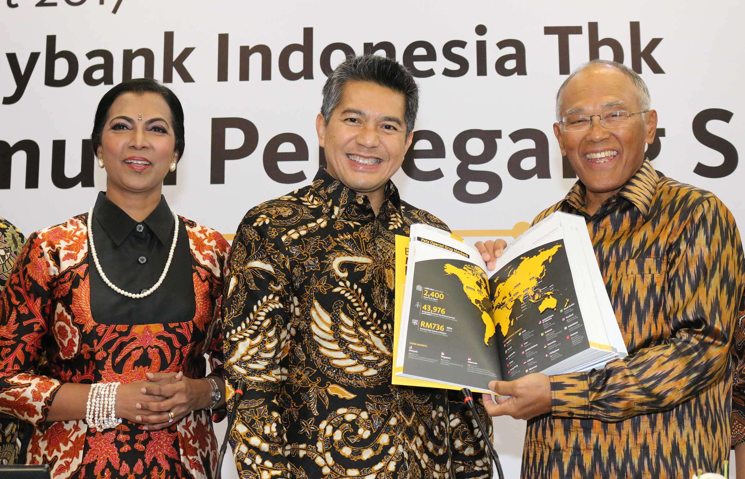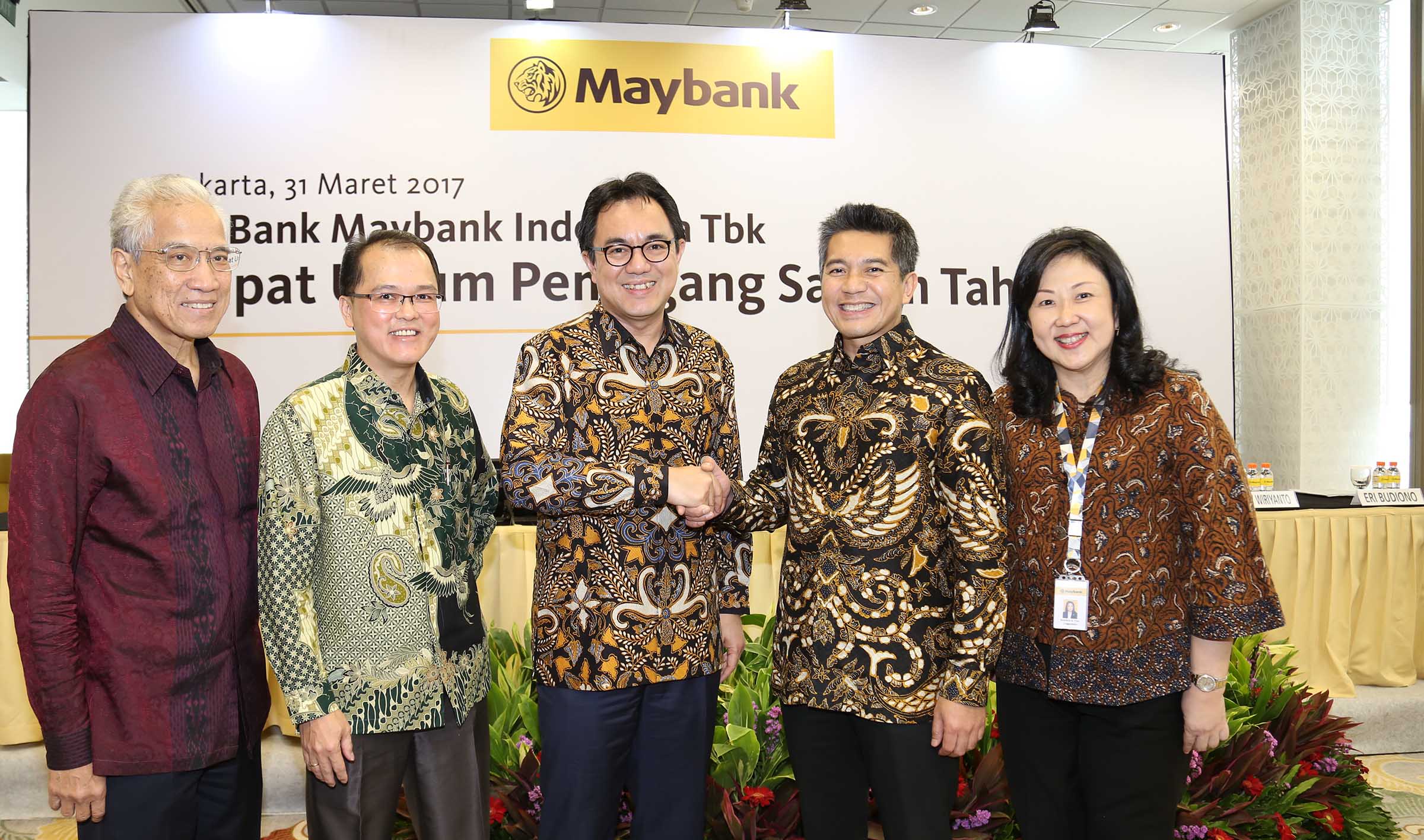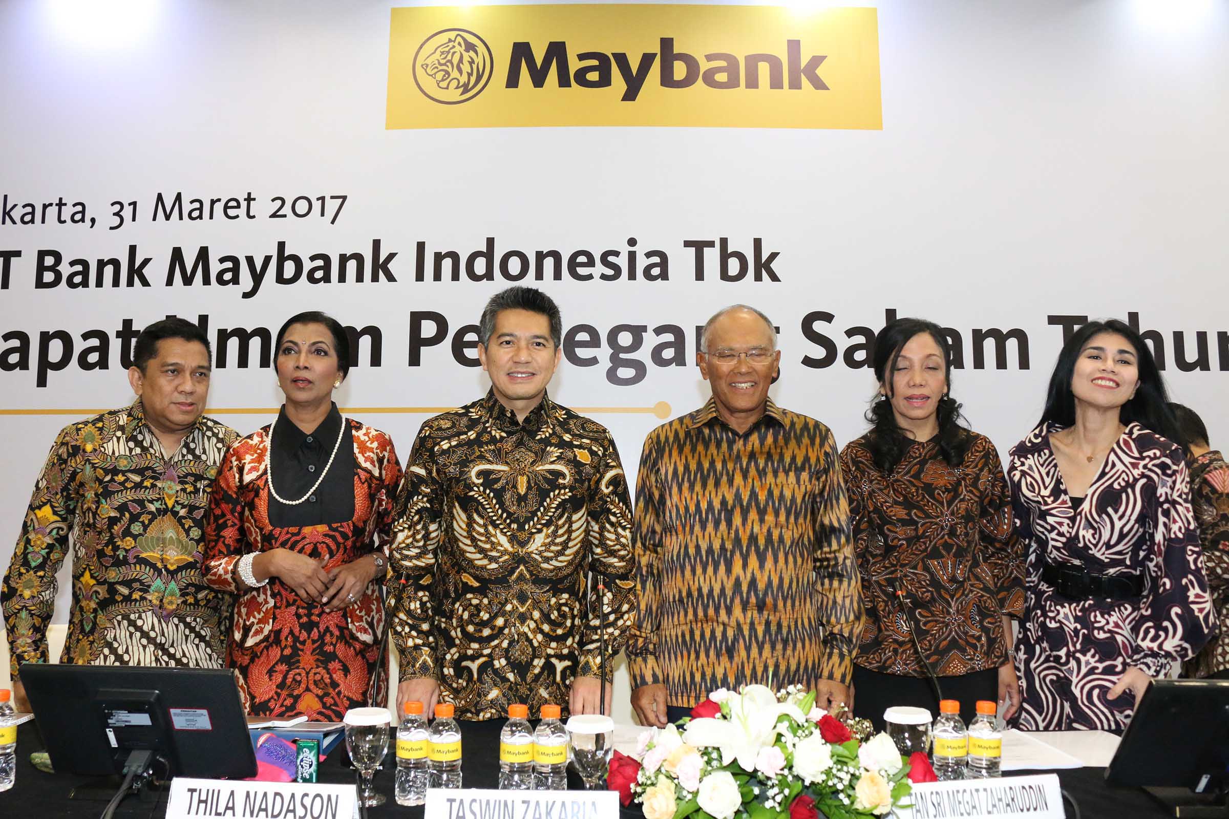 Presiden Direktur PT Bank Maybank Indonesia Tbk (Maybank Indonesia) Taswin Zakaria (tengah) bersama jajaran Direksi dan Komisaris menjelang Rapat Umum Pemegang Saham Tahunan (RUPST) di kantor pusat Maybank Indonesia, Jakarta, Jumat (31/3). RUPST menyetujui pembagian dividen sebesar 20% dari laba 2016 dan perubahan susunan Dewan Komisaris dan Direksi Maybank Indonesia. AKTUAL/Eko S Hilman
