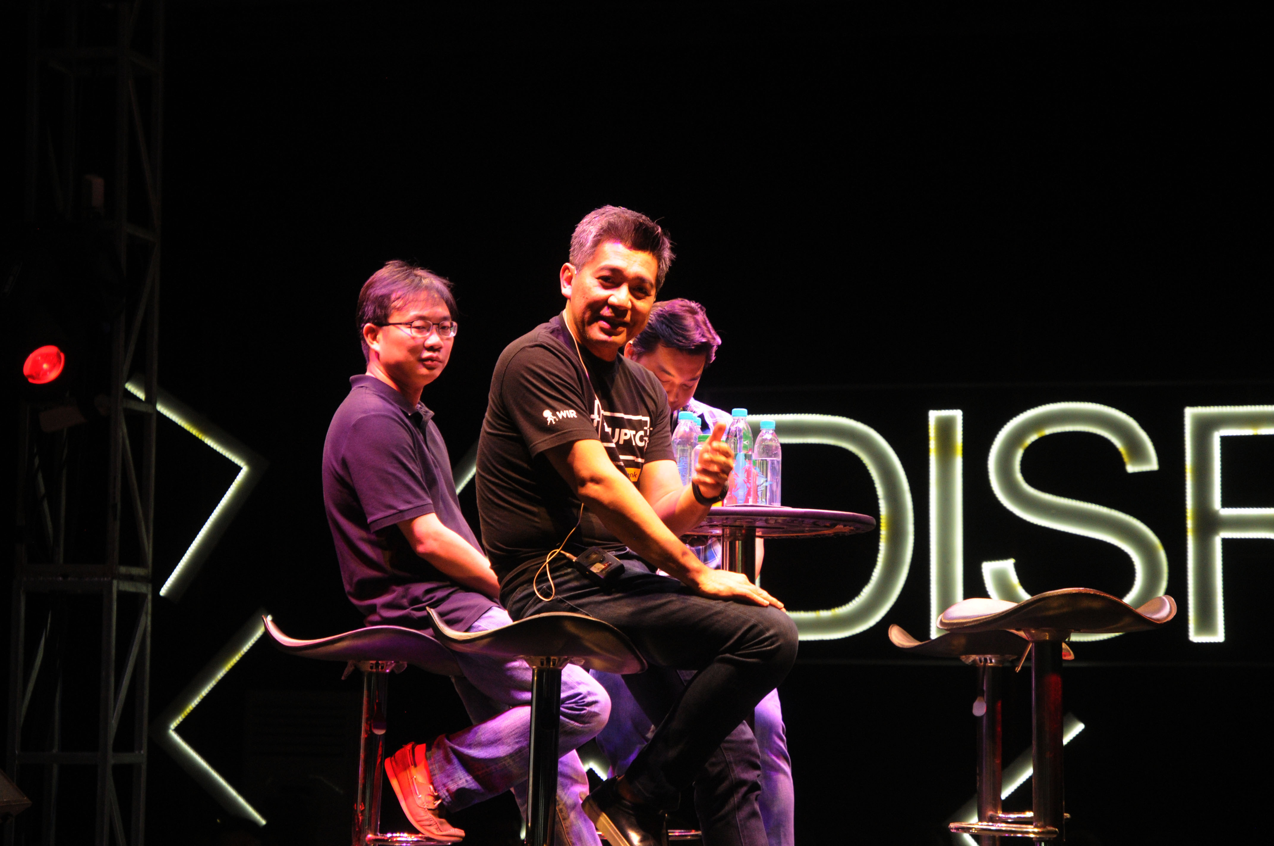 Presiden Direktur Maybank Indonesia Taswin Zakaria, Principal Kejora Ventures Andreas Surya dan CEO Duitku Rheza G Budiono, usai diskusi panel Disrupto 2018 di Plaza Indonesia Jakarta, Sabtu (24/11). Taswin Zakaria pada sesi ini membicarakan "Ekosistem industri finansial", yaitu tentang perkembangan dunia digital serta kolaborasi antara teknologi finansial dengan industri perbankan di Indonesia. AKTUAL/Eko S Hilman