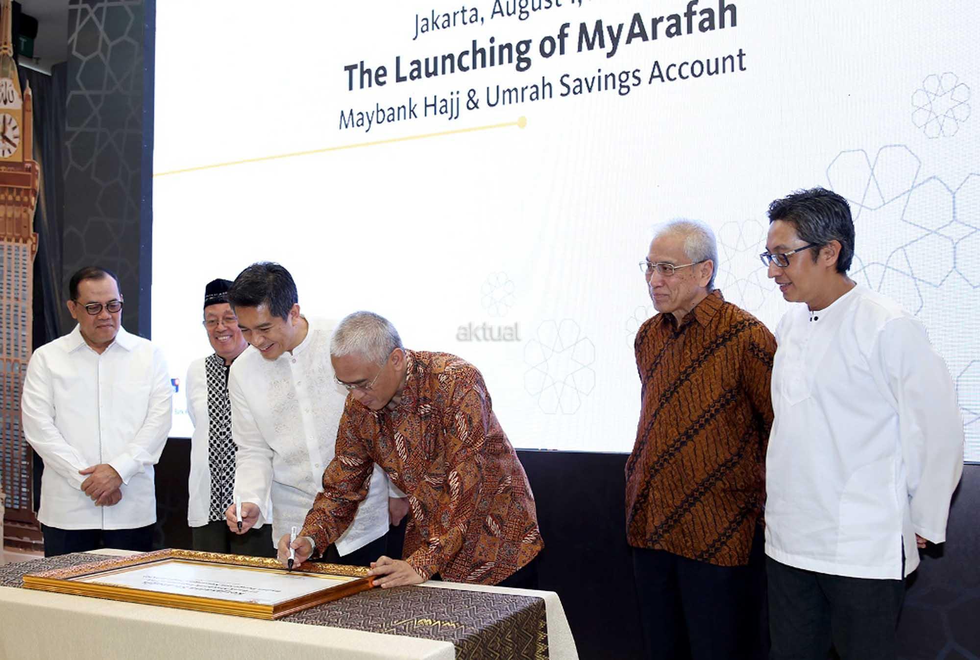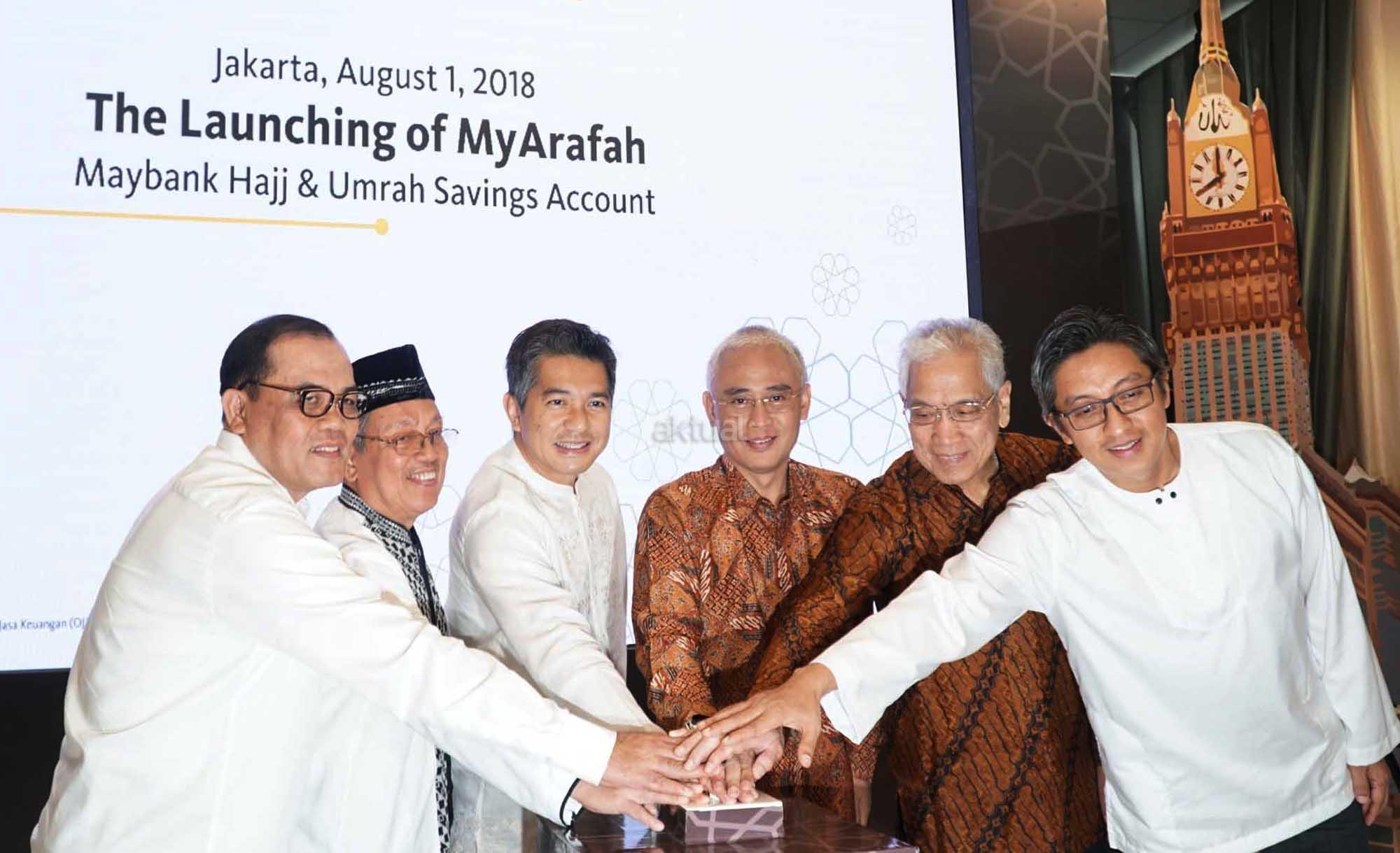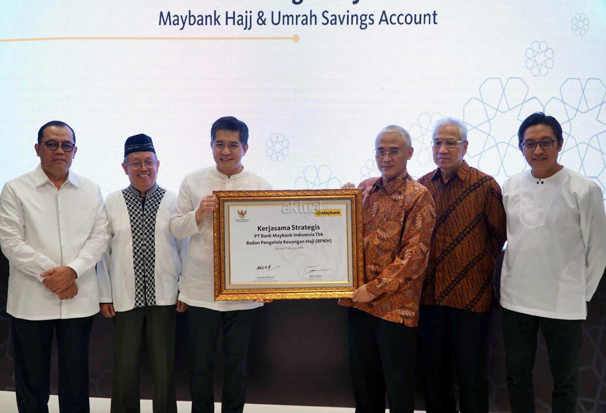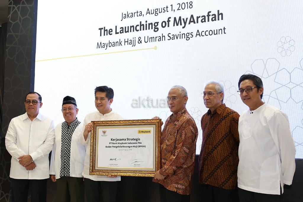 Dari kiri ke kanan, Komisaris Maybank Indonesia Hendar, Komisaris Maybank Indonesia Achjar Iljas, Presiden Direktur Maybank Indonesia Taswin Zakaria, Anggota Badan Pengelola Keuangan Haji (BPKH) Iskandar Zulkarnain, Komisaris Maybank Indonesia Edwin Gerungan, Head Sharia Banking (UUS) Maybank Indonesia Herwin Bustaman, memperlihatkan plakat kerjasama antara Maybank Indonesia dengan Badan Pengelola Keuangan Haji (BPKH) di Jakarta, Rabu (1/8). PT Bank Maybank Indonesia Tbk meluncurkan tabungan Haji dan Umrah bernama Tabungan “MyArafah”. Dalam peluncuran produk baru ini juga dilakukan penandatanganan kerja sama antara Maybank Indonesia dengan Badan Pengelola Keuangan Haji (BPKH). Tabungan “MyArafah” adalah tabungan dengan akad Mudharabah Mutlaqah untuk merencanakan ibadah Haji Reguler atau Umrah sesuai keinginan nasabah dengan sistem setoran bebas atau bulanan dalam mata uang Rupiah atau Dolar AS (USD). Penandatanganan kerja sama dengan BPKH dilakukan sehubungan penunjukan Maybank Indonesia sebagai salah satu Bank Penerima Setoran Biaya Penyelenggaraan Ibadah Haji (BPS-BPIH) periode April 2018–Maret 2021. AKTUAL/Eko S Hilman