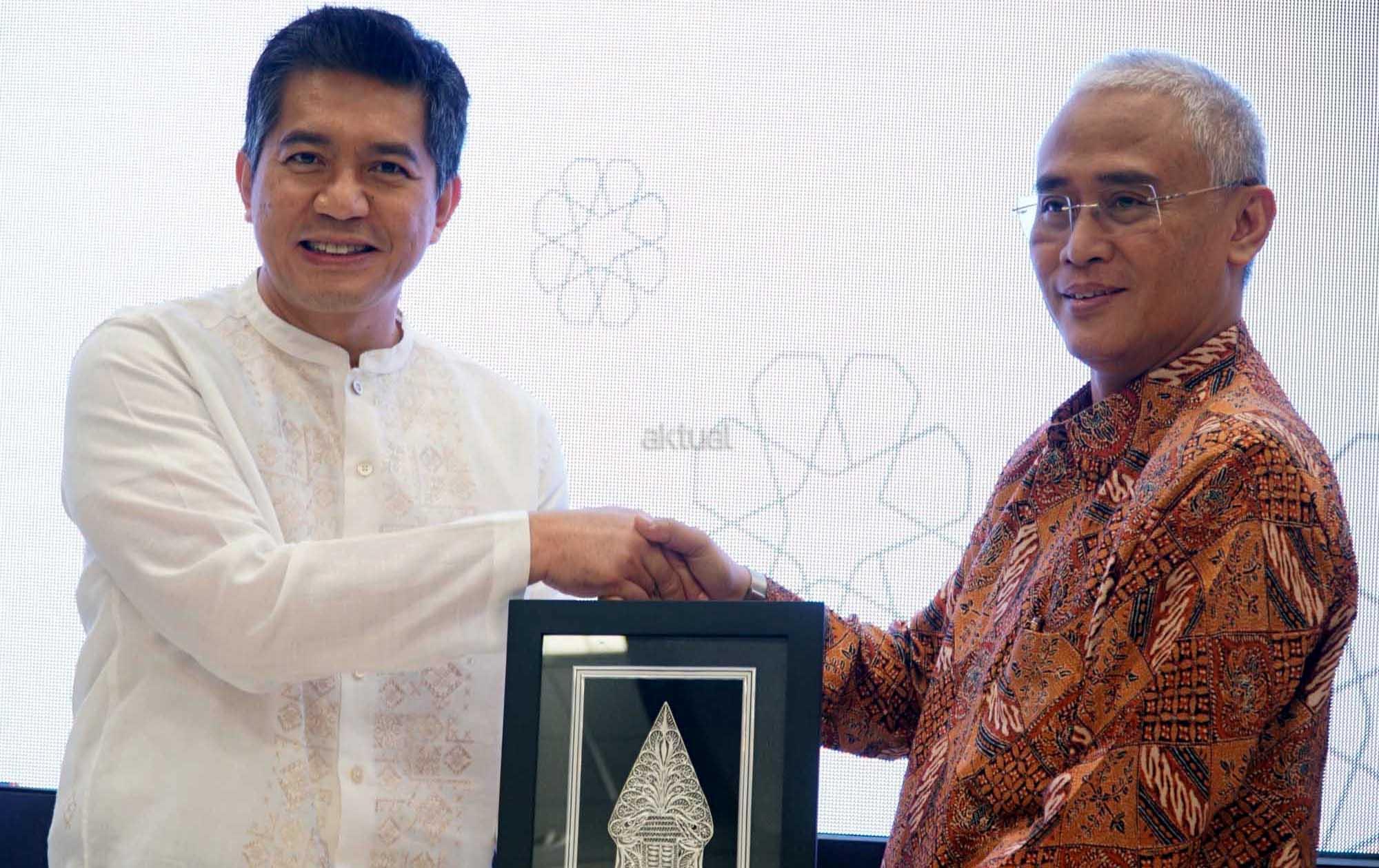 Presiden Direktur Maybank Indonesia Taswin Zakaria (kiri) bertukar cinderamata dengan Anggota Badan Pengelola Keuangan Haji (BPKH) Iskandar Zulkarnain, usai penandatanganan kerjasama antara Maybank Indonesia dengan Badan Pengelola Keuangan Haji (BPKH) di Jakarta, Rabu (1/8). PT Bank Maybank Indonesia Tbk meluncurkan tabungan Haji dan Umrah bernama Tabungan “MyArafah”. Dalam peluncuran produk baru ini juga dilakukan penandatanganan kerja sama antara Maybank Indonesia dengan Badan Pengelola Keuangan Haji (BPKH). Tabungan “MyArafah” adalah tabungan dengan akad Mudharabah Mutlaqah untuk merencanakan ibadah Haji Reguler atau Umrah sesuai keinginan nasabah dengan sistem setoran bebas atau bulanan dalam mata uang Rupiah atau Dolar AS (USD). Penandatanganan kerja sama dengan BPKH dilakukan sehubungan penunjukan Maybank Indonesia sebagai salah satu Bank Penerima Setoran Biaya Penyelenggaraan Ibadah Haji (BPS-BPIH) periode April 2018–Maret 2021. AKTUAL/Eko S Hilman