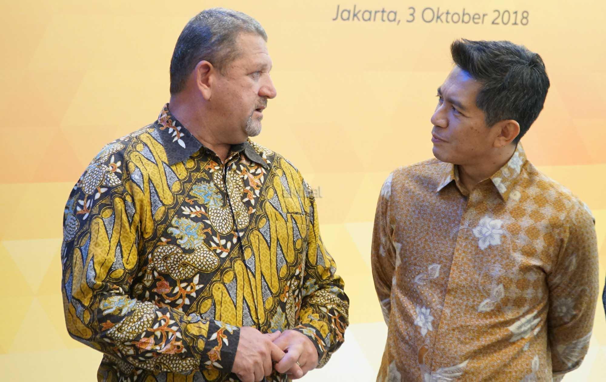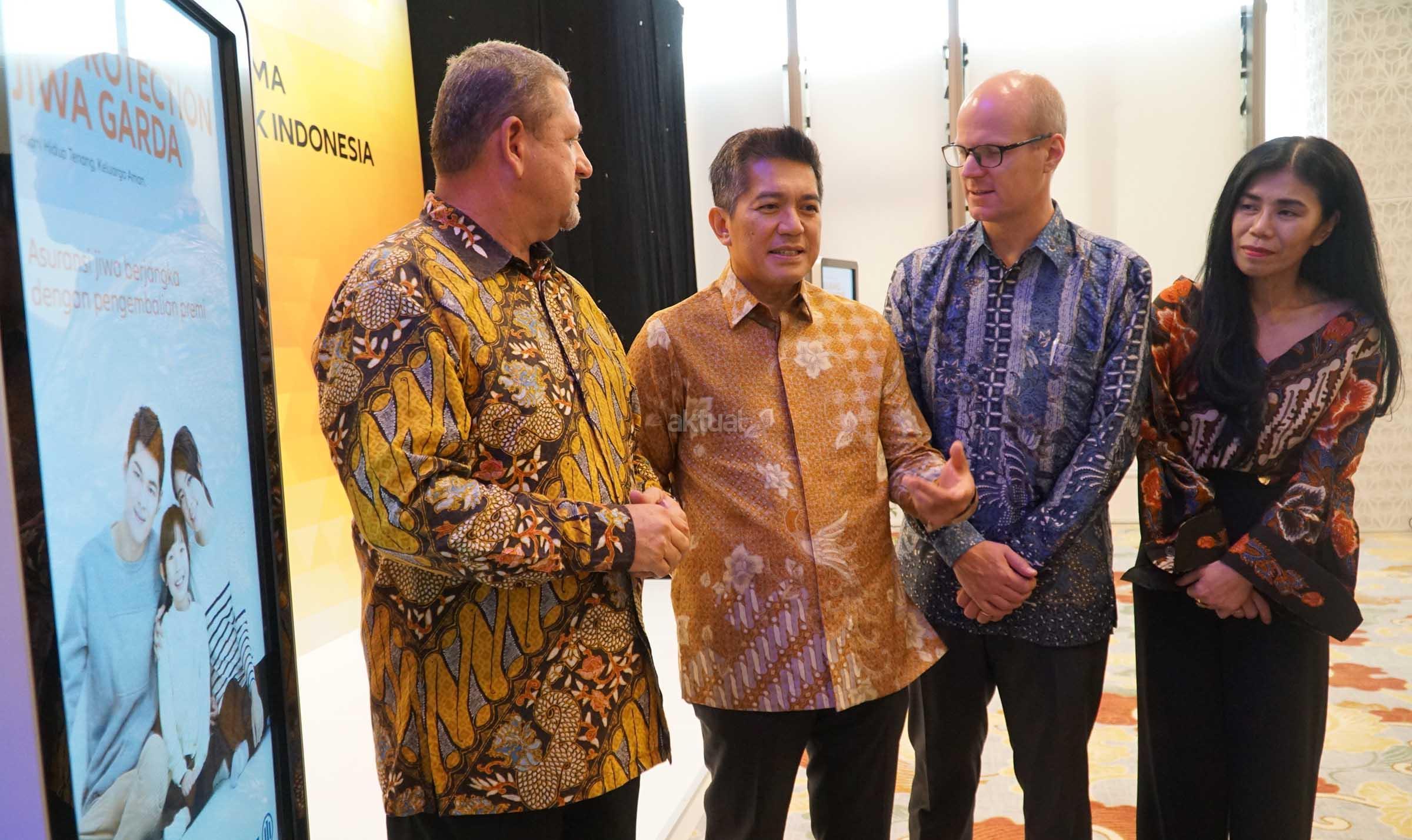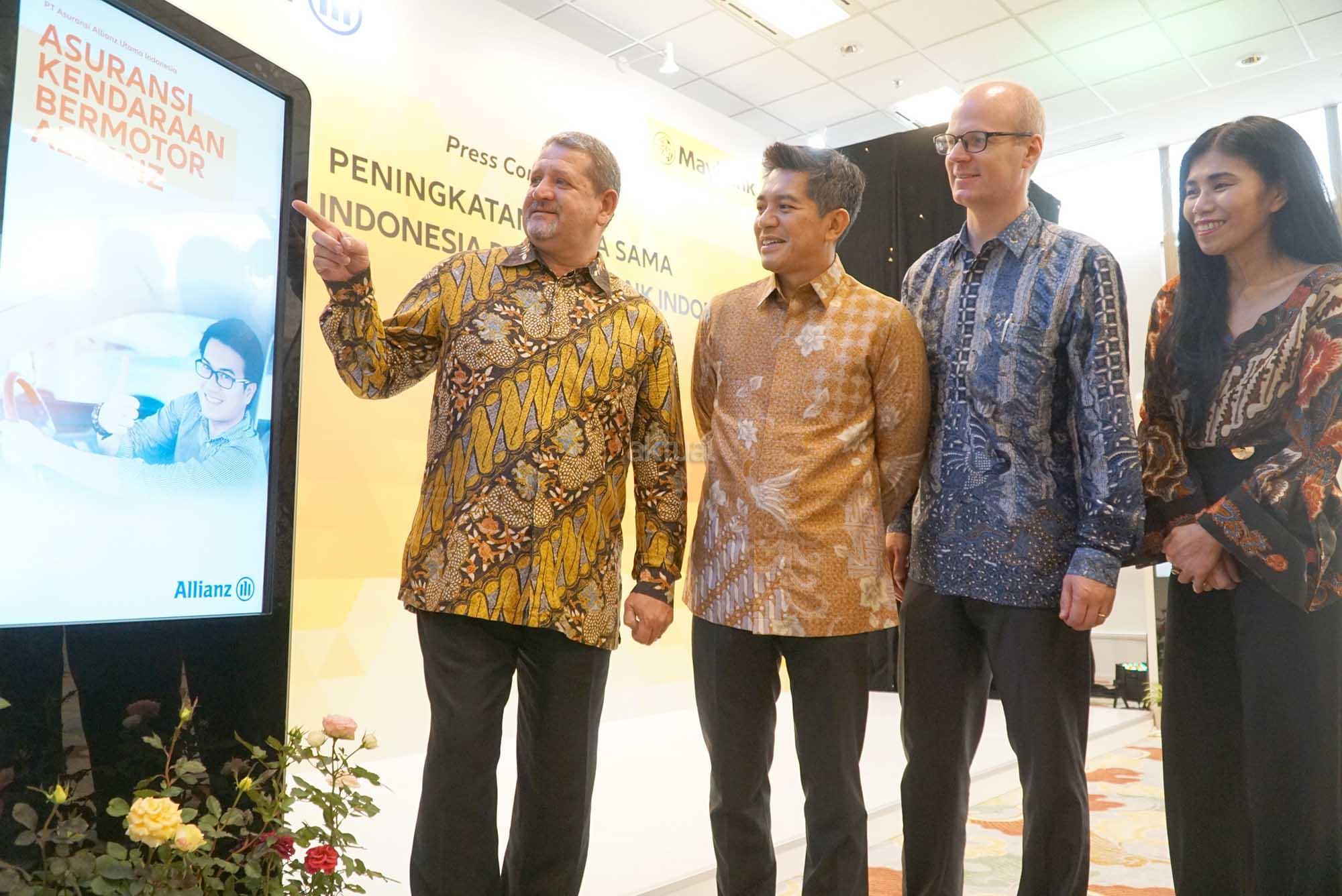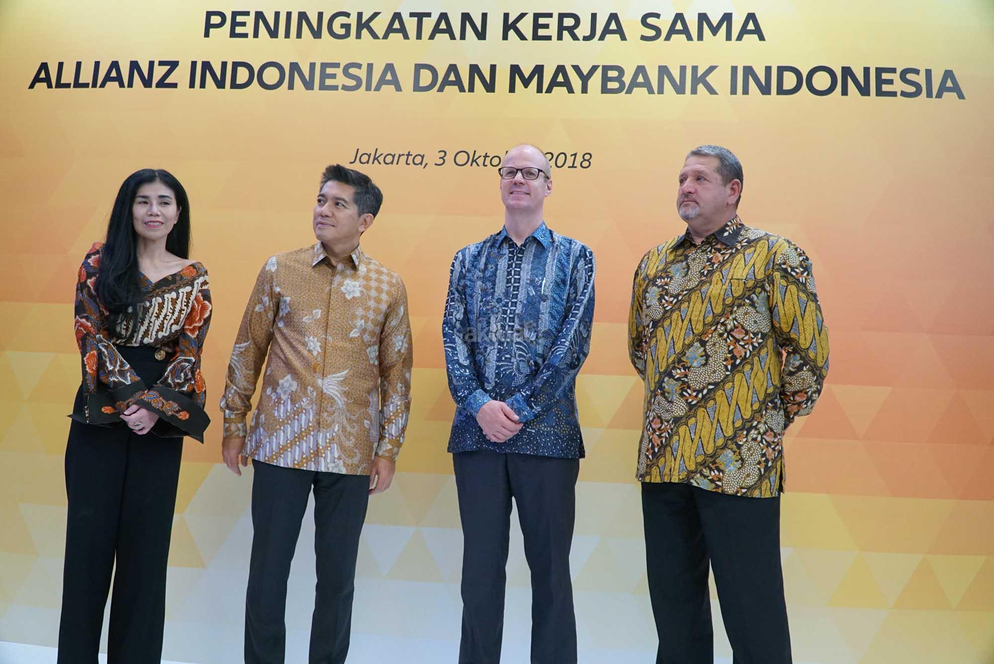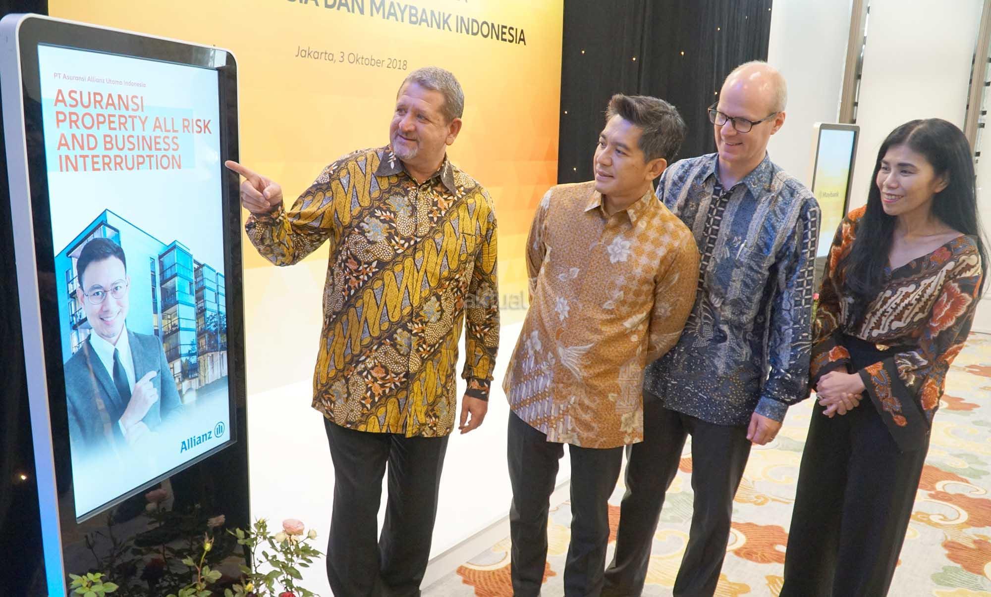 Presiden Direktur PT Bank Maybank Indonesia Tbk (Maybank Indonesia) Taswin Zakaria (kedua kiri), Direktur Community Financial Services Maybank Indonesia Jenny Wiriyanto (kanan), Country Manager & Direktur Utama Allianz Life Indonesia, Joos Louwerier (kedua kanan) dan Presiden Direktur Allianz Utama Indonesia Peter van Zyl (kiri) secara simbolis meresmikan peningkatan kemitraan strategis Maybank Indonesia-Allianz Indonesia di Jakarta, Rabu (3/10). Dengan memperluas ragam produk yang disediakan kepada nasabah Maybank Indonesia, mulai dari lini asuransi jiwa, kesehatan hingga kerugian (umum). Dalam kemitraan strategis ini, Maybank Indonesia, melalui jaringan cabangnya di seluruh Indonesia, akan menyediakan 12 produk asuransi yang diluncurkan Allianz yang terdiri dari 7 (tujuh) produk asuransi umum untuk harta benda dan 5 (lima) asuransi perlindungan jiwa dan kesehatan. Allianz Indonesia melalui PT Asuransi Allianz Life Indonesia (Allianz Life) telah menjalin kerja sama untuk distribusi pemasaran perbankan (Bancassurance) dengan Maybank Indonesia sejak 2016. AKTUAL/Eko S Hilman