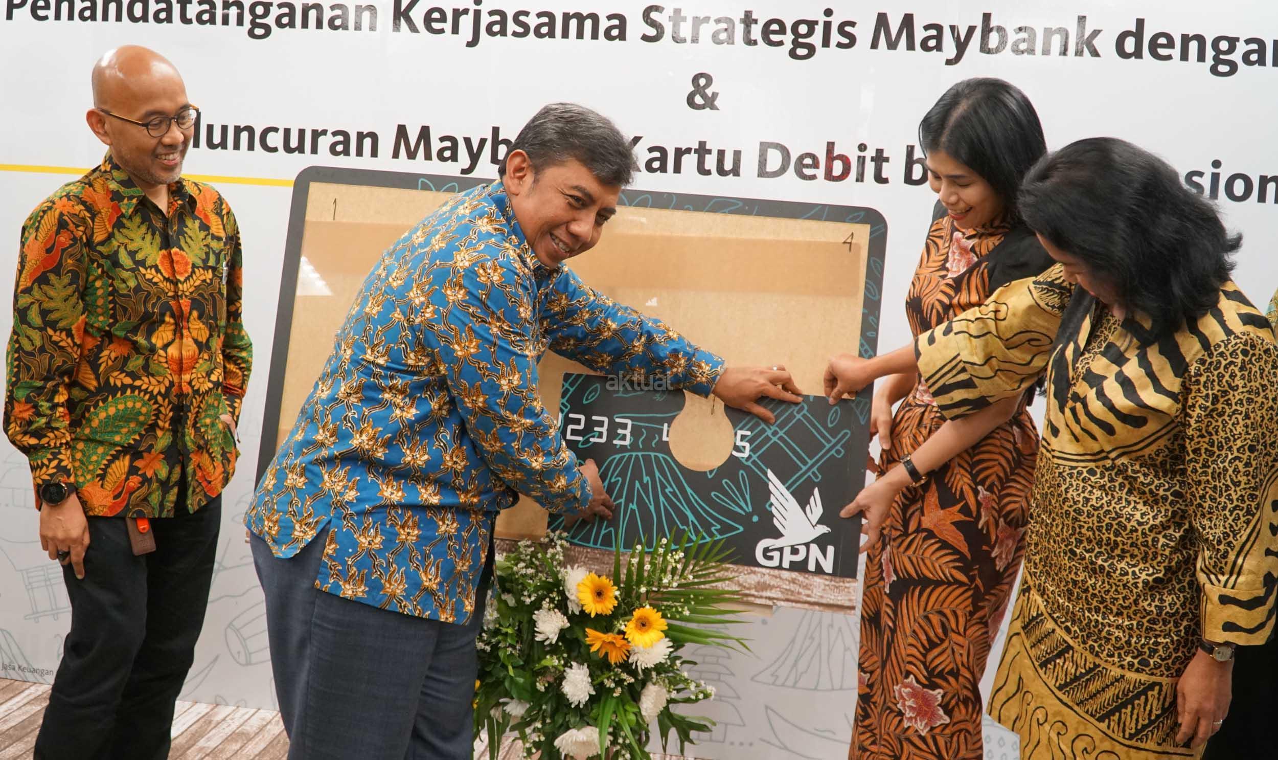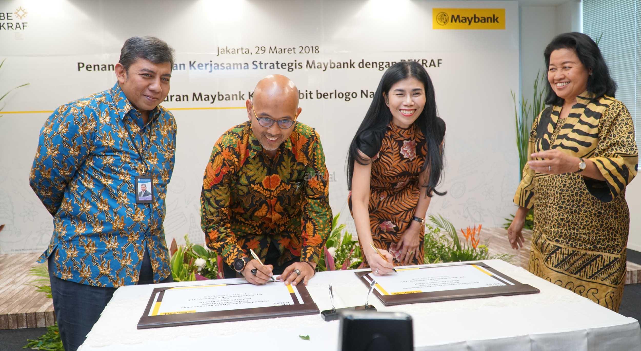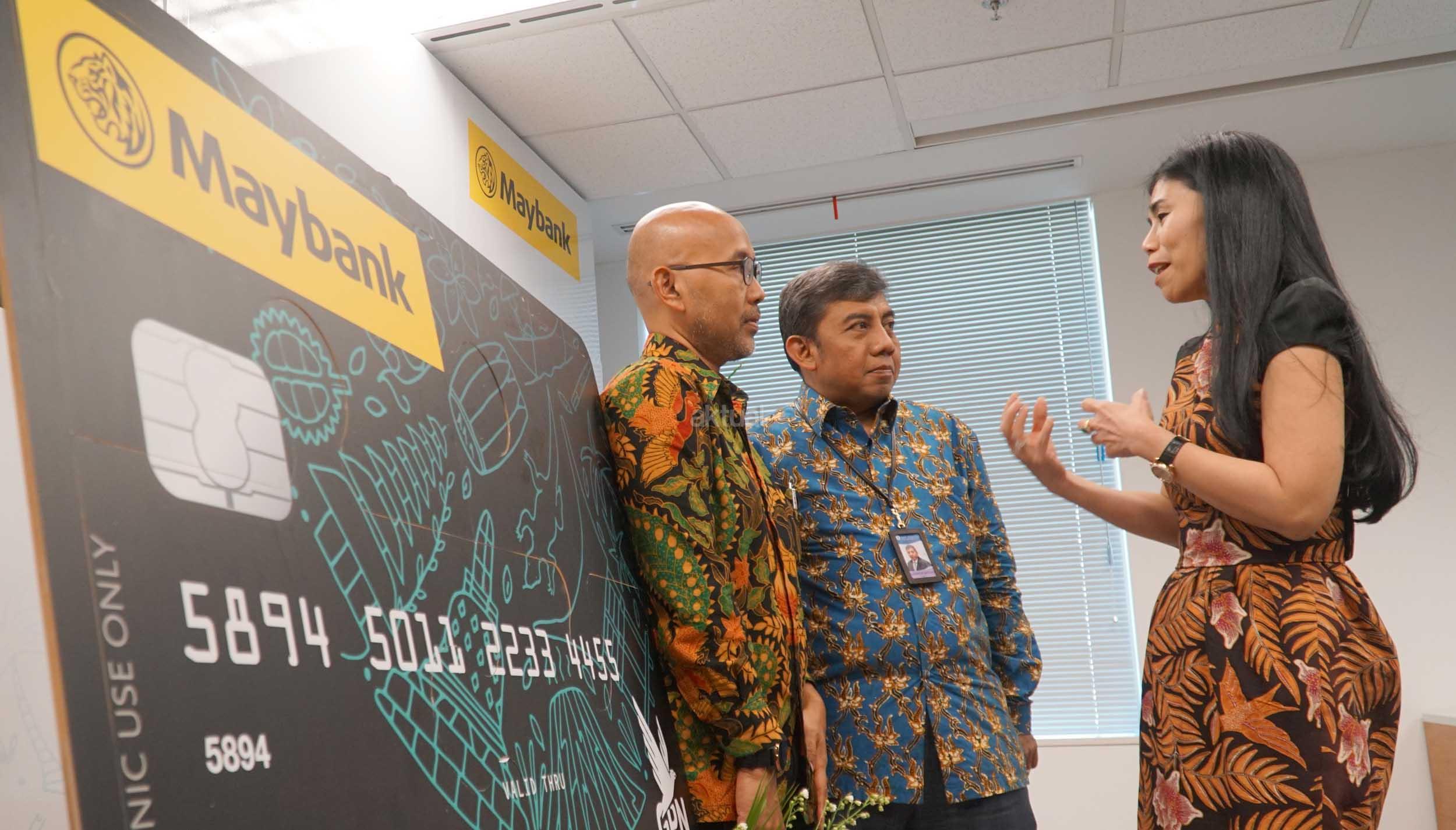 Jenny Wiriyanto, Direktur Community Financial Services (CFS) Maybank Indonesia (kanan) berbincang dengan Pungky P Wibowo , Kepala Departemen Elektronifikasi dan Gerbang Pembayaran Nasional Bank Indonesia (tengah) serta Fadjar Hutomo, Deputi Akses Permodalan Badan Ekonomi Kreatif (Bekraf) seusai peluncuran Kartu ATM/Debit Gerbang Pembayaran Nasional (GPN) yang dilaksanakan secara simbolis oleh Jenny Wiriyanto dan Pungky P. Wibowo di kantor pusat Maybank Indonesia, Senayan Jakarta (29/3). Maybank Indonesia mendukung kegiatan yang akan dilakukan Bekraf dalam memasarkan produk/jasa pelaku usaha ekonomi kreatif diantaranya pengadaan mesin EDC yang terintegrasi dengan GPN kepada para pelaku usaha ekonomi kreatif untuk pemrosesan transaksi perbankan dalam pengembangan dan pemasaran usaha. AKTUAL/Eko S Hilman