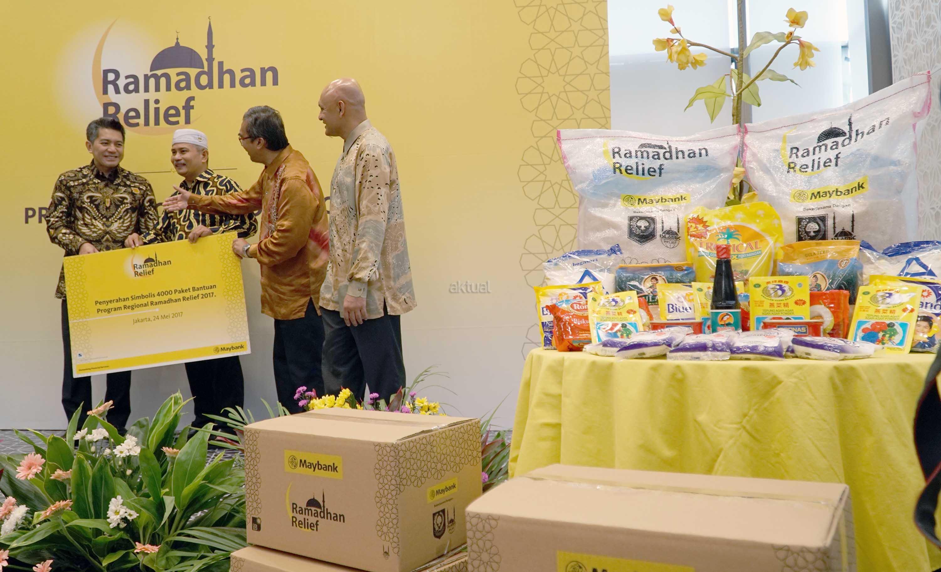 di kantor pusat Maybank Indonesia (24/5). Program Ramadhan Relief Maybank Islamic tahun ini memberikan bantuan pangan senilai RM2 juta kepada total lebih dari 58.000 penerima manfaat di empat negara ASEAN yaitu di Indonesia, Malaysia, Singapura dan Filipina.Di Indonesia, bantuan pangan akan disalurkan ke Pidi Jaya,Aceh dan Bima,NTB yang terkena dampak gempa bumi 6,5 skala richter di Pidi jaya dan Banjir bandang di Bima yang keduanya terjadi Desember 2016. Program Ramadhan Relief merupakan kemitraan dengan Islamic Relief Malaysia (IRM) yang memiliki mitra di Indonesia dan Filipina sementara di Singapura, mitra lokal dalam pelaksanaan program adalah Samrah Club.Tahun ini,Maybank Islamic memperluas jangkauan distribusi ke penerima manfaat lainnya dari Singapura, Indonesia dan Filipina, ketiga negara dimana Maybank memiliki basis dan eksistensi yang signifikan. AKTUAL/Eko Hilman