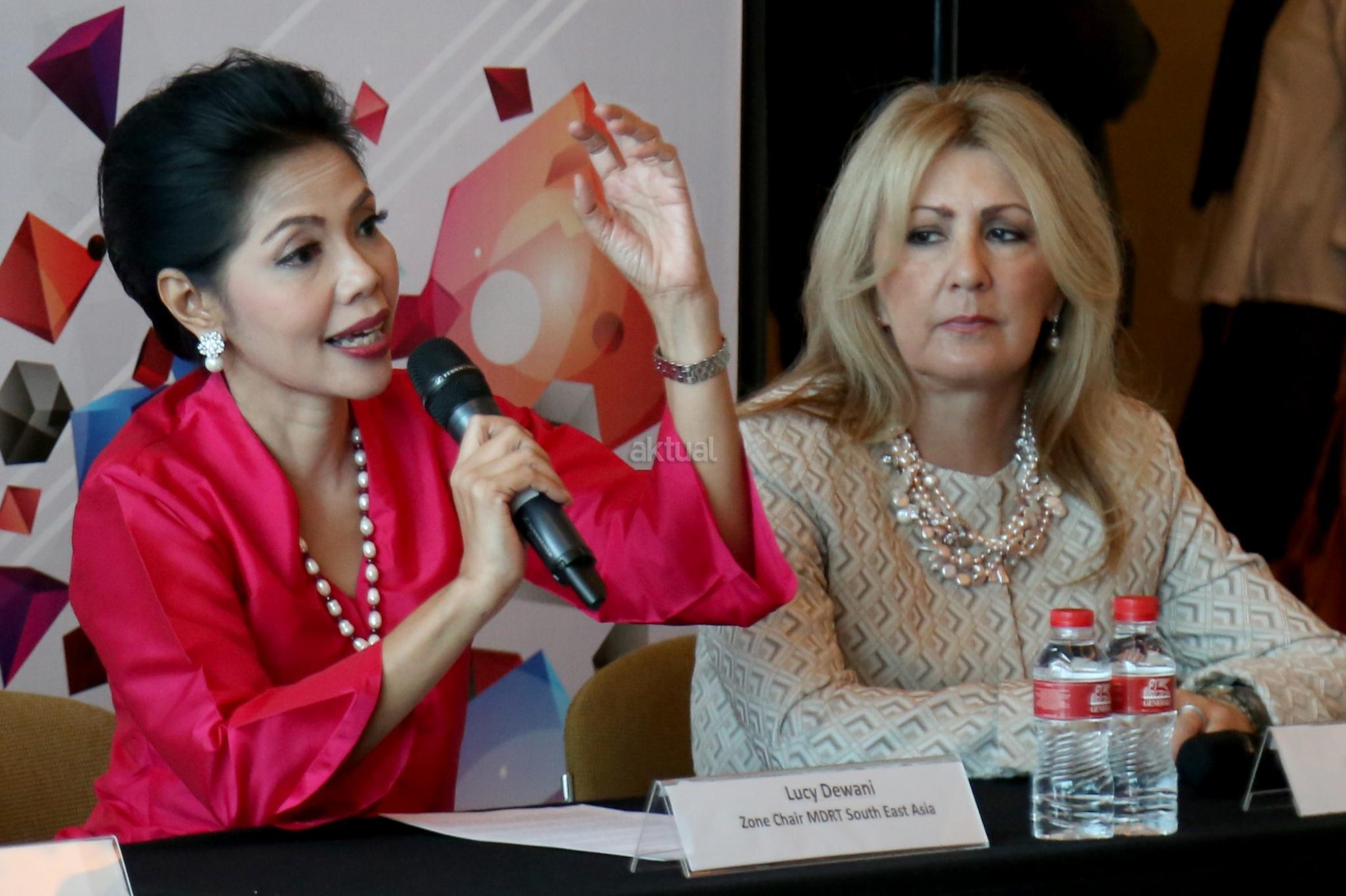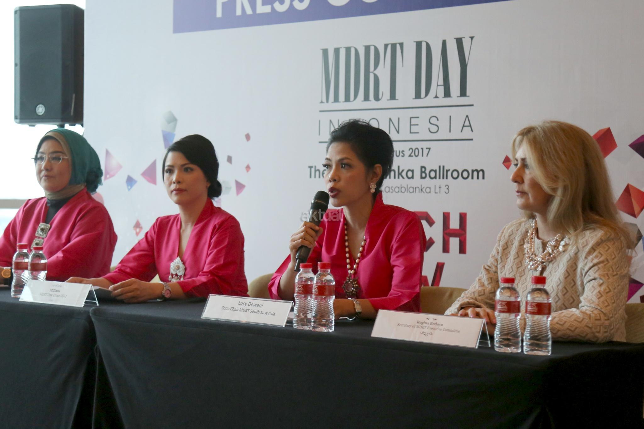 Chair MDRT South East Asia Lucy Dewani (kiri) didampingi Executive Committee MDRT Global Regina Bedoya saat konferensi pers acara seminar MDRT Day di Kasablanka Ballroom, Mall Kota Kasablanka, Jakarta, Rabu (23/8). Seminar yang mengambil tema “Reach New Heights” ini dengan tujuan memberikan wawasan dan berbagi kisah inspiratif di kalangan agen asuransi jiwa. Selain itu para pembicara lokal maupun mancanegara berbagi cara atau tips bagaimana mencapai level tinggi. AKTUAL/Tino Oktaviano
