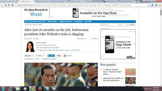 Jakarta, Aktual.co — Presiden Joko Widodo kembali “dibully” oleh media asing. Kali ini harian terbesar di Australia Sydney Morning Herald. Koran tersebut menunjukkan banyak kesalahan yang dilakukan Jokowi selama perjalanan waktu 6 bulan pemerintahan.