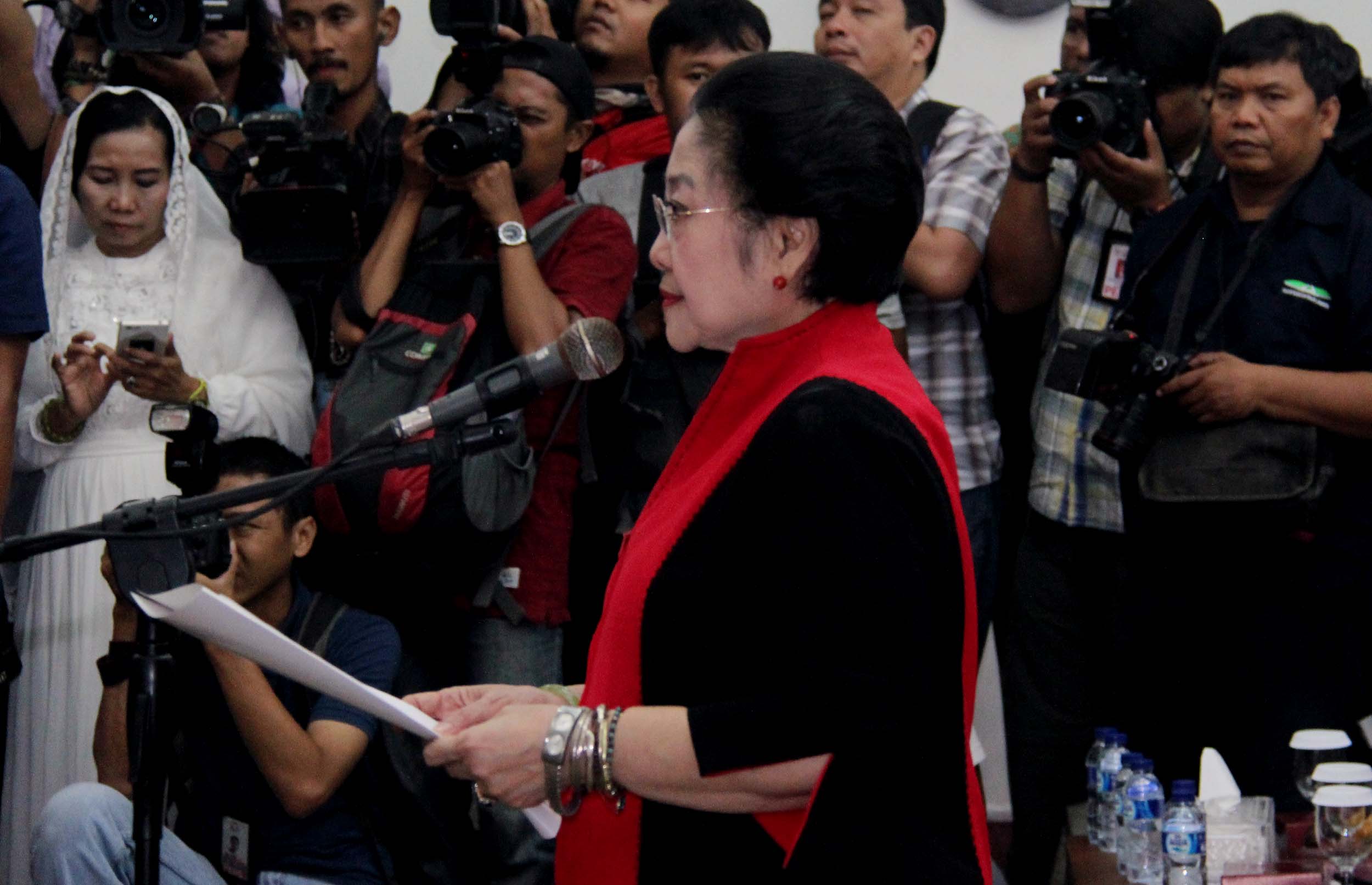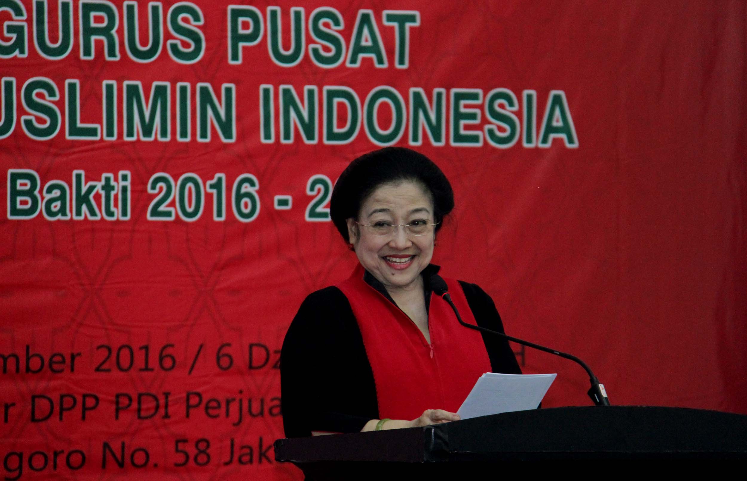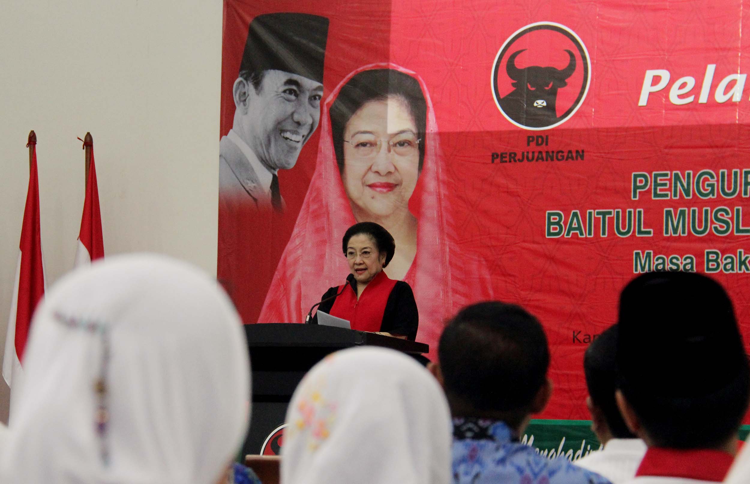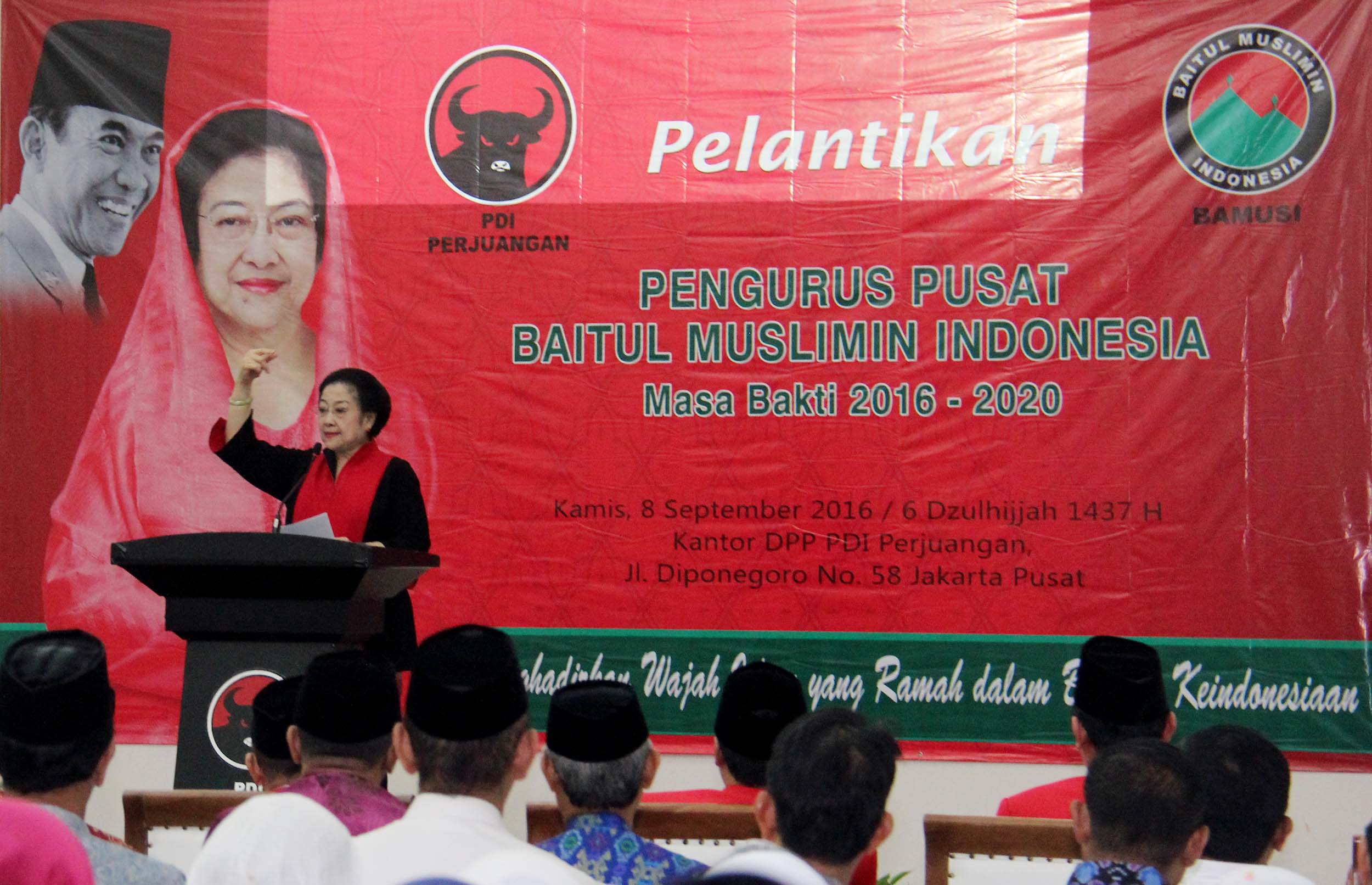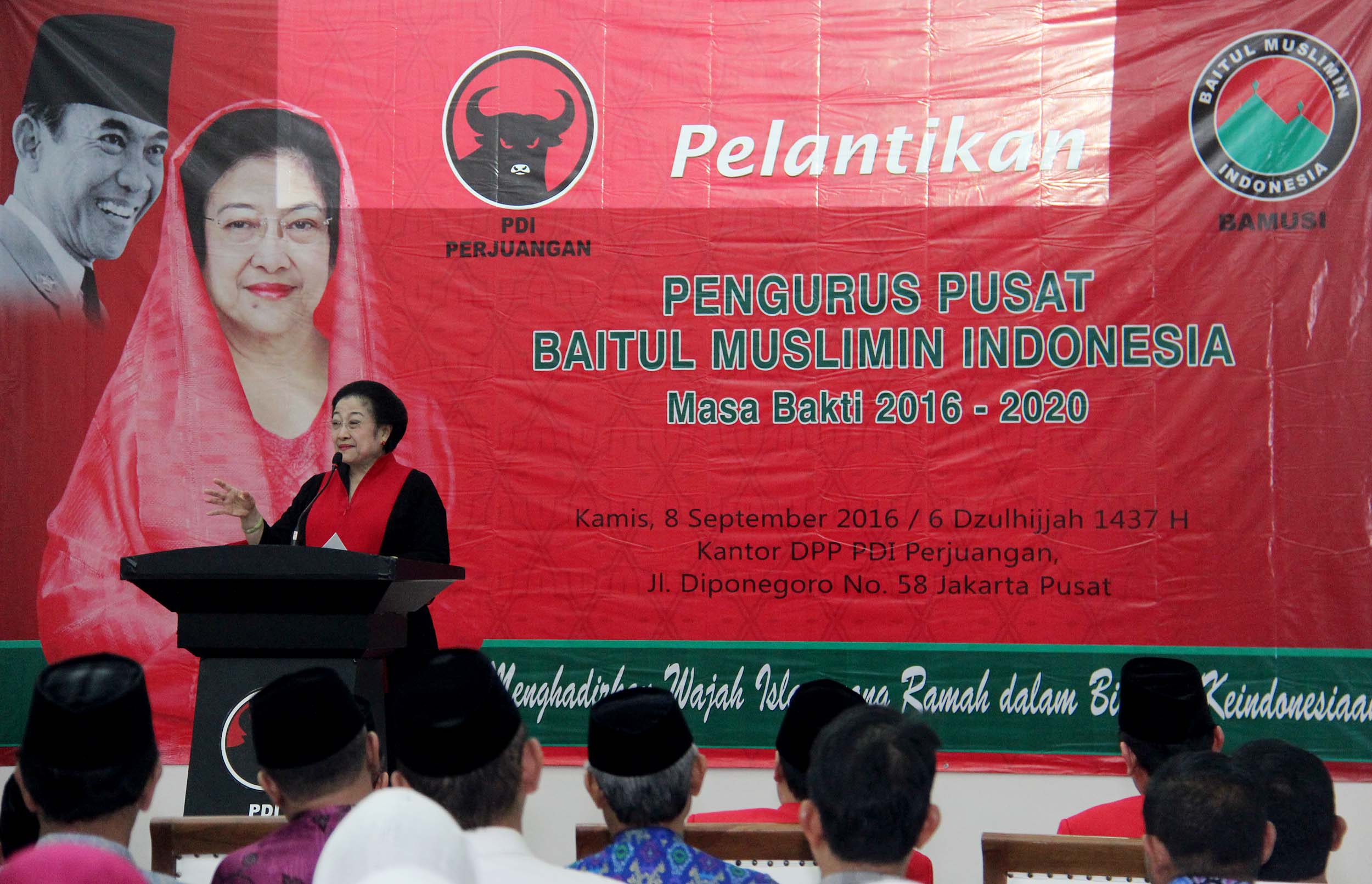 Ketua Umum PDI Perjuangan Megawati Soekarnoputri memberikan arahan kepada para Pengurus Pusat Baitul Muslimin Indonesia masa bakti 2016-2020 usai dilantik di Kantor DPP PDI Perjuangan, Menteng, Jakarta Pusat, Kamis (8/9/2016). Pelantikan tersebut mengambil tema “Menghadirkan Wajah Islam yang Ramah Dalam Bingkai Keindonesiaan”.