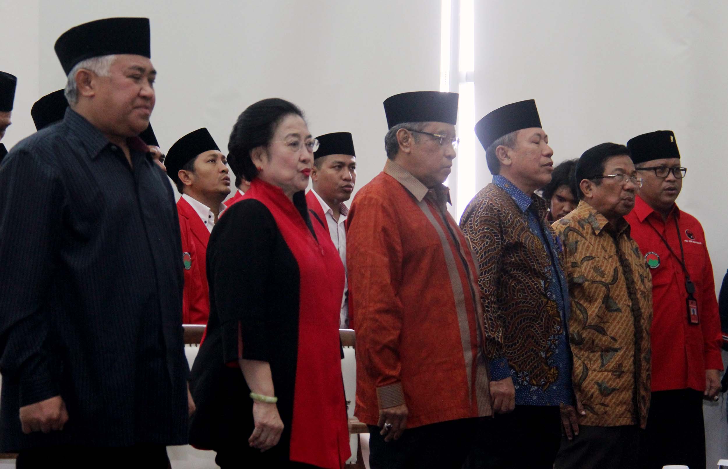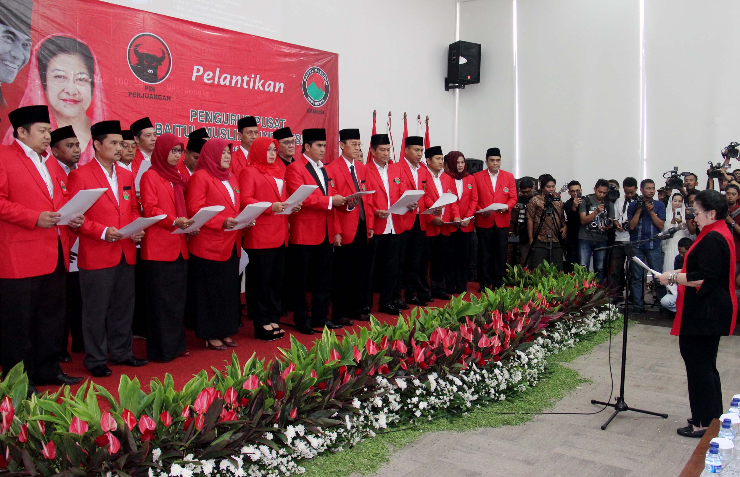 Ketua Umum PDI Perjuangan Megawati Soekarnoputri (kiri) memimpin pembacaan ikrar ketika melantik Pengurus Pusat (PP) Baitul Muslimin Indonesia masa bakti 2016-2020 di Kantor DPP PDI Perjuangan, Menteng, Jakarta Pusat, Kamis (8/9/2016). Pelantikan tersebut mengambil tema “Menghadirkan Wajah Islam yang Ramah Dalam Bingkai Keindonesiaan”.