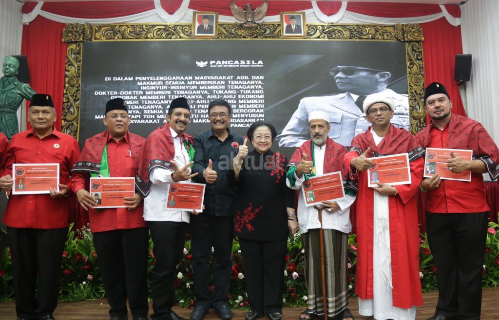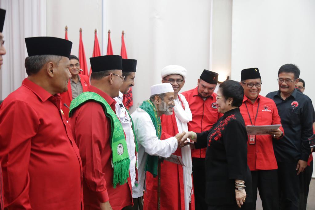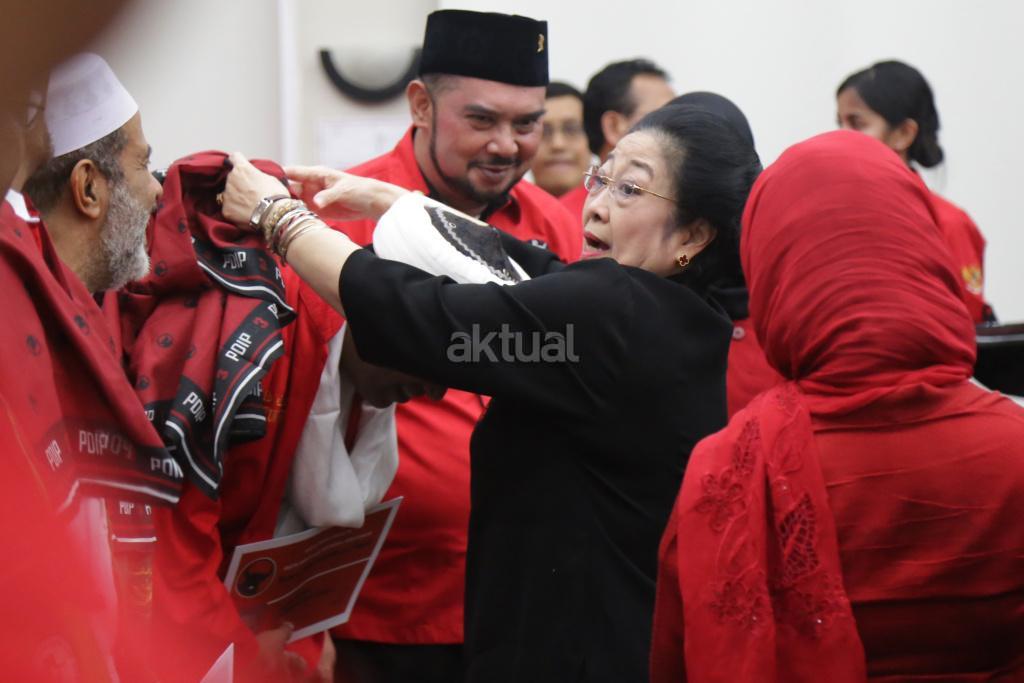 Ketua Umum DPP PDI Perjuangan Megawati Soekarnoputri memakaikan syal kepada Tokoh Agama dalam acara penyerahan kartu tanda anggota (KTA) PDI Perjuangan, di Kantor DPP PDI Perjuangan, Jakarta, Selasa (2/4/2019). AKTUAL/Tino Oktaviano