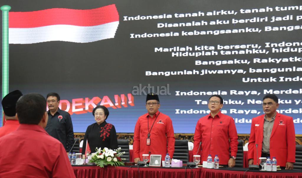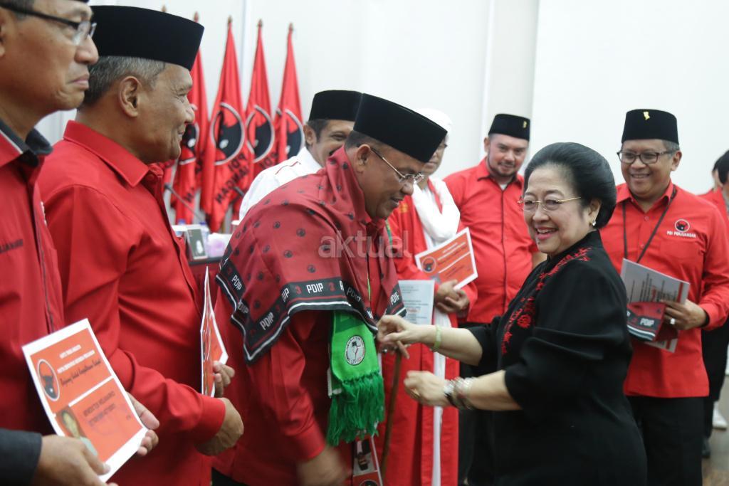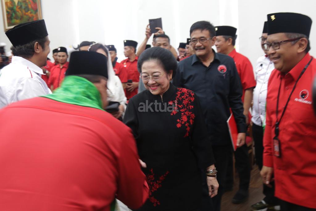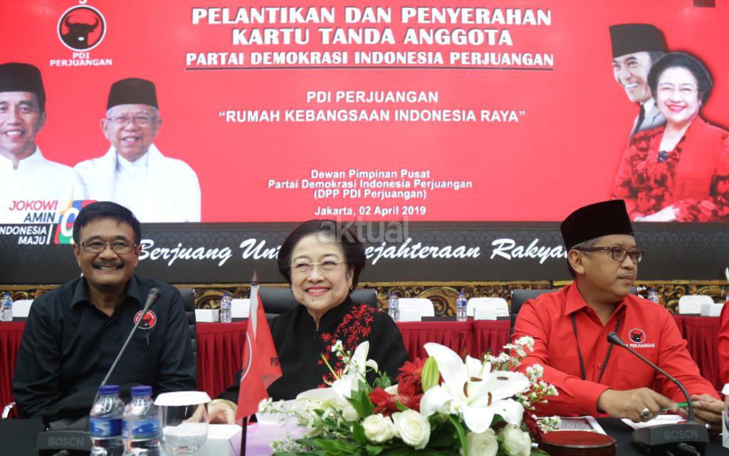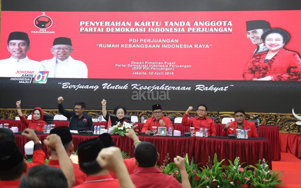 Ketua Umum DPP PDI Perjuangan Megawati Soekarnoputri didampingi Sekjen PDI-P Hasto Kristiyanto dan Ketua DPP PDIP Bidang Organisasi Djarot Saiful Hidayat saat acara penyerahan kartu tanda anggota (KTA) PDI Perjuangan, di Kantor DPP PDI Perjuangan, Jakarta, Selasa (2/4/2019). AKTUAL/Tino Oktaviano
