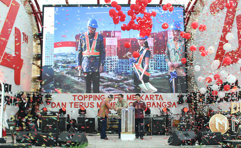 Chief Marketing Officer PT Mahkota Sentosa Utama (Meikarta) Ferry Tahir (tengah), CSCEC Indonesia Representative Liang Dingsong (kiri) dan General Manager CSCEC for Civil Engineering Co Ltd Zhang Zu (kanan) melakukan penekanan tombol di atas panggung District 1 Meikarta, Bekasi, Jawa Barat, Sabtu (17/8/2019). Topping off dilaksanakan untuk 4 menara apartemen di dua blok di Meikarta. AKTUAL/Dok Meikarta