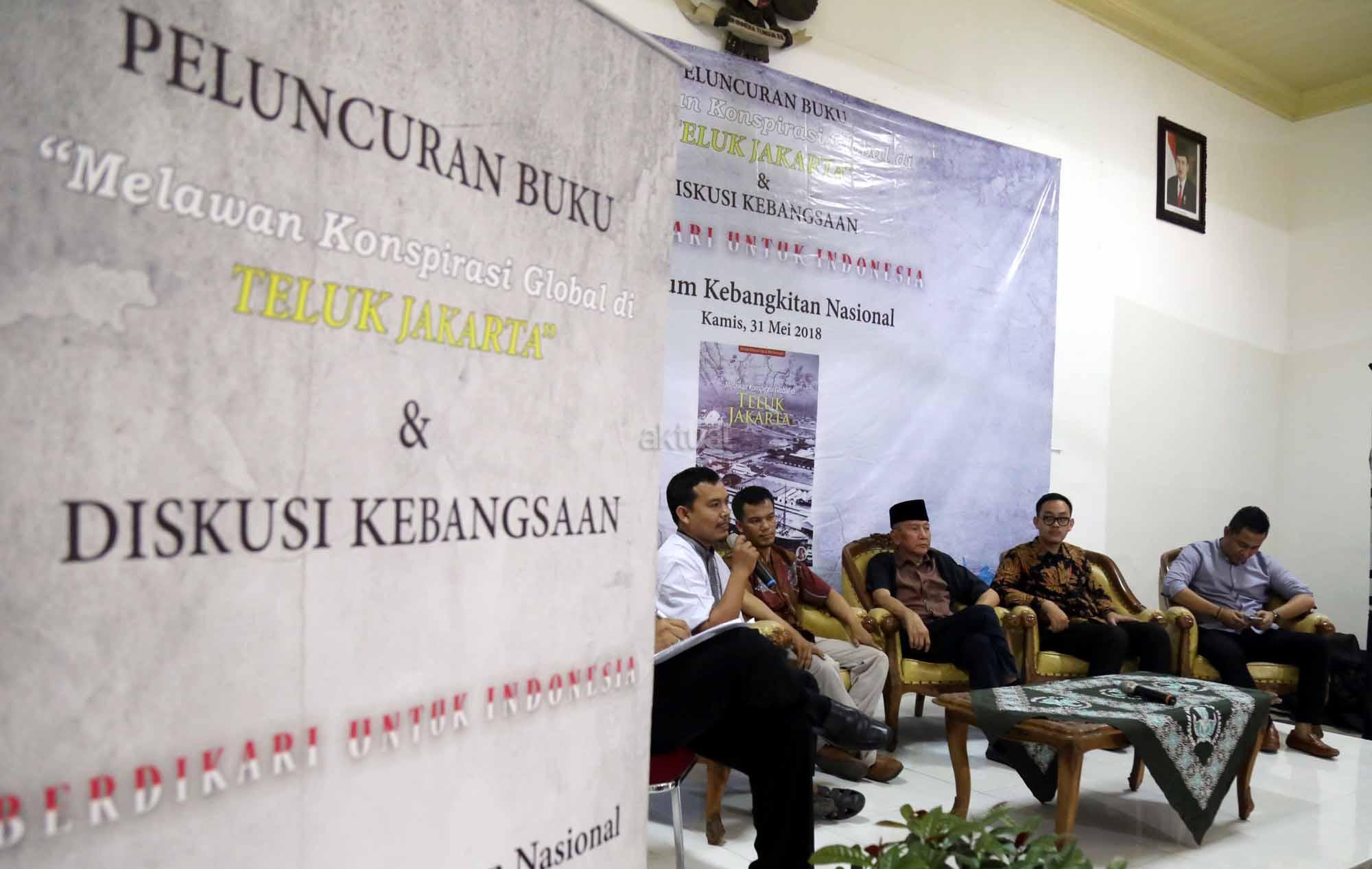 Penulis Buku Melawan Konspirasi Global di Teluk Jakarta Ahmad Khoirul, Penulis Buku Melawan Konspirasi Global di Teluk Jakarta Md Aminudin, Mantan Mensesneg Bondan Gunawan, Peneliti Indef Bima Yudstira dan Ketua Federasi Pekerja Pelabuhan Indonesia (FPPI) Nova Sofyan Hakim saat peluncuran buku Melawan Konspirasi Global di Teluk Jakarta dan diskusi kebangsaan Berdikari untuk Indonesia di Museum Kebangkitan Nasional, Jakarta, Kamis (31/5/18). Buku tersebut menceritakan sebuah konspirasi global yang bertabrakan dengan semangat berdikari sekaligus perwujudan Nawacita dalam pengelolaan gerbang ekonomi Indonesia yakni terminal petikemas JICT dan TPK Koja, Jakarta Utara. Hampir 20 tahun JICT dan TPK Koja banyak kemajuan dan terobosan yang dilakukan para pekerja, demi mendukung pertumbuhan ekonomi Indonesia. Namun, pengelolaan kedua pelabuhan ini akan dilanjutkan kembali dengan Hutchison Port milik taipan Hong Kong Li Ka Shing. AKTUAL/Tino Oktaviano