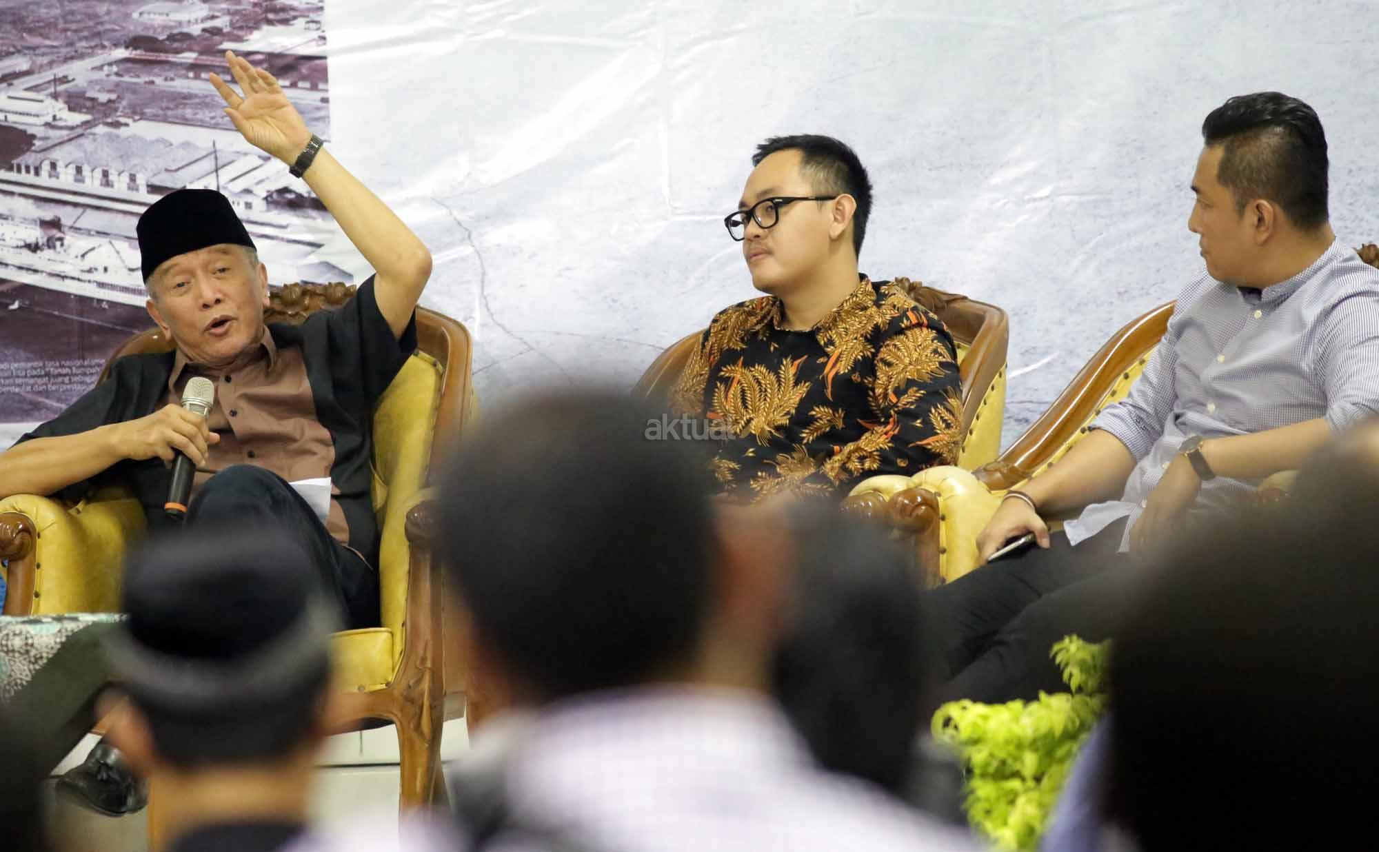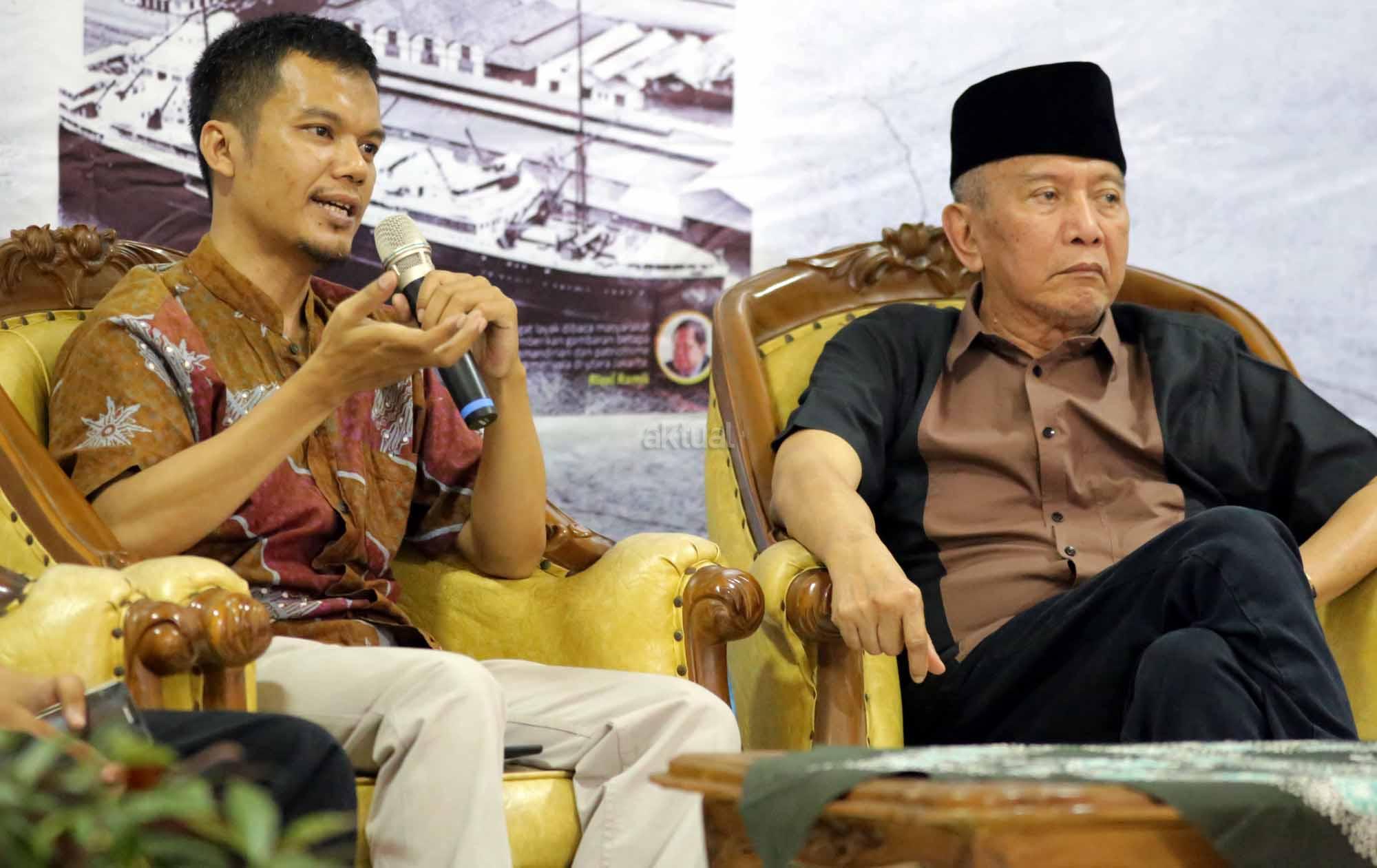 Penulis Buku Melawan Konspirasi Global di Teluk Jakarta Md Aminudin, dan Mantan Mensesneg Bondan Gunawan, saat peluncuran buku Melawan Konspirasi Global di Teluk Jakarta dan diskusi kebangsaan Berdikari untuk Indonesia di Museum Kebangkitan Nasional, Jakarta, Kamis (31/5/18). Buku tersebut menceritakan sebuah konspirasi global yang bertabrakan dengan semangat berdikari sekaligus perwujudan Nawacita dalam pengelolaan gerbang ekonomi Indonesia yakni terminal petikemas JICT dan TPK Koja, Jakarta Utara. Hampir 20 tahun JICT dan TPK Koja banyak kemajuan dan terobosan yang dilakukan para pekerja, demi mendukung pertumbuhan ekonomi Indonesia. Namun, pengelolaan kedua pelabuhan ini akan dilanjutkan kembali dengan Hutchison Port milik taipan Hong Kong Li Ka Shing. AKTUAL/Tino Oktaviano