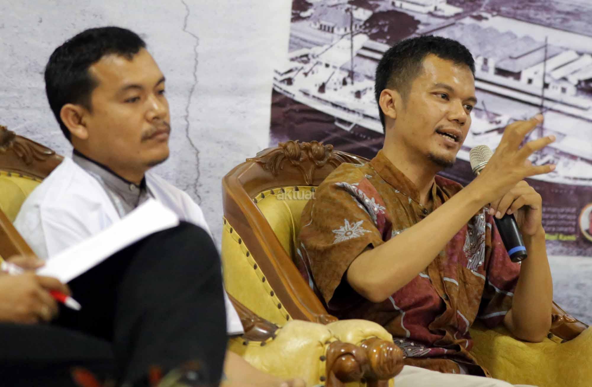 Peneliti Indef Bima Yudstira dan Ketua Federasi Pekerja Pelabuhan Indonesia (FPPI) Nova Sofyan Hakim saat peluncuran buku Melawan Konspirasi Global di Teluk Jakarta dan diskusi kebangsaan Berdikari untuk Indonesia di Museum Kebangkitan Nasional, Jakarta, Kamis (31/5/18). Buku tersebut menceritakan sebuah konspirasi global yang bertabrakan dengan semangat berdikari sekaligus perwujudan Nawacita dalam pengelolaan gerbang ekonomi Indonesia yakni terminal petikemas JICT dan TPK Koja, Jakarta Utara. Hampir 20 tahun JICT dan TPK Koja banyak kemajuan dan terobosan yang dilakukan para pekerja, demi mendukung pertumbuhan ekonomi Indonesia. Namun, pengelolaan kedua pelabuhan ini akan dilanjutkan kembali dengan Hutchison Port milik taipan Hong Kong Li Ka Shing. AKTUAL/Tino Oktaviano