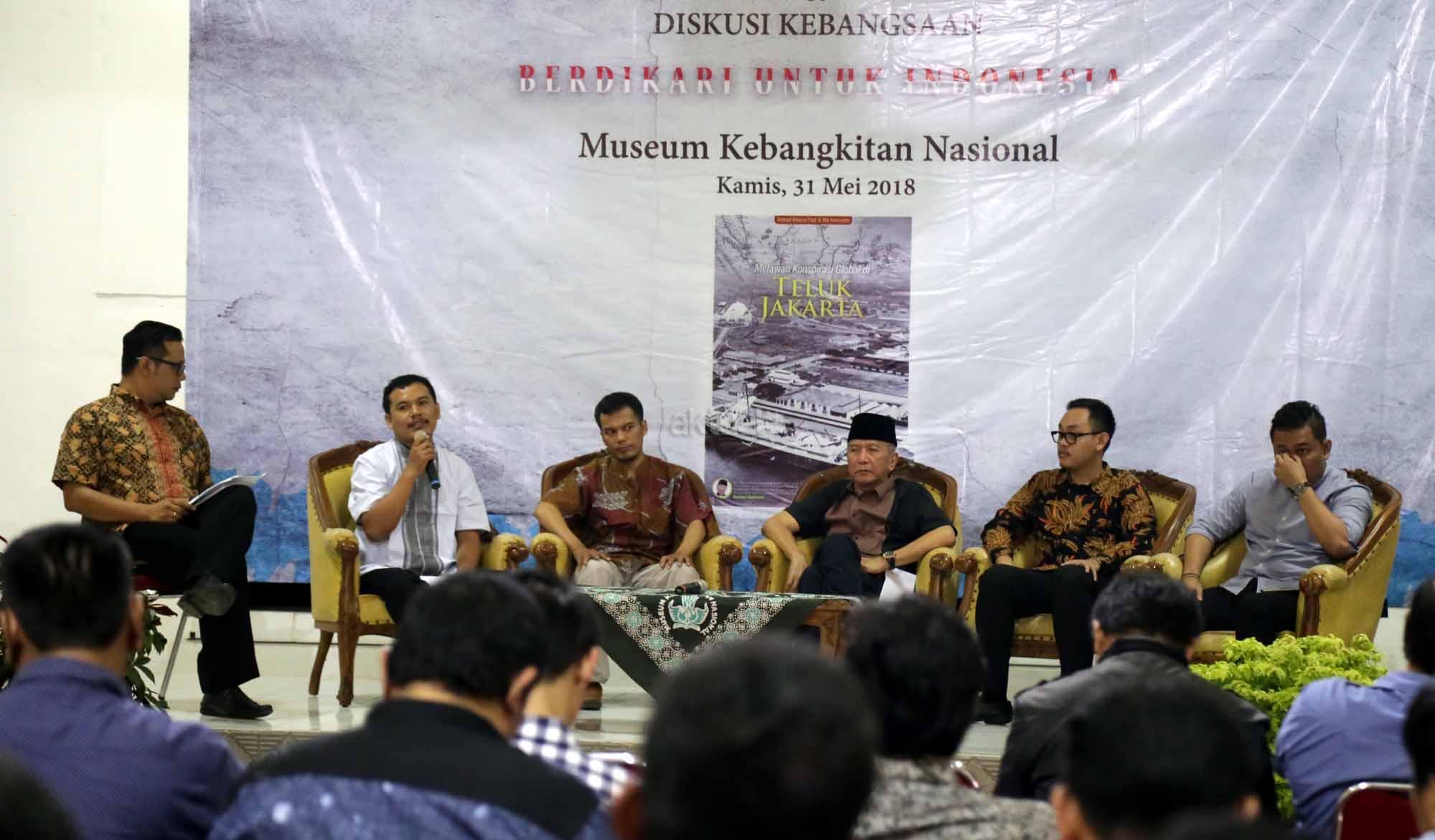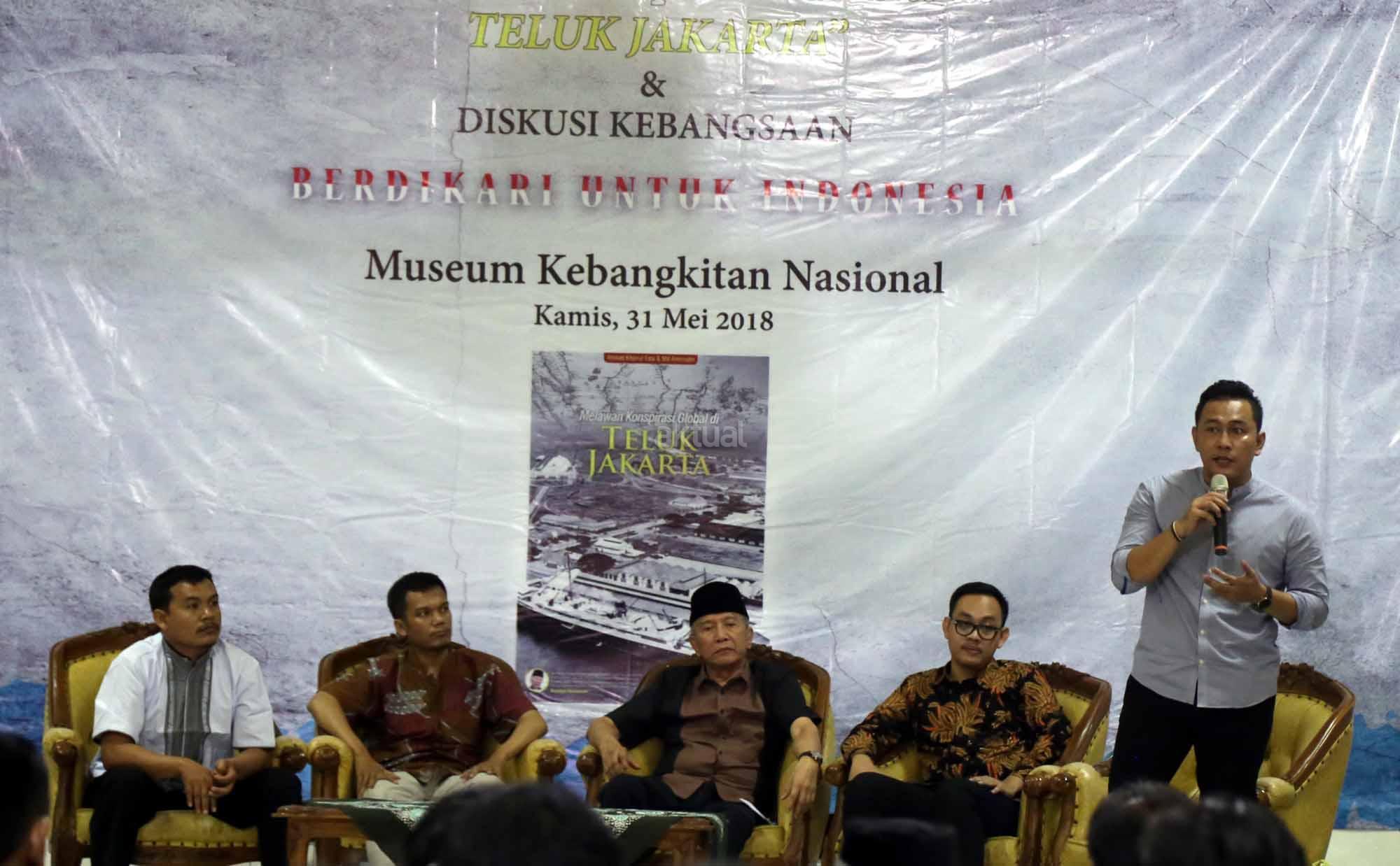 Mantan Mensesneg Bondan Gunawan, Peneliti Indef Bima Yudstira dan Ketua Federasi Pekerja Pelabuhan Indonesia (FPPI) Nova Sofyan Hakim saat peluncuran buku Melawan Konspirasi Global di Teluk Jakarta dan diskusi kebangsaan Berdikari untuk Indonesia di Museum Kebangkitan Nasional, Jakarta, Kamis (31/5/18). Buku tersebut menceritakan sebuah konspirasi global yang bertabrakan dengan semangat berdikari sekaligus perwujudan Nawacita dalam pengelolaan gerbang ekonomi Indonesia yakni terminal petikemas JICT dan TPK Koja, Jakarta Utara. Hampir 20 tahun JICT dan TPK Koja banyak kemajuan dan terobosan yang dilakukan para pekerja, demi mendukung pertumbuhan ekonomi Indonesia. Namun, pengelolaan kedua pelabuhan ini akan dilanjutkan kembali dengan Hutchison Port milik taipan Hong Kong Li Ka Shing. AKTUAL/Tino Oktaviano