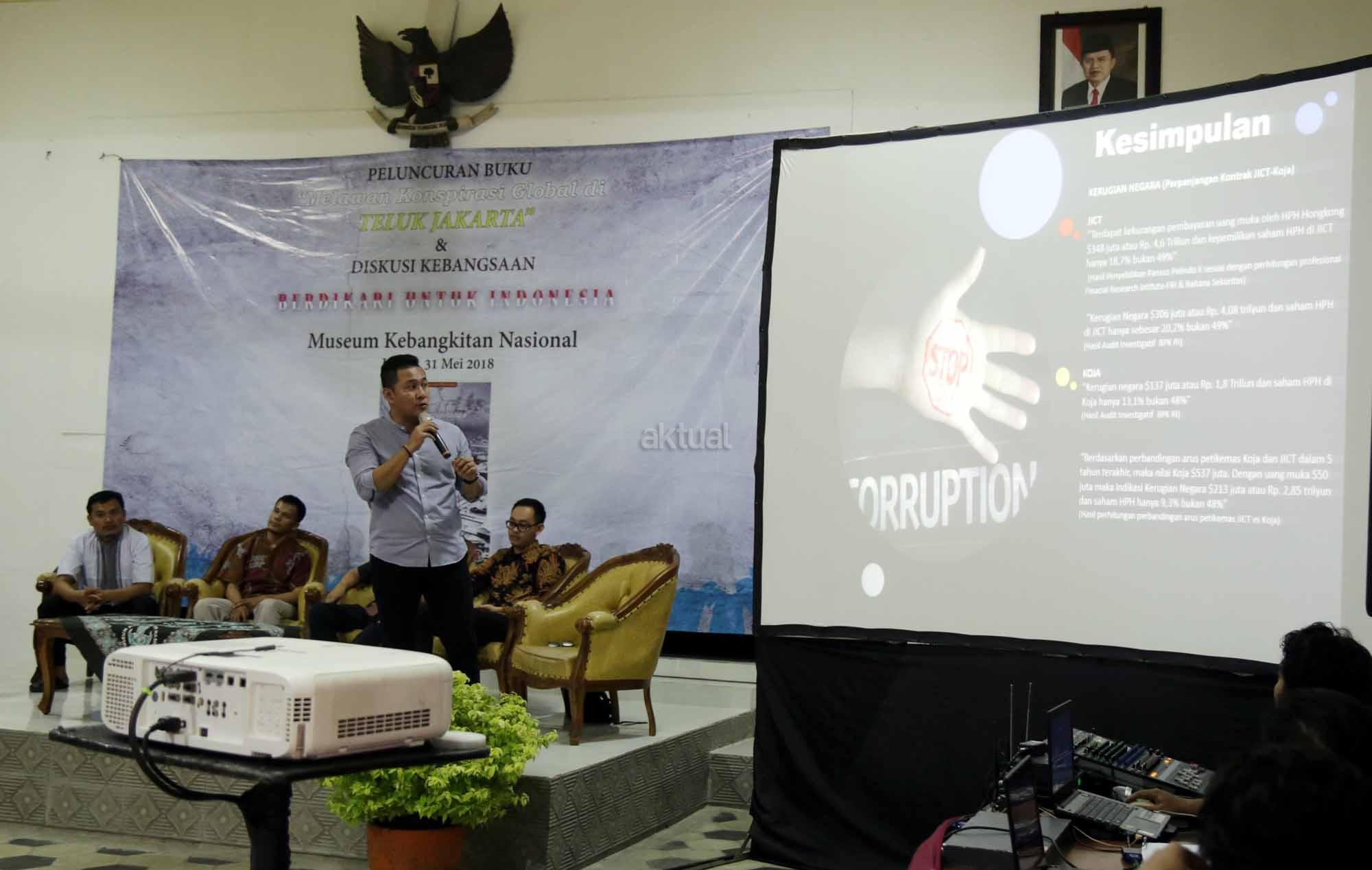 Ketua Federasi Pekerja Pelabuhan Indonesia (FPPI) Nova Sofyan Hakim saat membeberkan ada konspirasi global kuasai JICT & TPK Koja saat peluncuran buku Melawan Konspirasi Global di Teluk Jakarta dan diskusi kebangsaan Berdikari untuk Indonesia di Museum Kebangkitan Nasional, Jakarta, Kamis (31/5/18). Buku tersebut menceritakan sebuah konspirasi global yang bertabrakan dengan semangat berdikari sekaligus perwujudan Nawacita dalam pengelolaan gerbang ekonomi Indonesia yakni terminal petikemas JICT dan TPK Koja, Jakarta Utara. Hampir 20 tahun JICT dan TPK Koja banyak kemajuan dan terobosan yang dilakukan para pekerja, demi mendukung pertumbuhan ekonomi Indonesia. Namun, pengelolaan kedua pelabuhan ini akan dilanjutkan kembali dengan Hutchison Port milik taipan Hong Kong Li Ka Shing. AKTUAL/Tino Oktaviano