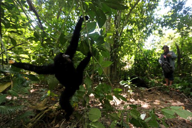 Petugas Balai Konservasi Sumber Daya Alam (BKSDA) Aceh melepas liar seekor Siamang (Symphalangus syndactylus) dan Binturong (Arctictis binturong) yang disita dari masyarakat ke habitatnya di kawasan hutan Aceh Jaya, Aceh, Sabtu (11/6). BKSDA Aceh melepas liar kembali empat ekor satwa langka dan dilindungi yakni Binturung, Siamang, Owa Sumatra dan Beruang Madu hasil sitaan yang telah direhabilitasi selama dua tahun lebih. ANTARA FOTO/Irwansyah Putra/foc/16.