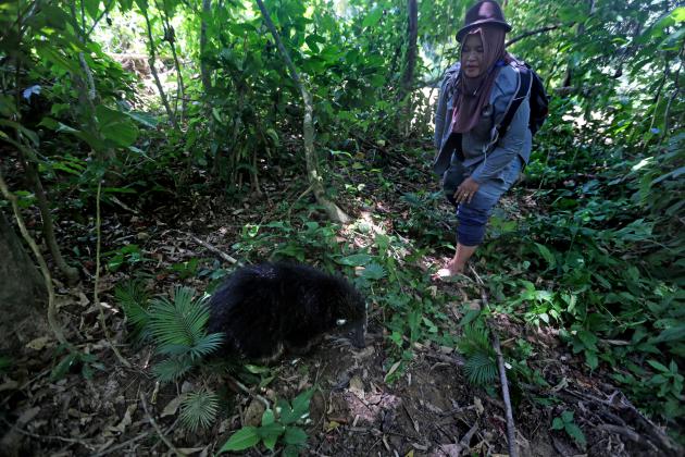 Petugas Balai Konservasi Sumber Daya Alam (BKSDA) Aceh melepas kembali seekor Binturung (Arctictis binturong) yang disita dari masyarakat ke habitatnya di kawasan hutan Aceh Jaya, Aceh, Sabtu (11/6). BKSDA Aceh melepas liar kembali empat ekor satwa langka dan dilindungi yakni Binturung, Siamang, Owa Sumatra dan Beruang Madu hasil sitaan yang telah direhabilitasi selama dua tahun lebih. ANTARA FOTO/Irwansyah Putra/foc/16.
